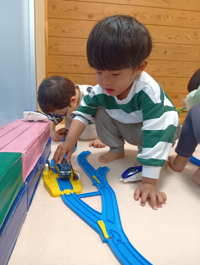 コーナーが出来るまでプラレールで遊びました🚃遊びの中で「カンカンカン🎵博多駅~博多駅~」と車掌になっている子や線路を組み合わせてより長く繋げようとする子もいましたよ。