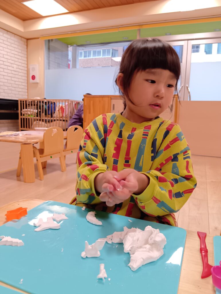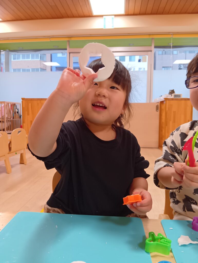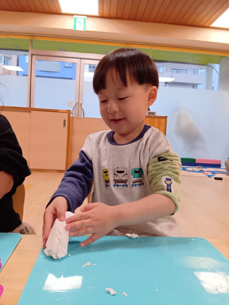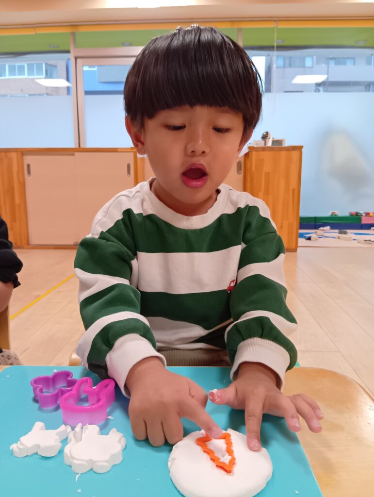 初めは気持ちのよい感触を楽しむ子どもたち。次第に思い思いに形作ったり、型抜きをしたりしていきます。