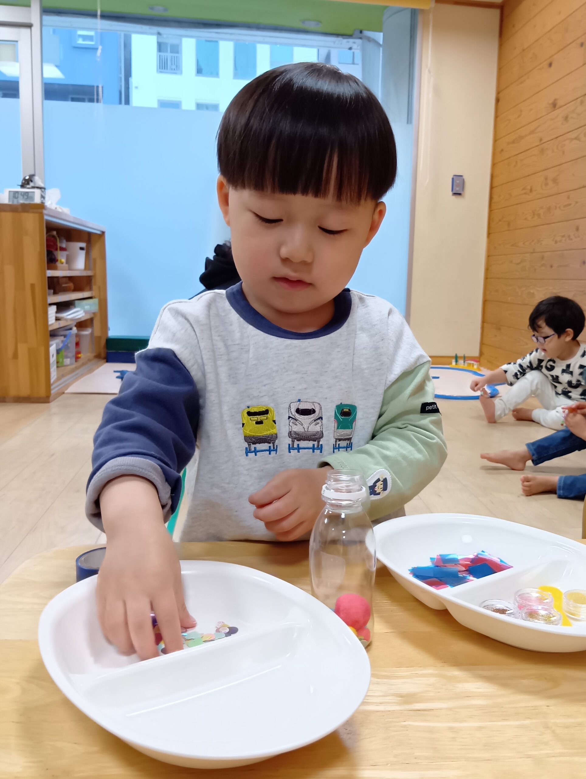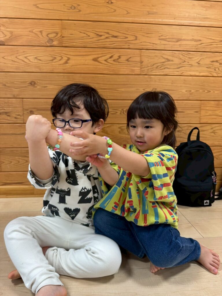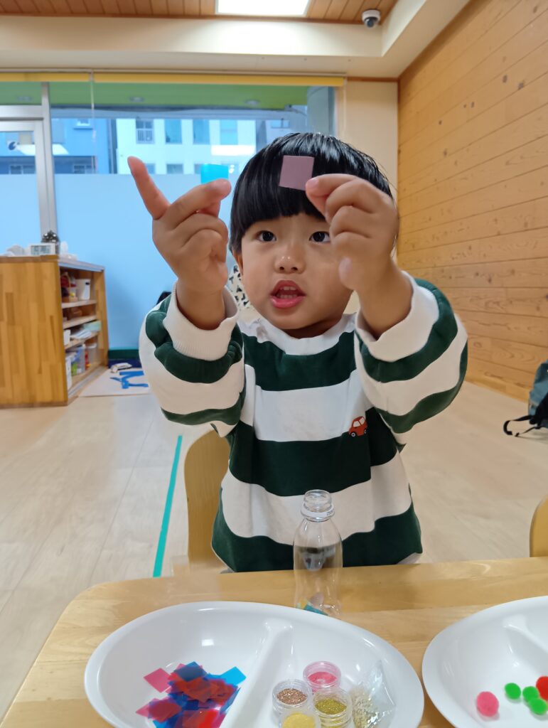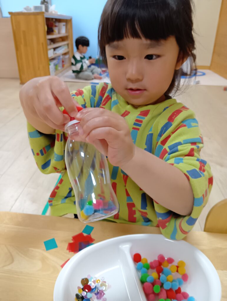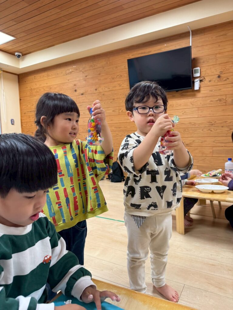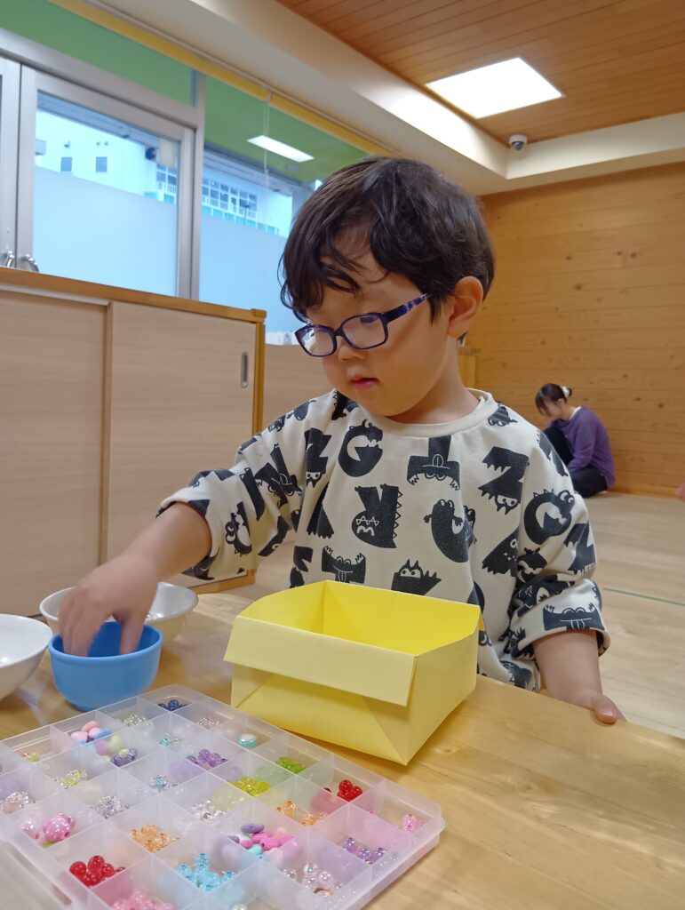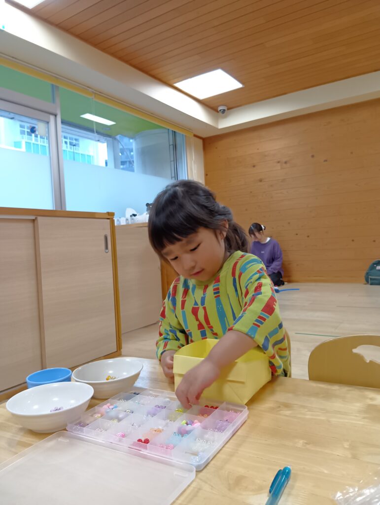 こちらも様々なキラキラ輝くビーズが⭐️ほしいものをえらび、「これも入れたい。」「これは真ん中くらいがいいな。」と保育者に伝えている子どもたちでした。
