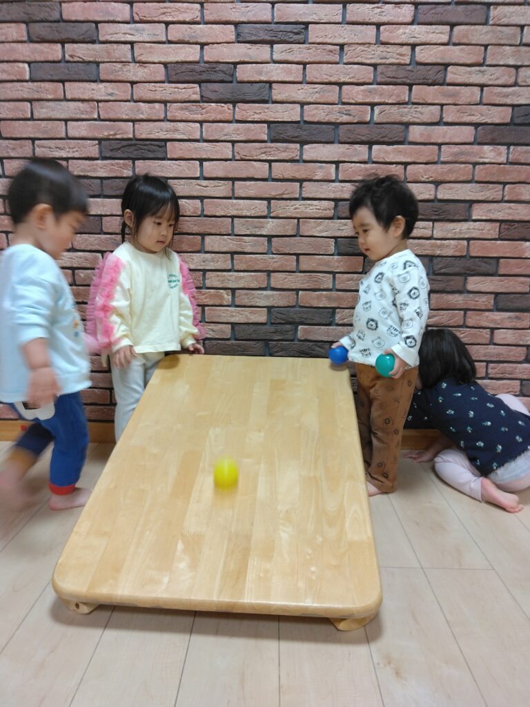 ボール遊びをしました。テーブルを斜めにして坂を作ると、「なんだこれ?」とやって来た子どもたち。