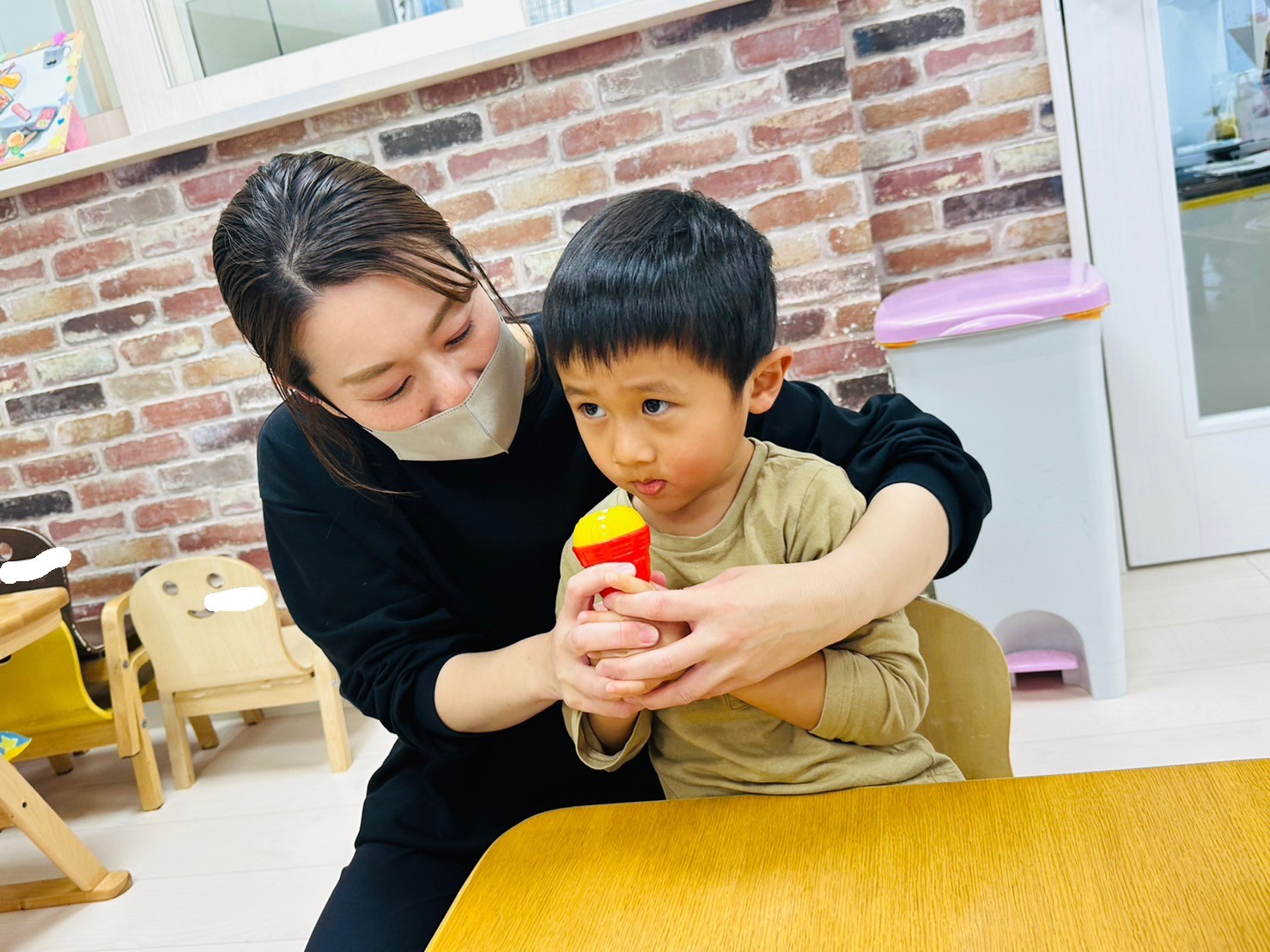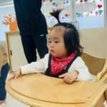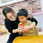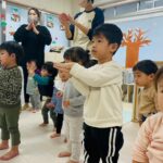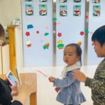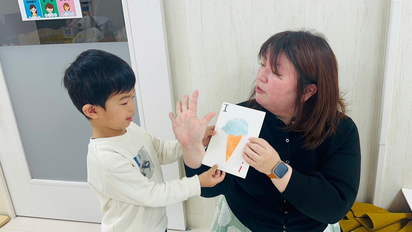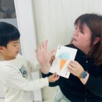 新しい英語の先生に少し緊張気味のお友だち👦