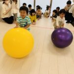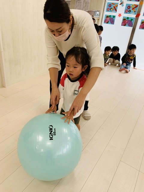 大玉転がしでは大きな大きなボールを真っ直ぐ転がし、コーナーを回って次のお友達にタッチ♥️