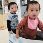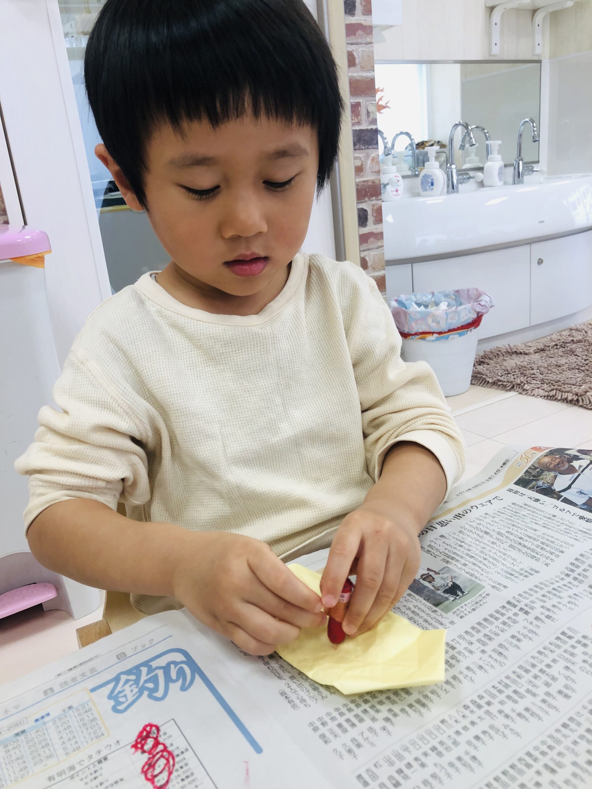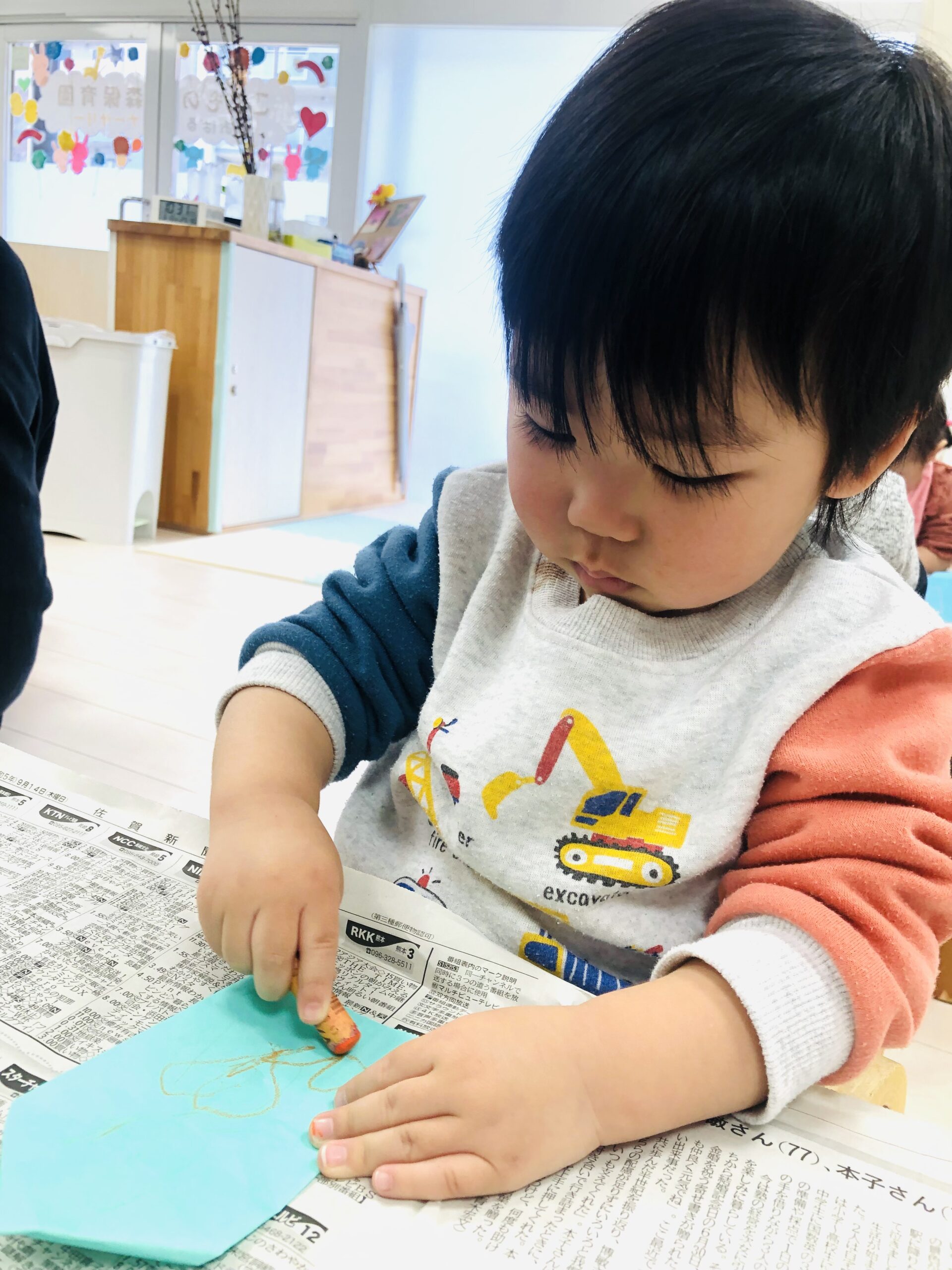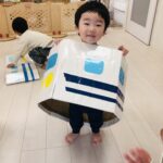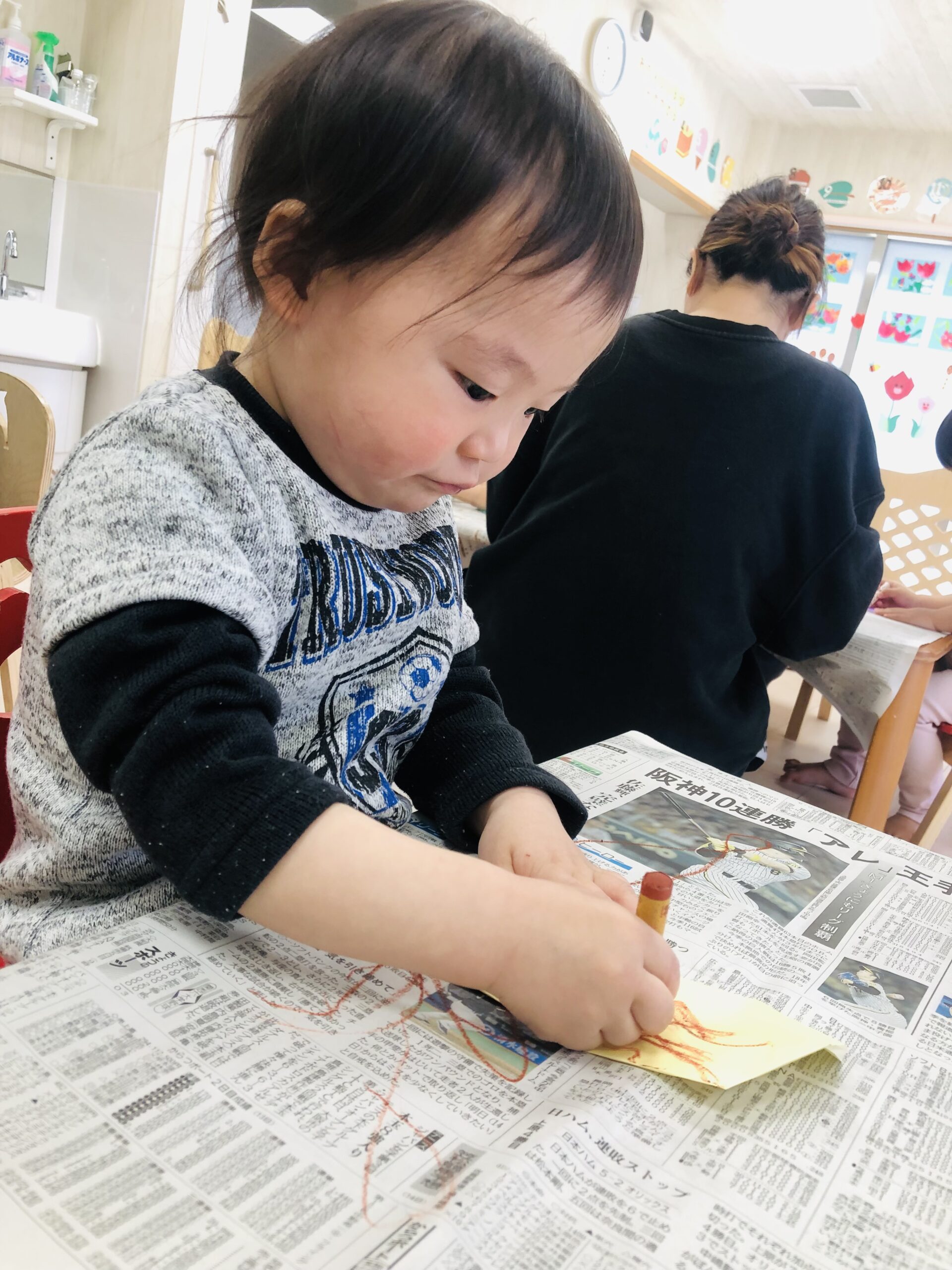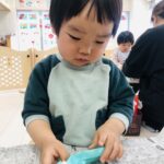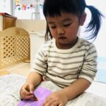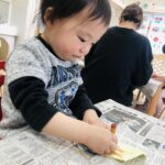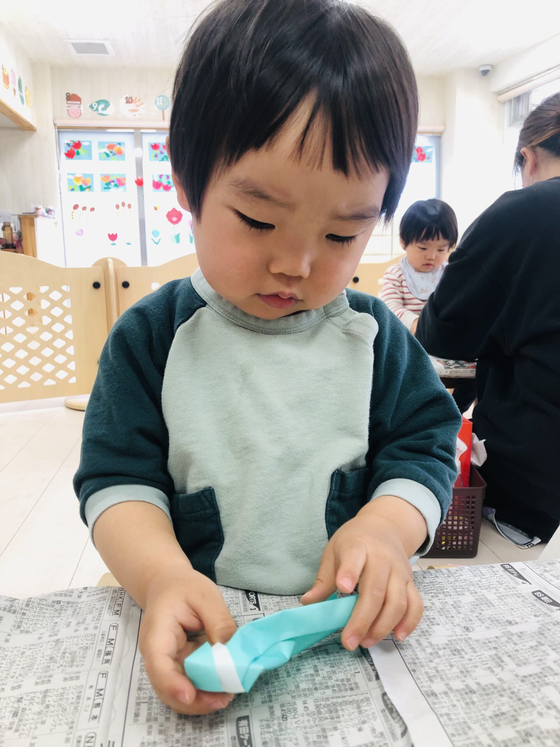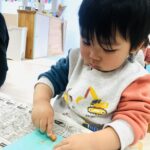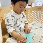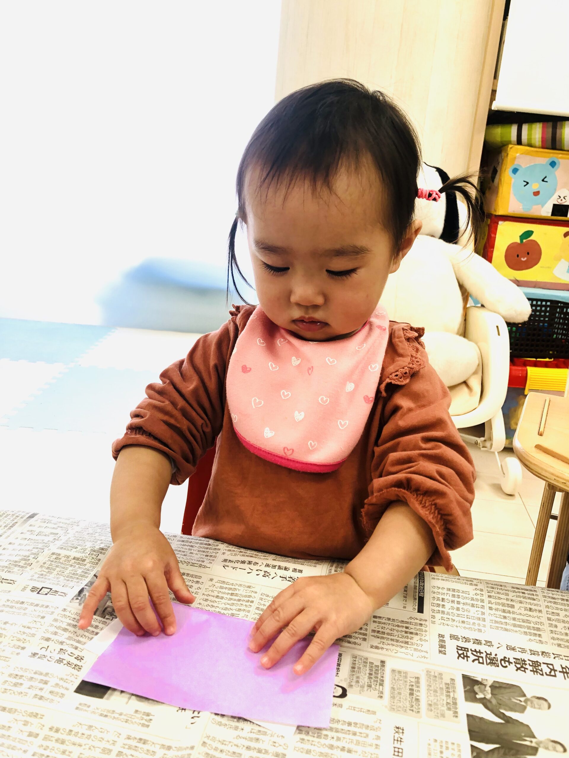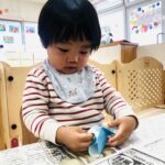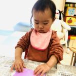 0.1歳児さんは、お部屋の中で折り紙で福岡タワーを作りました🗼