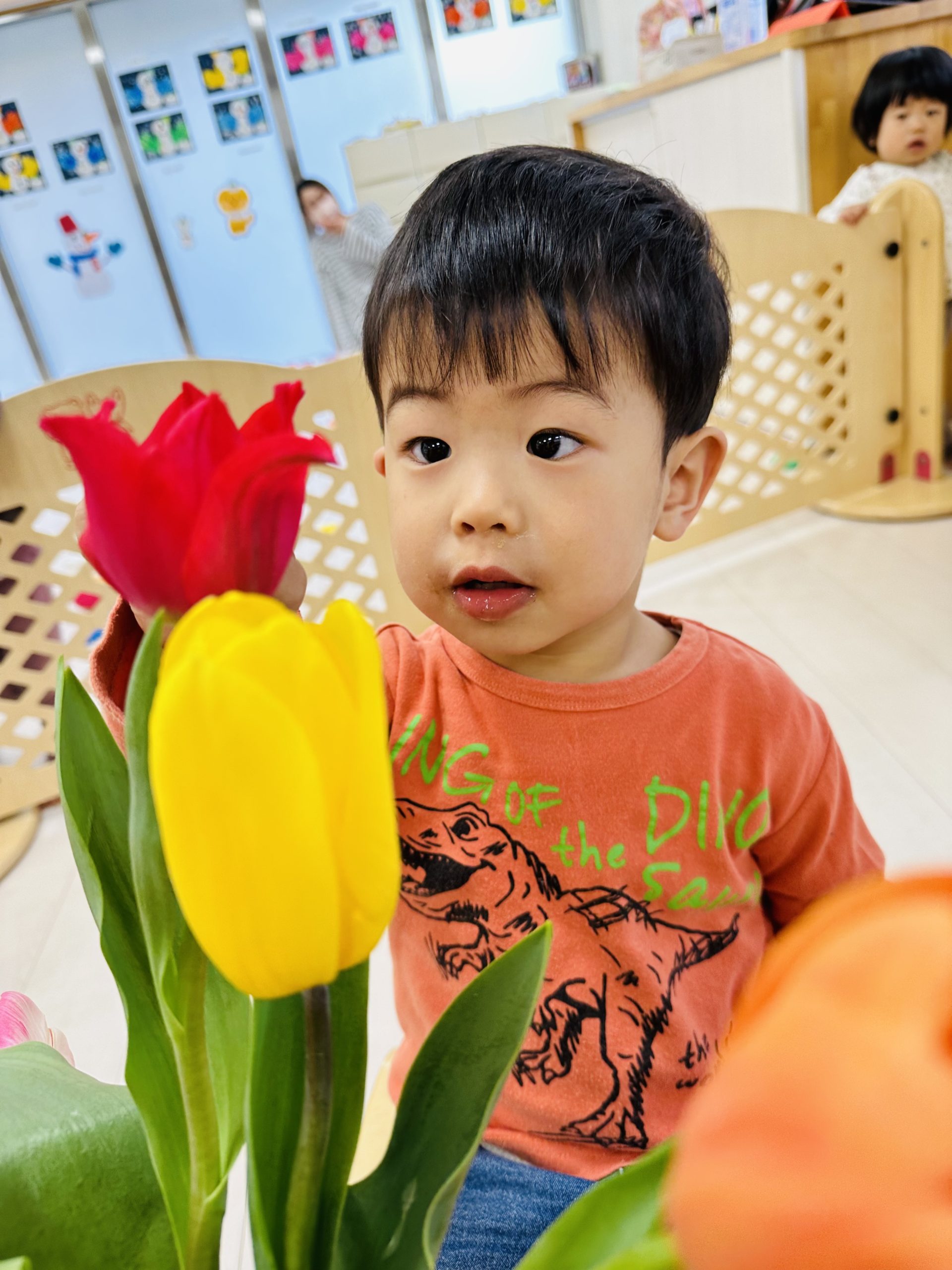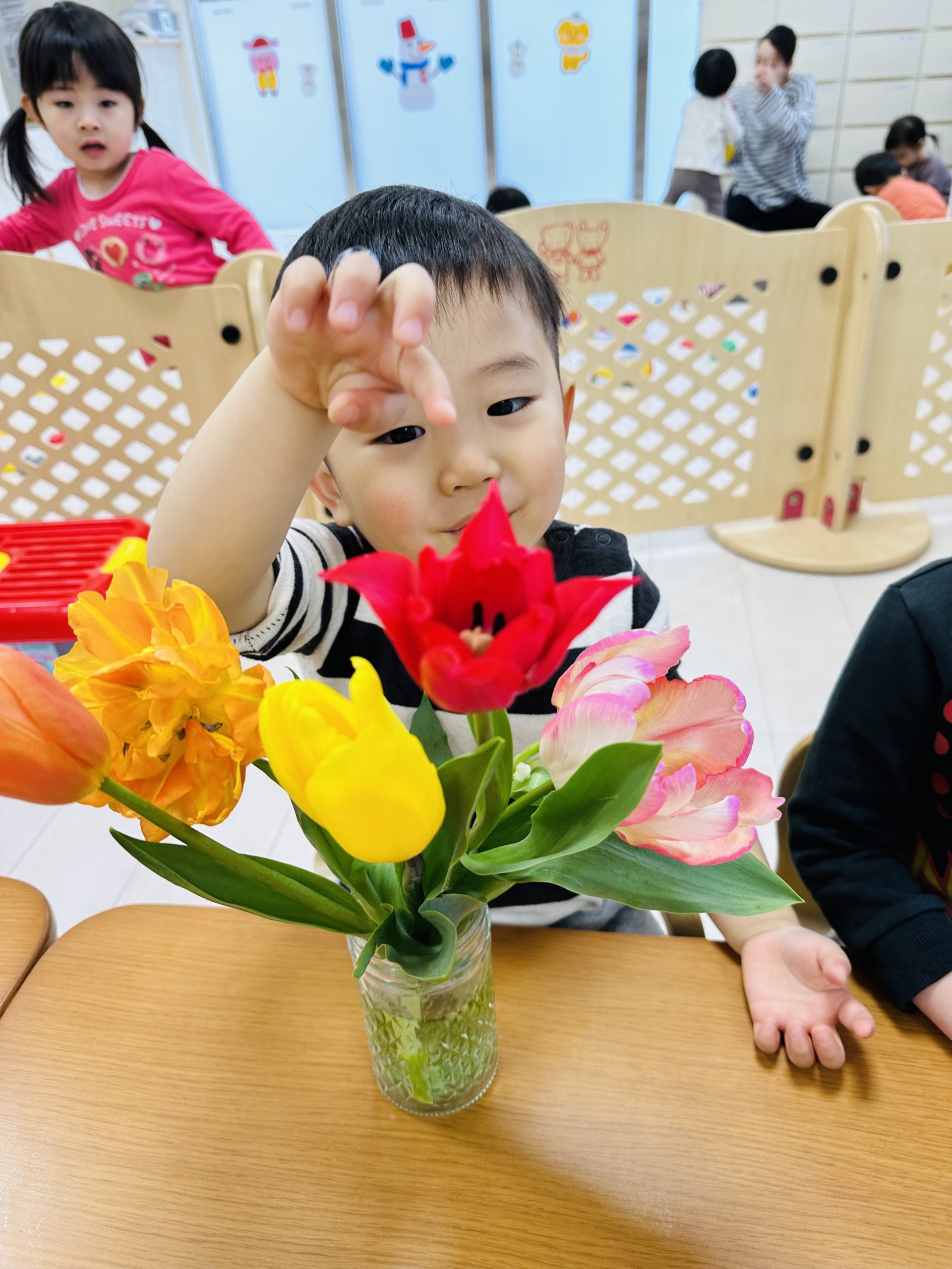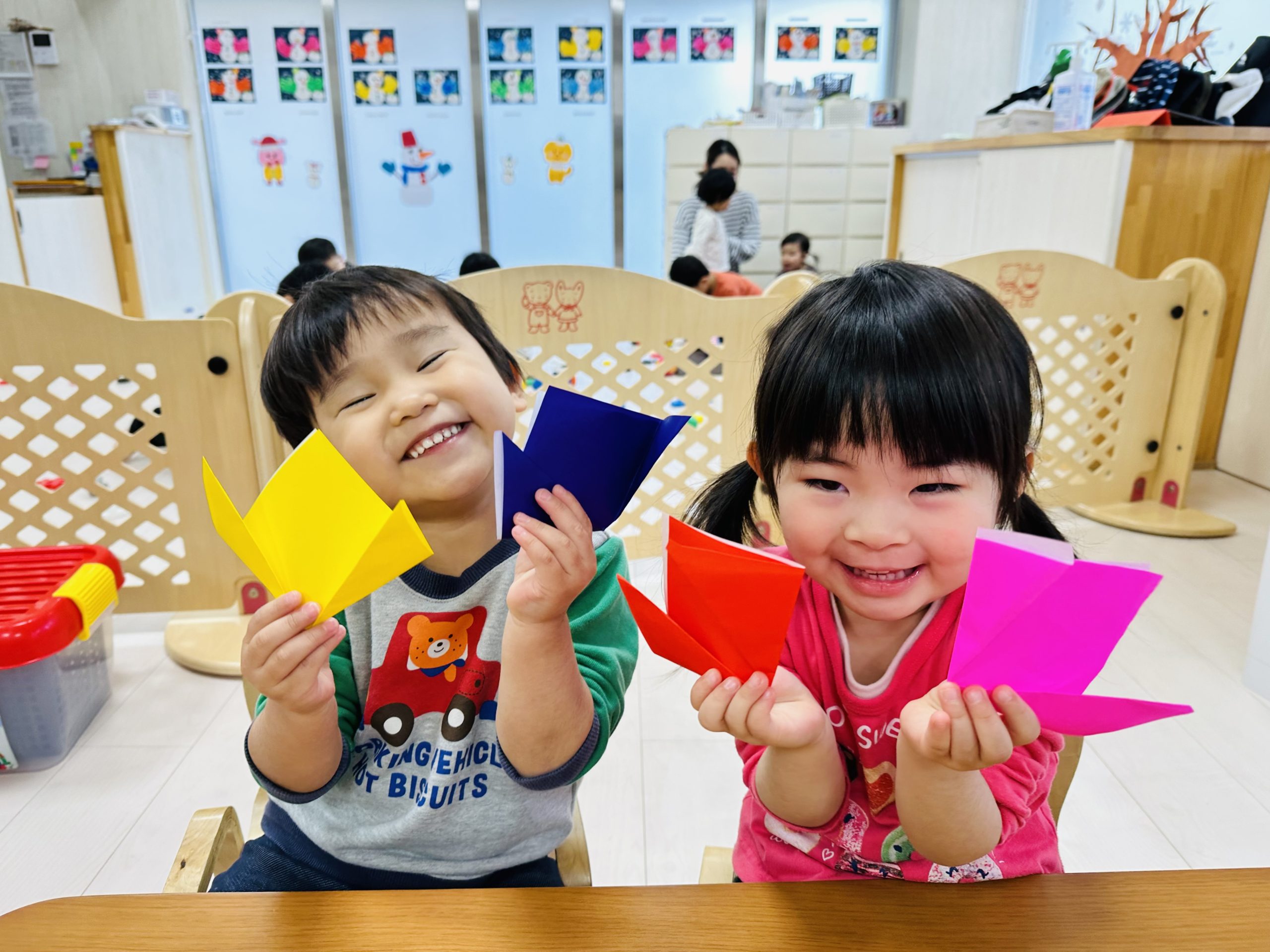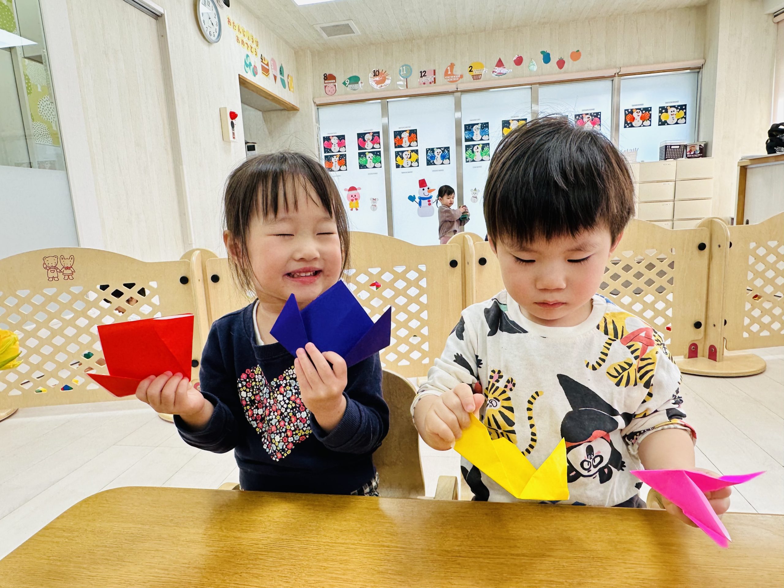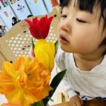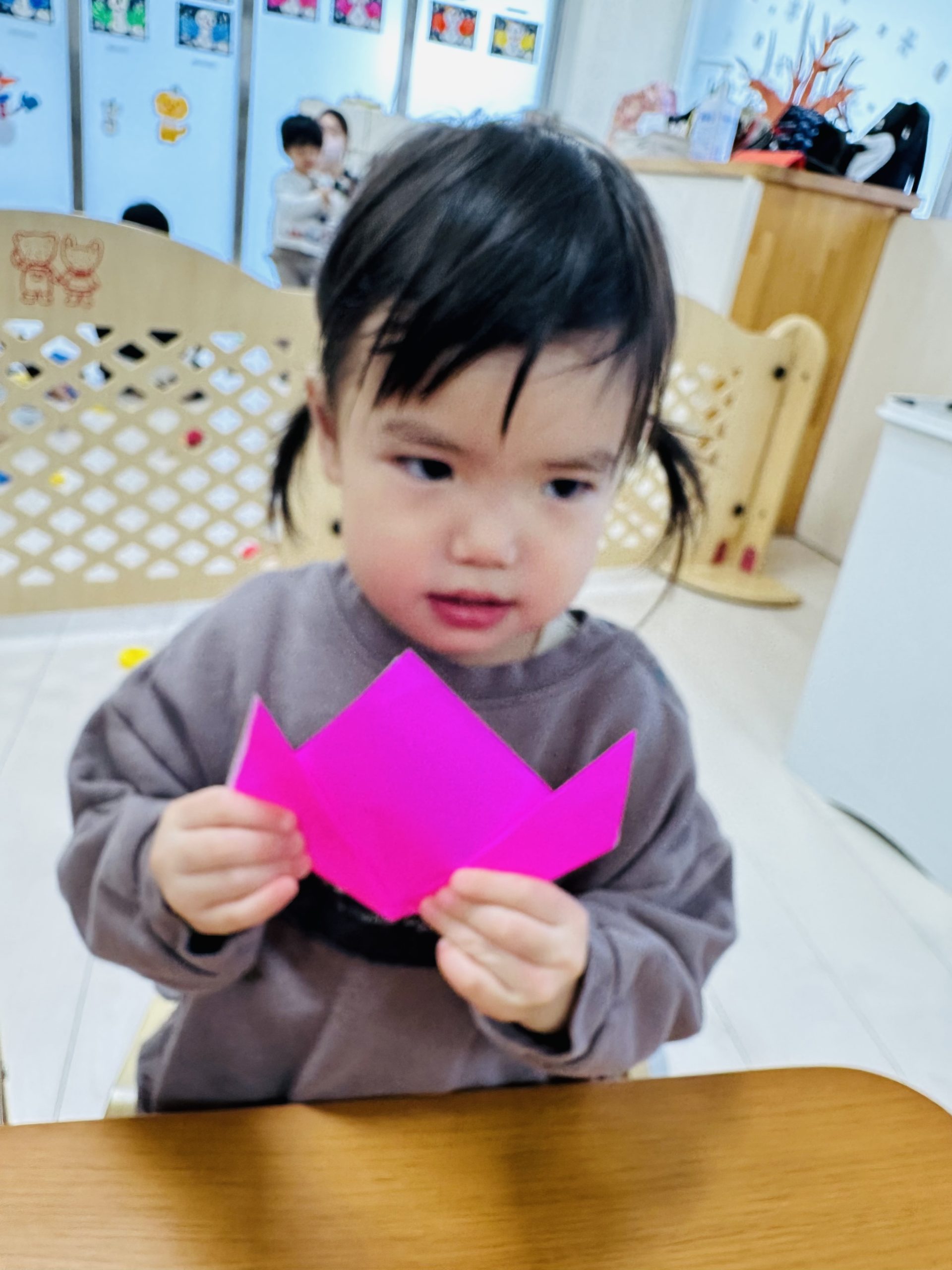 好きな色の折り紙を選び、チューリップを見ながら折りました(^^)