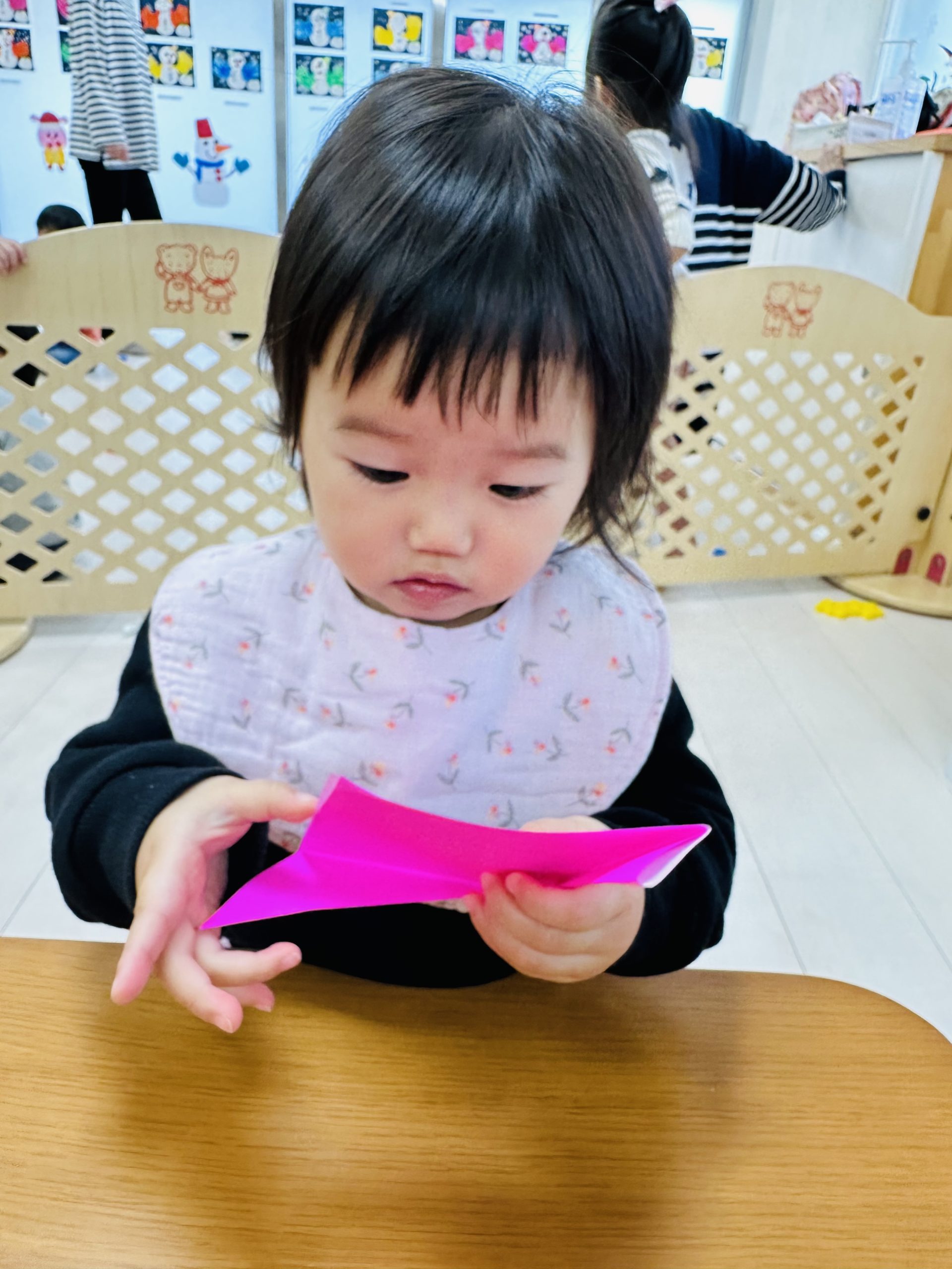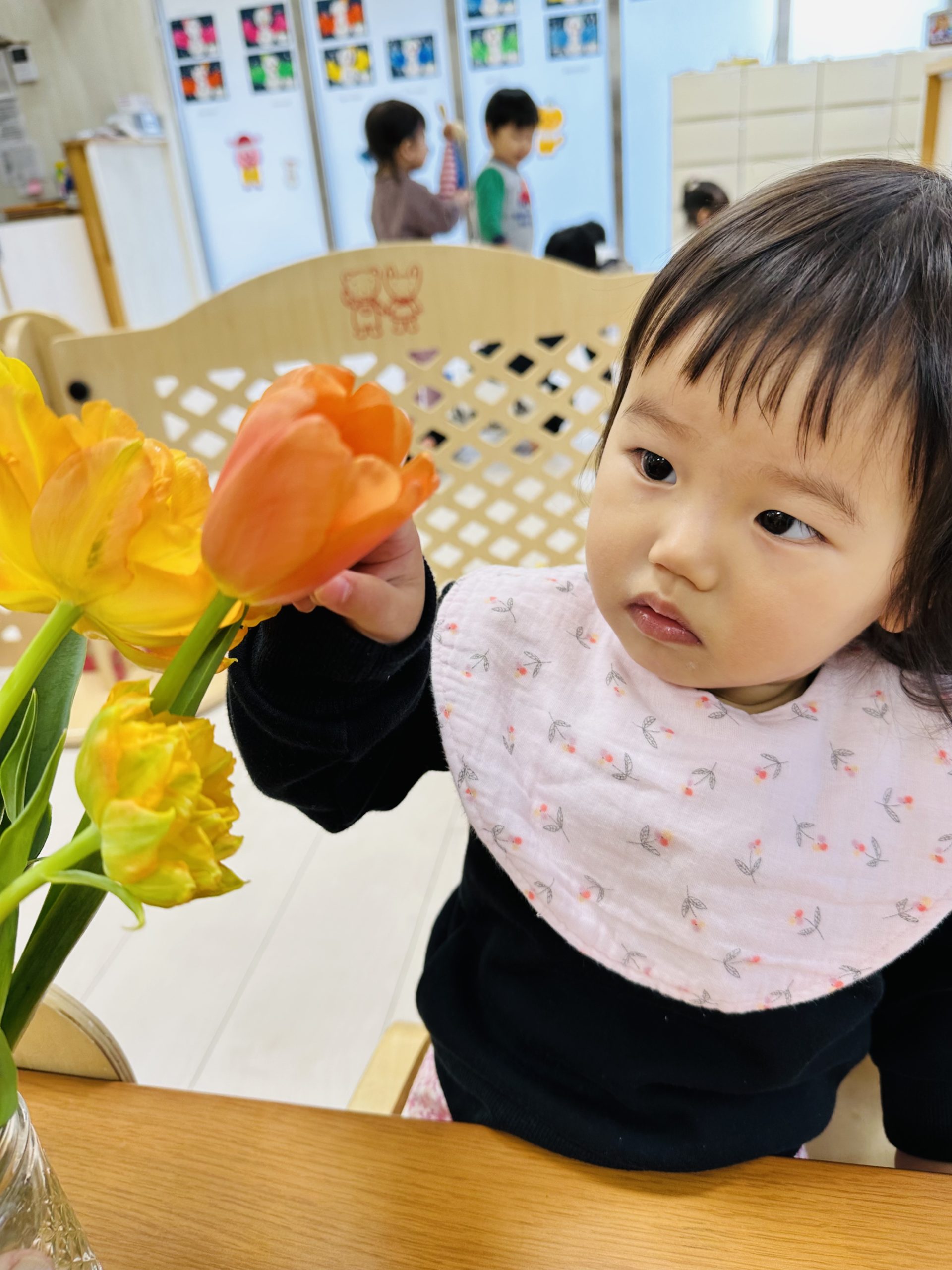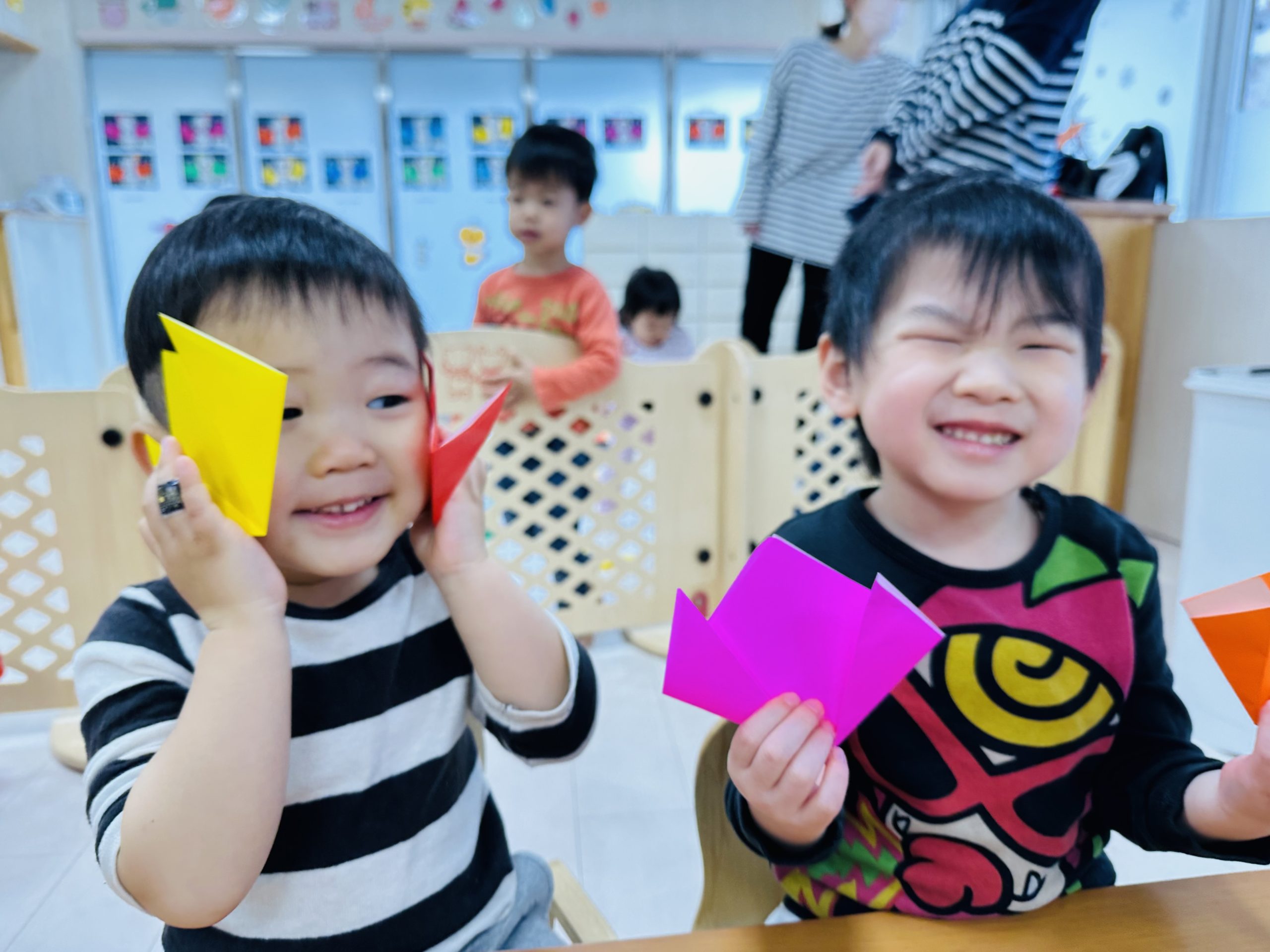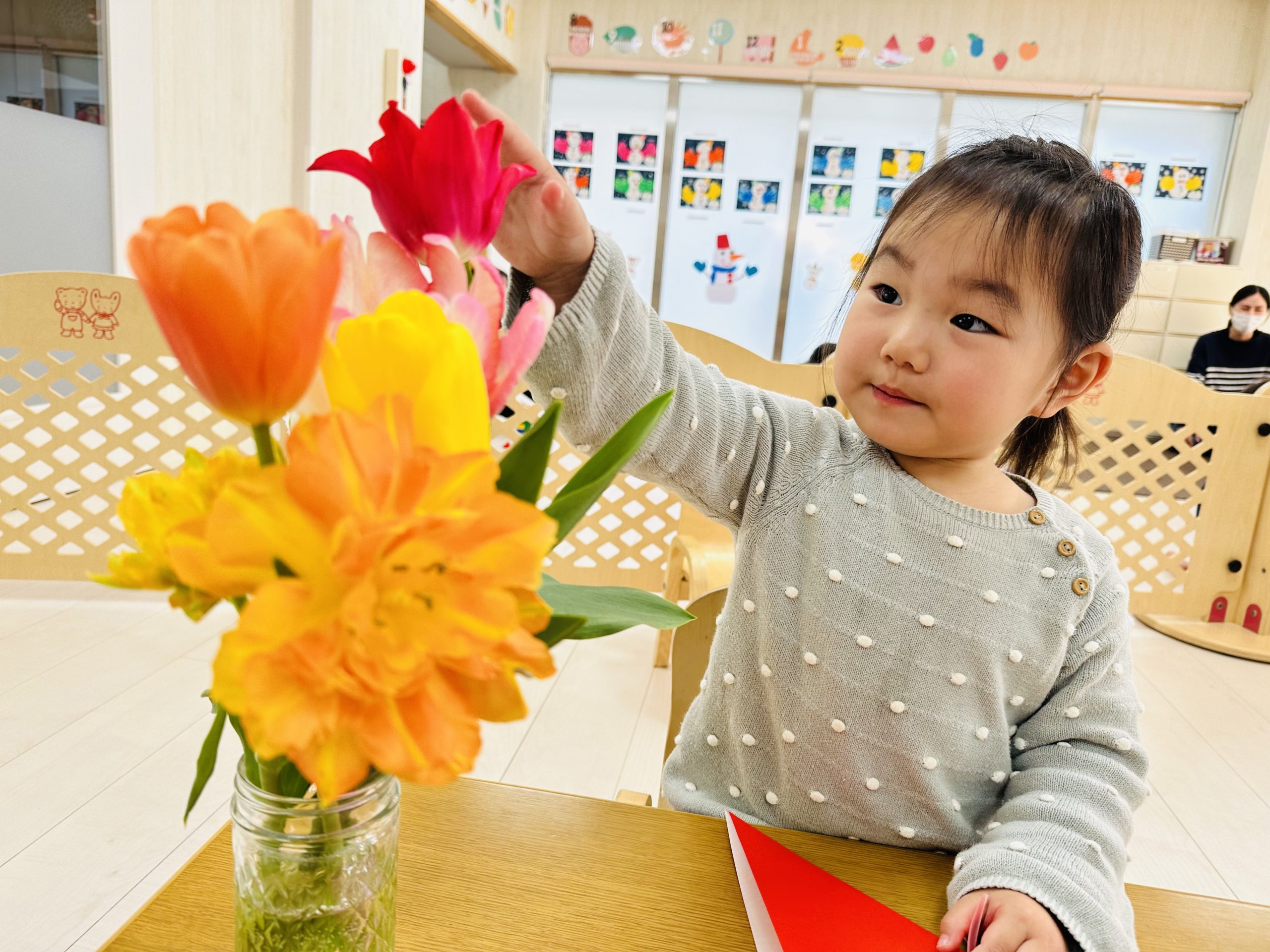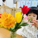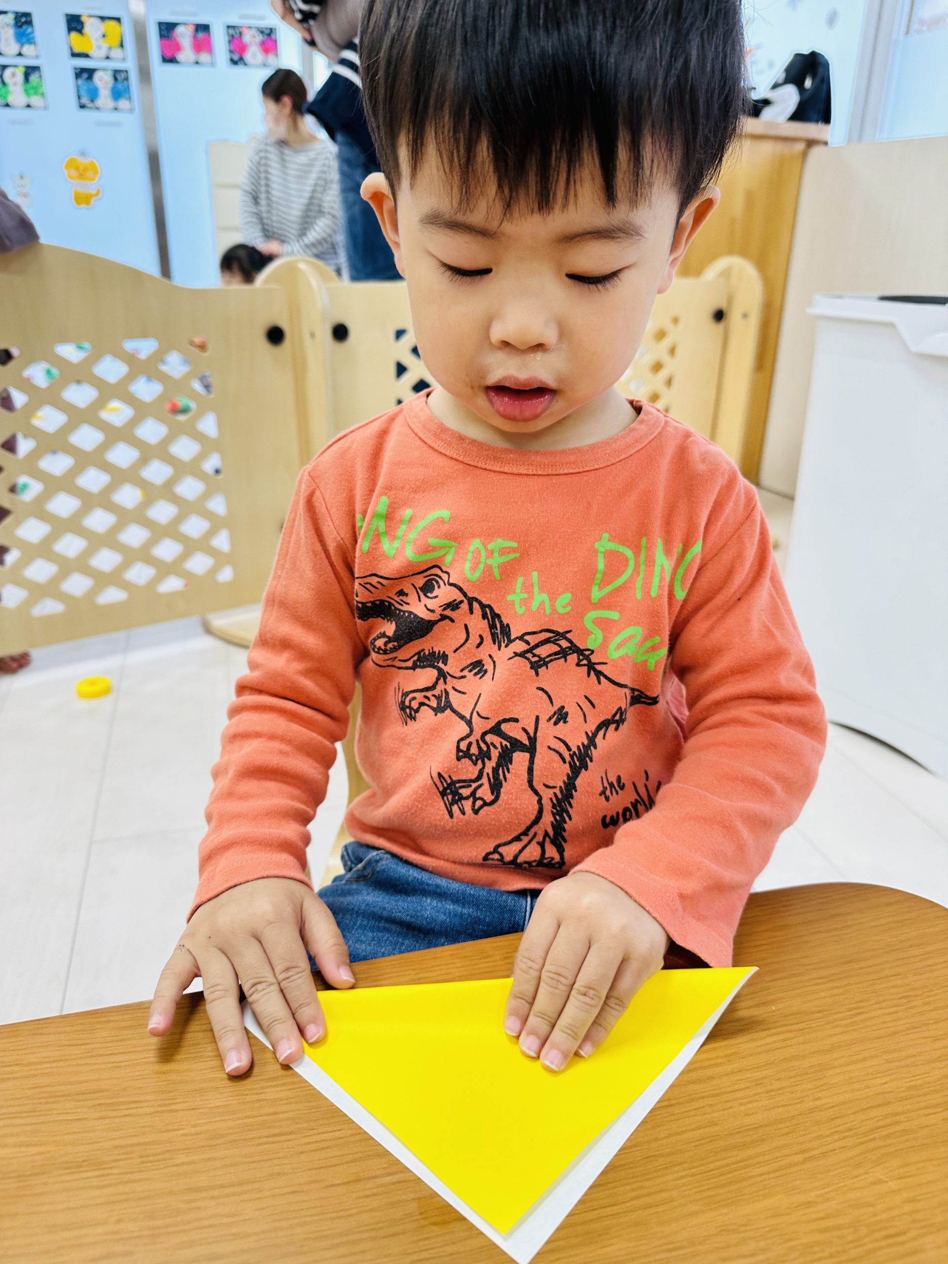 好きな色の折り紙を選び、チューリップを見ながら折りました(^^)