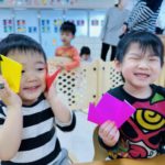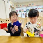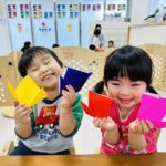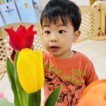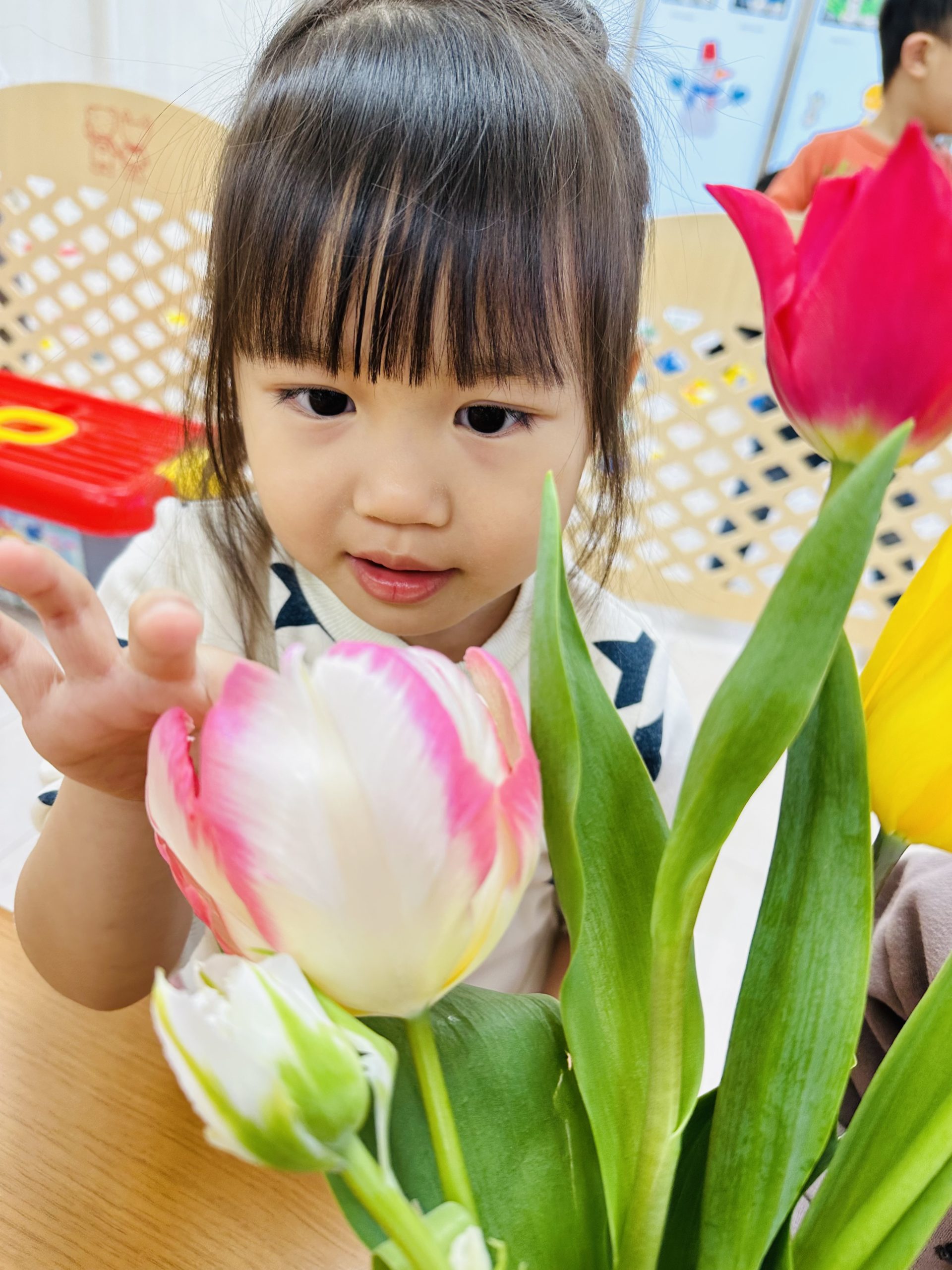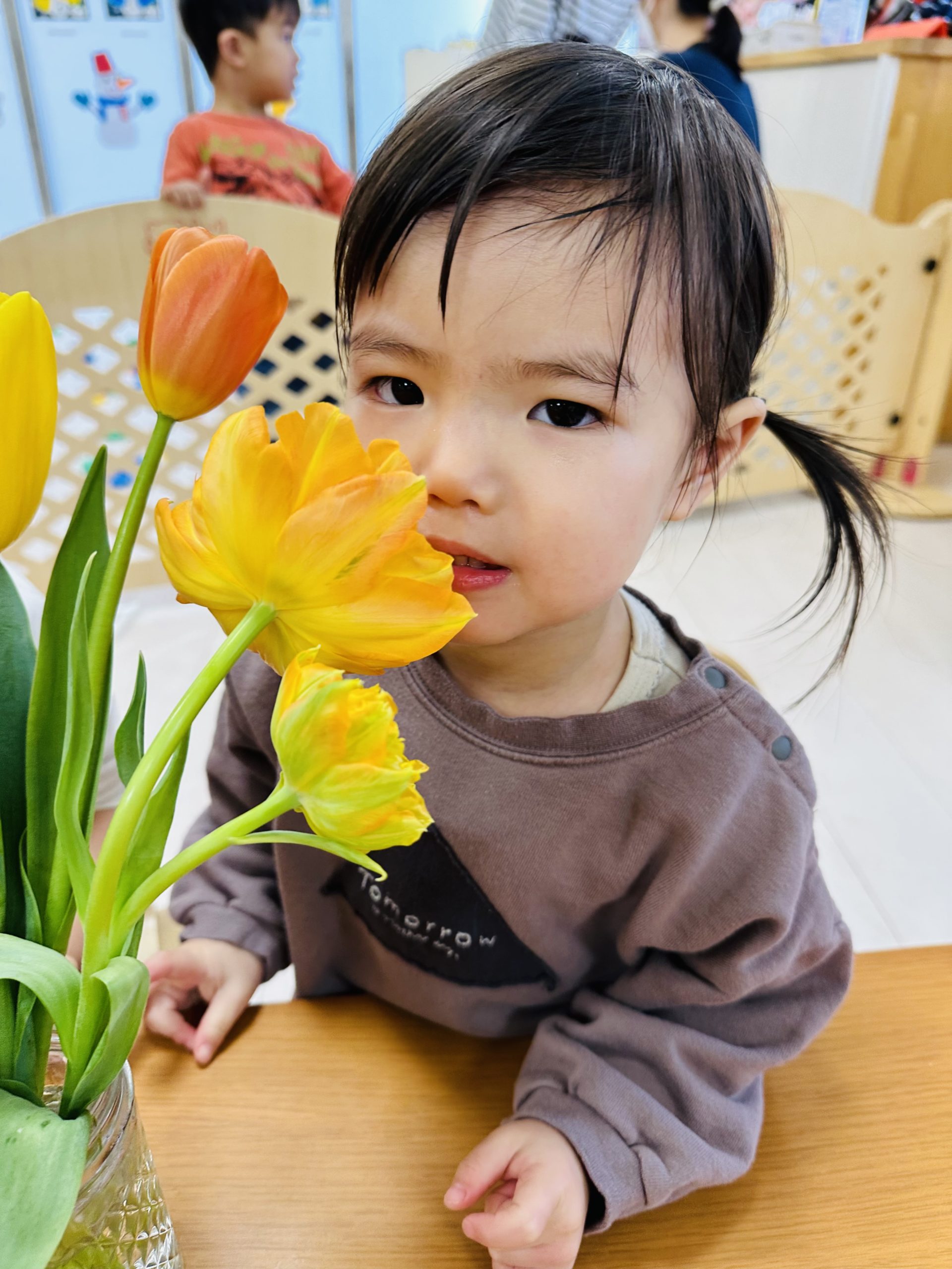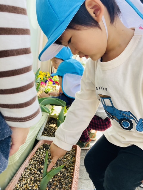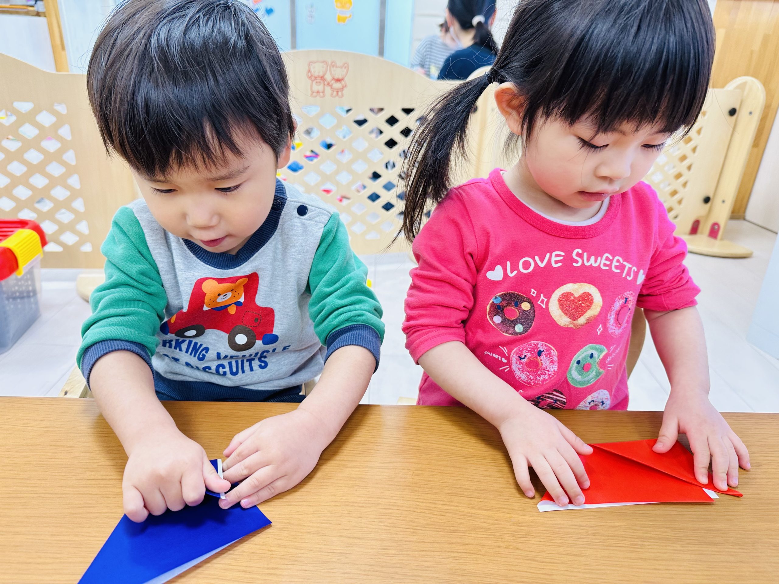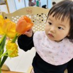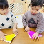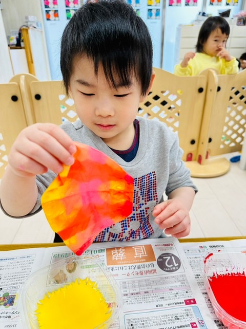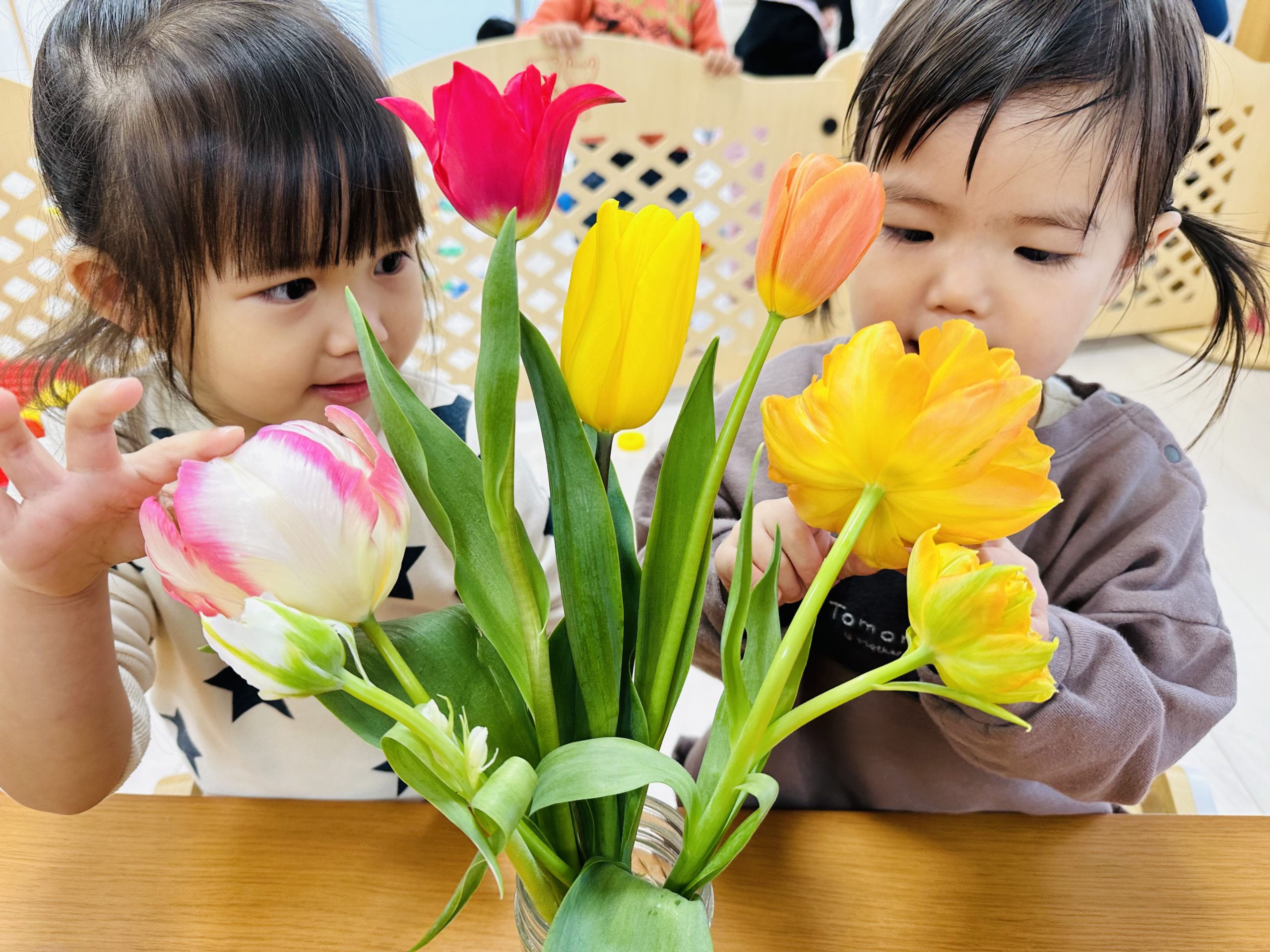 好きな色の折り紙を選び、チューリップを見ながら折りました(^^)