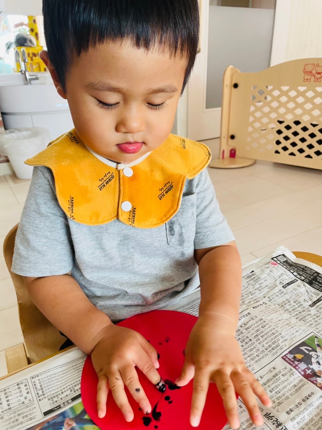 1歳児さんは指に絵の具を付けてスイカの種を描きました🍉