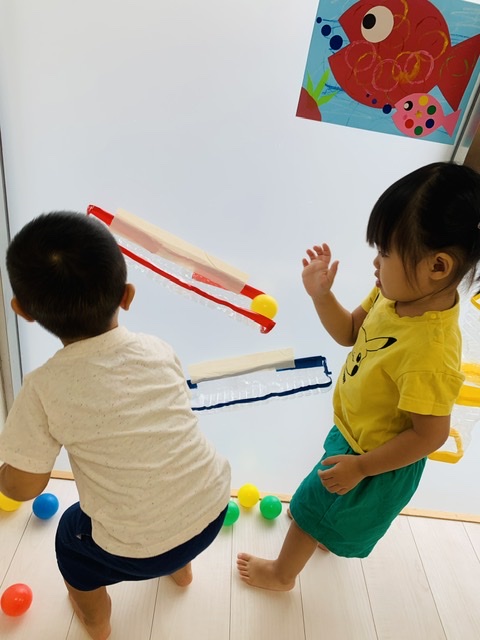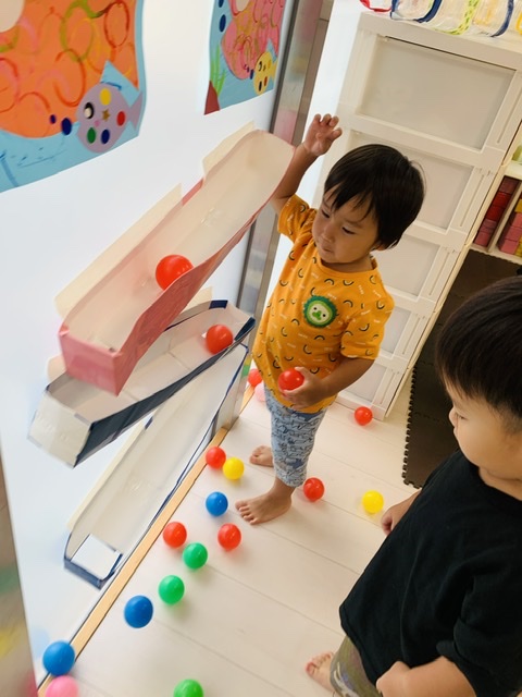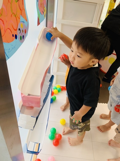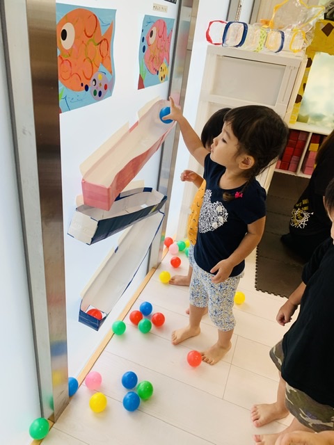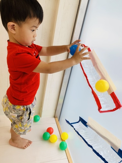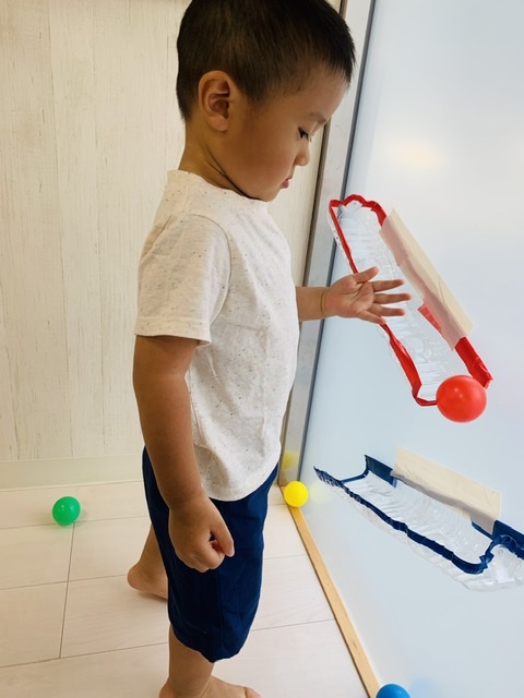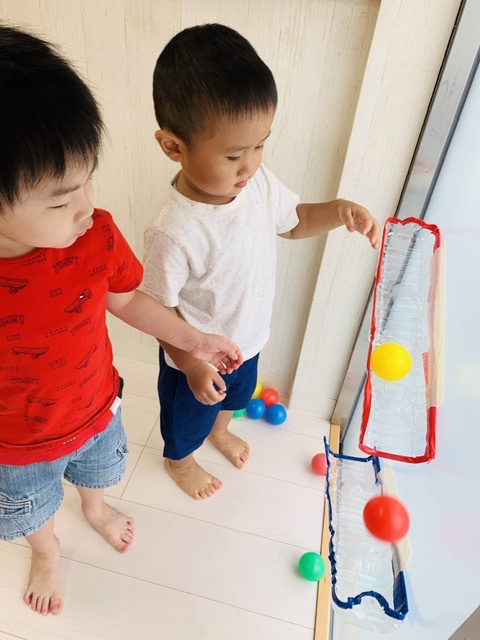 ペットボトルや牛乳パックで作ったボールの滑り台✨️ボールが下まで転がっていくのが楽しいね♡♡