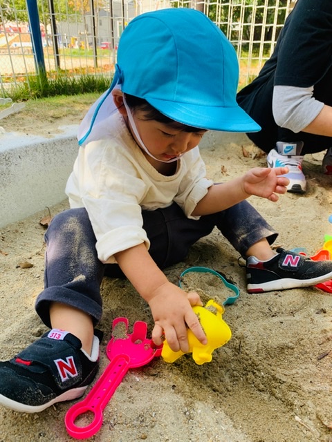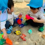 砂場でおもちゃなどを使って