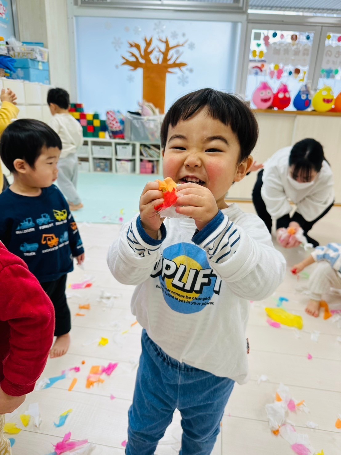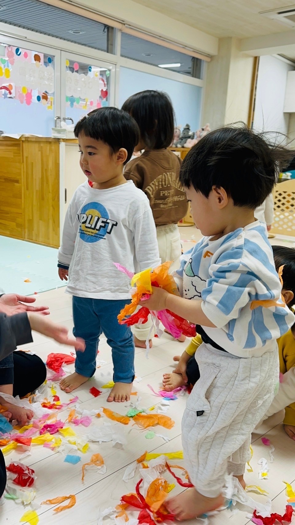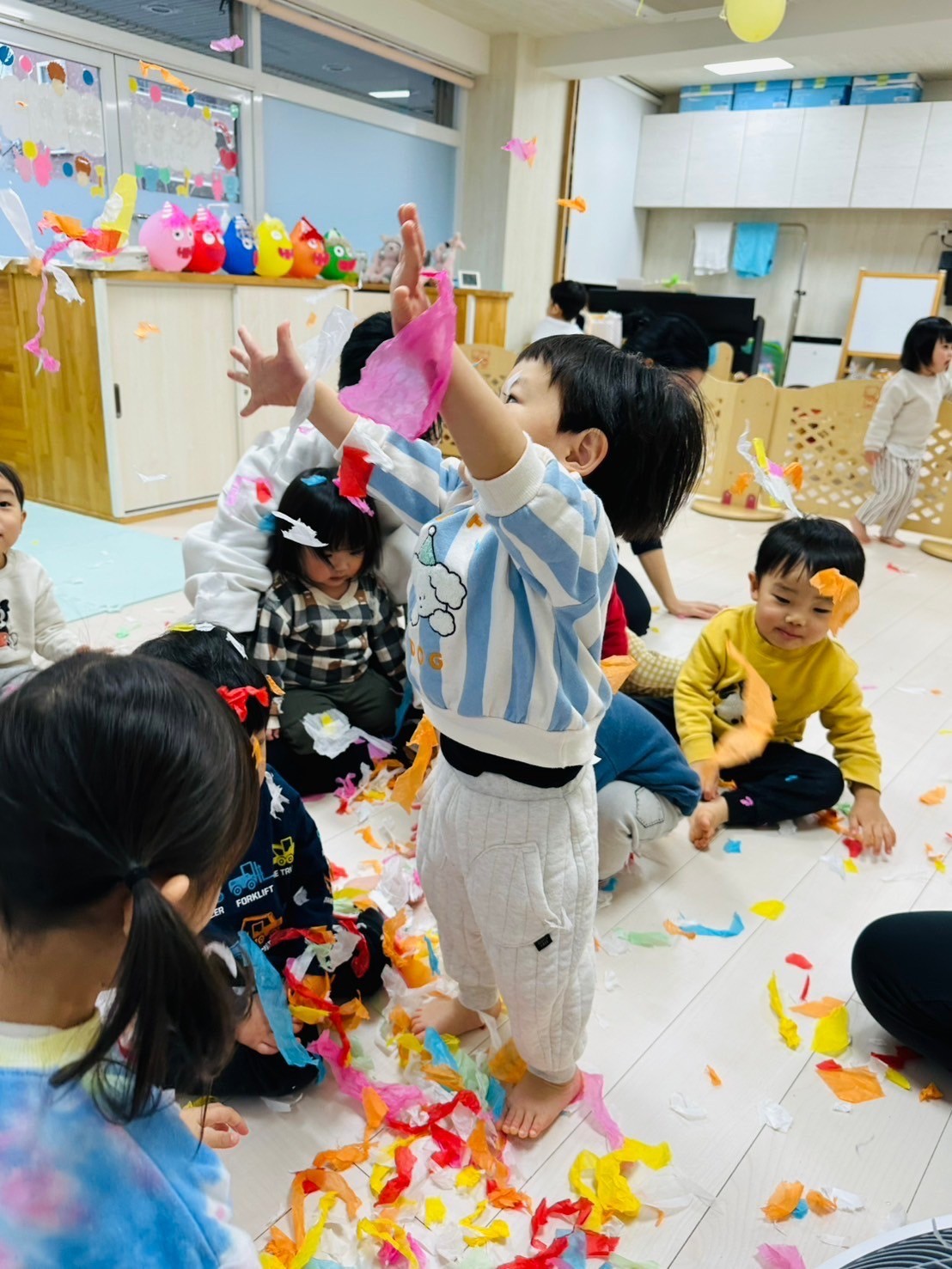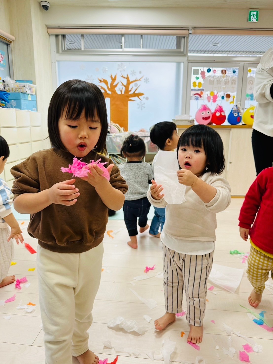 雪が降っていたので、花紙を雪に見立てて遊びました❄️
