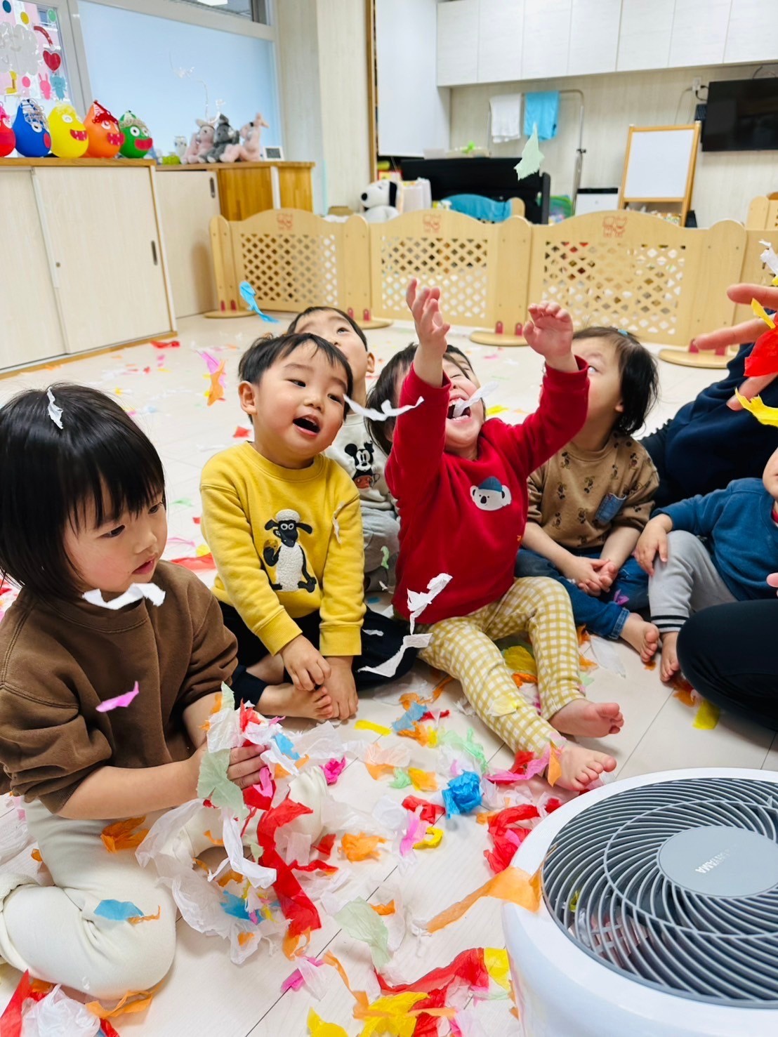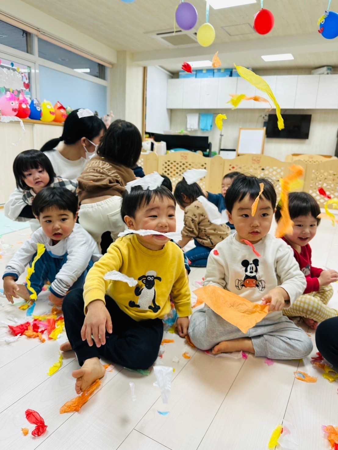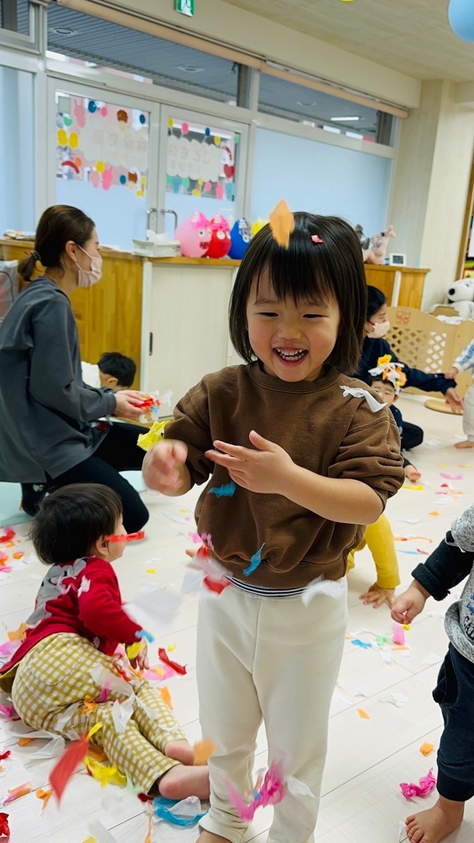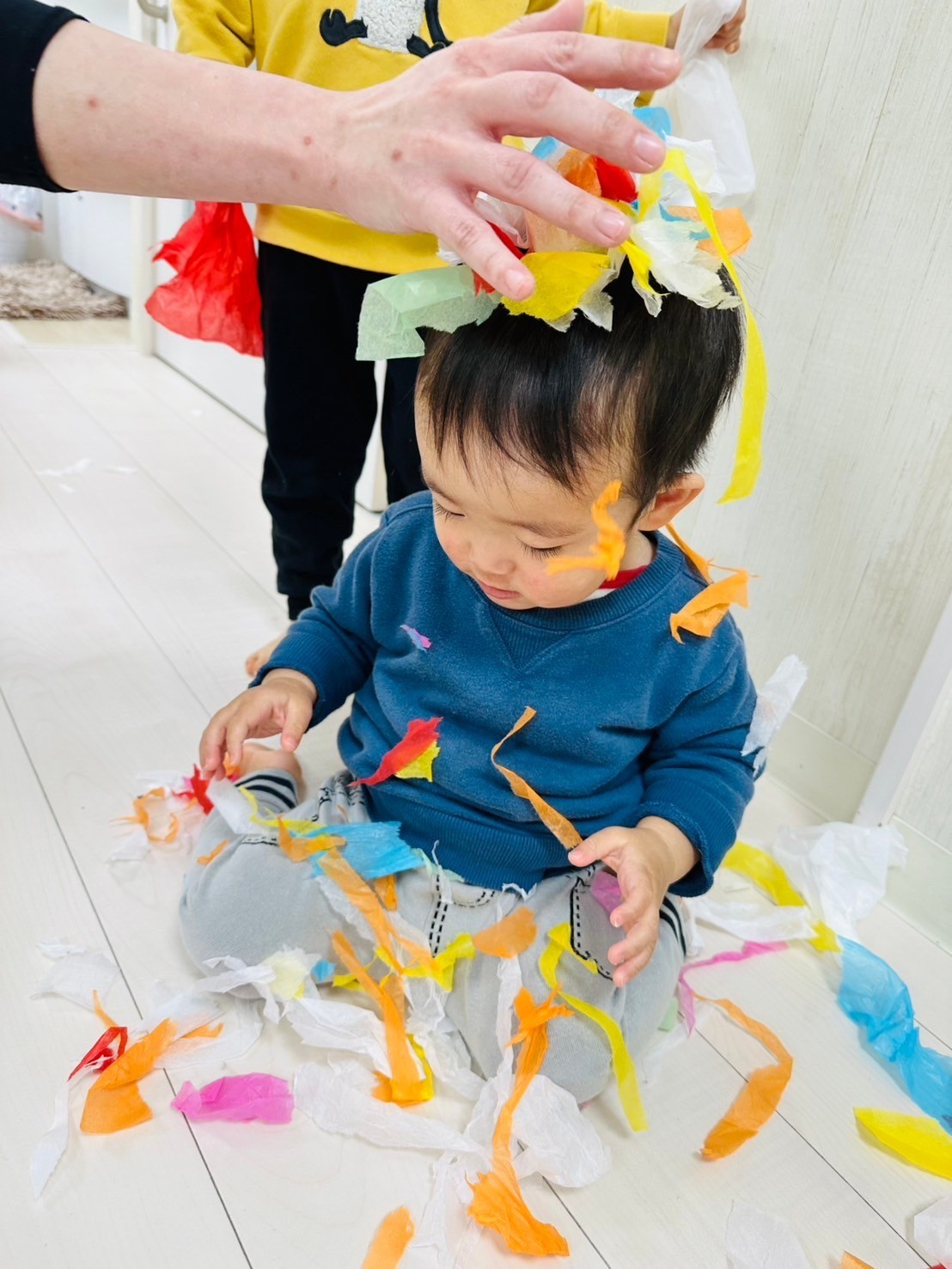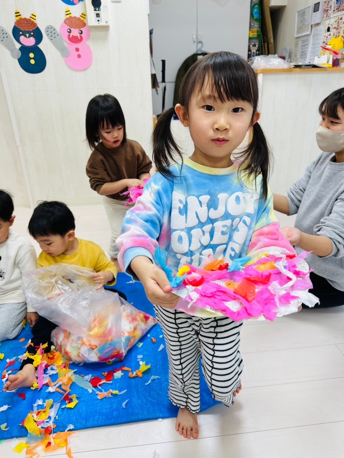 雪が降っていたので、花紙を雪に見立てて遊びました❄️