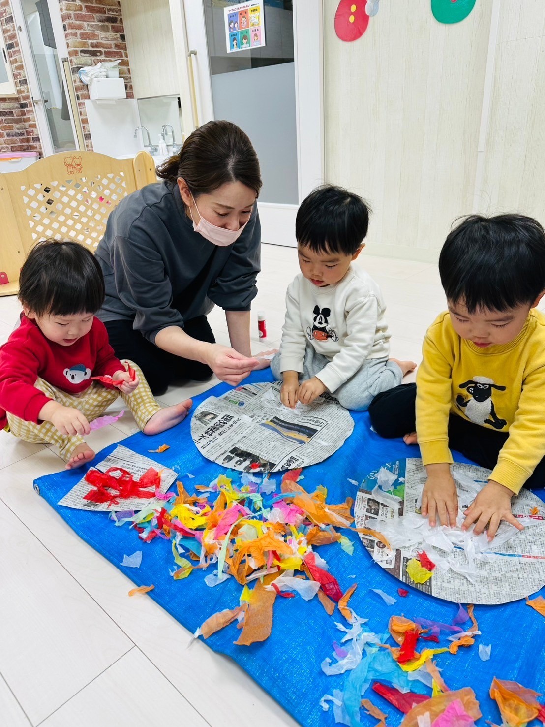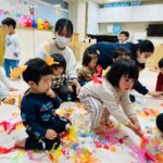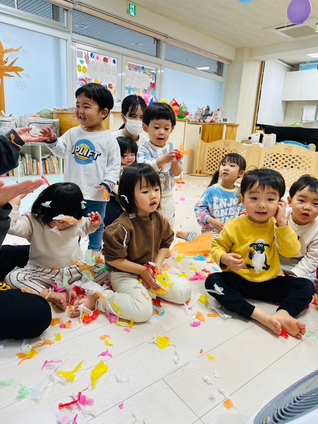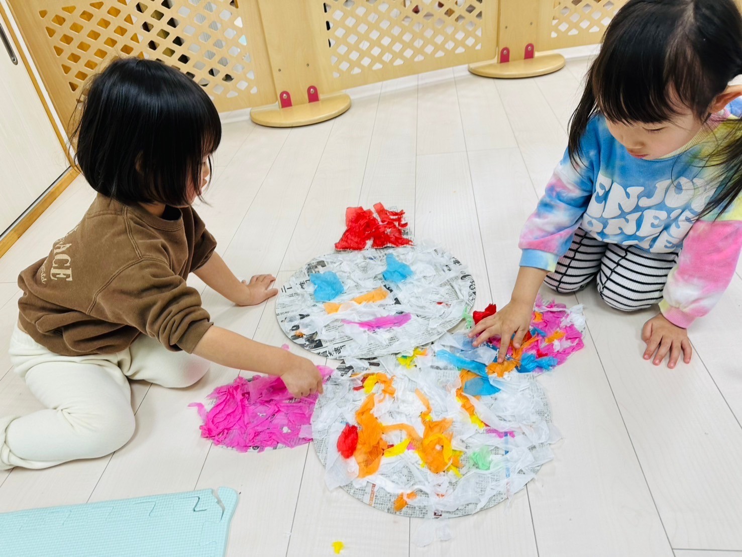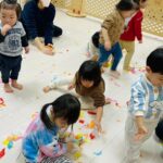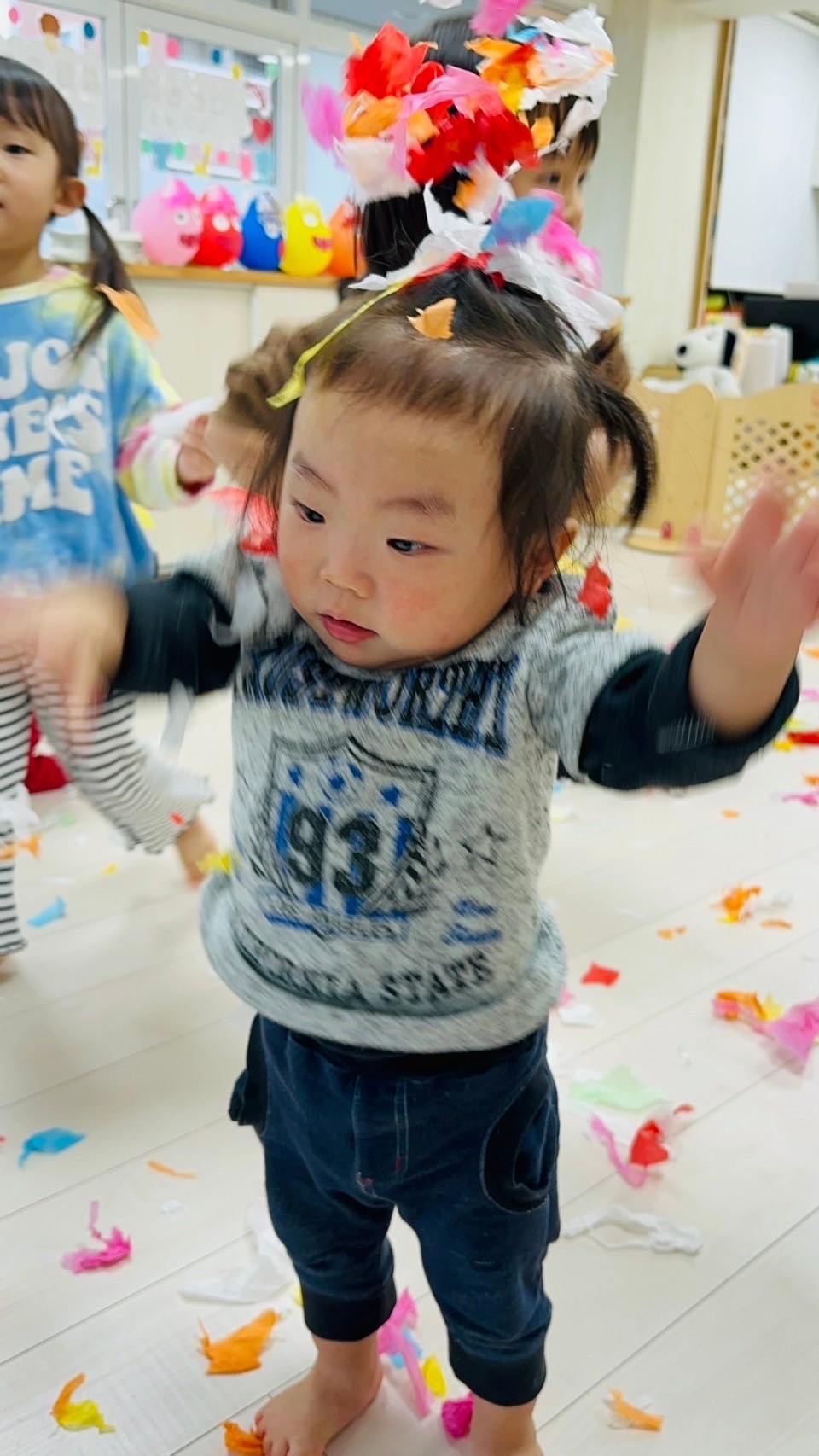 雪が降っていたので、花紙を雪に見立てて遊びました❄️