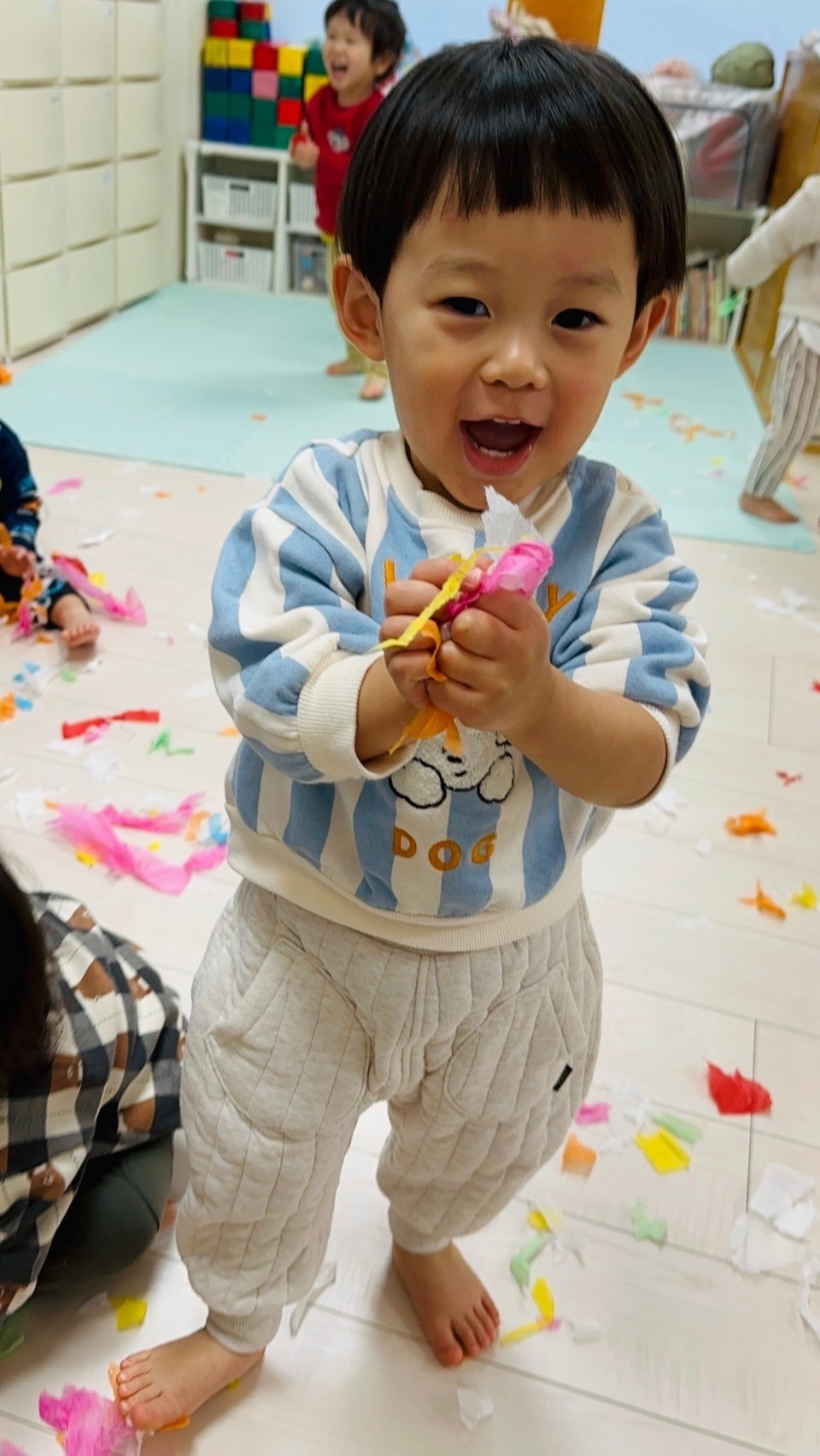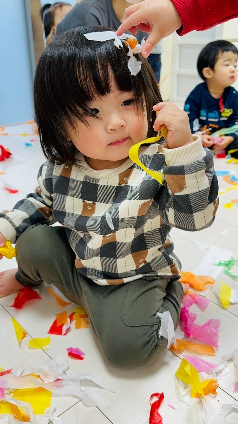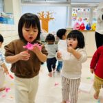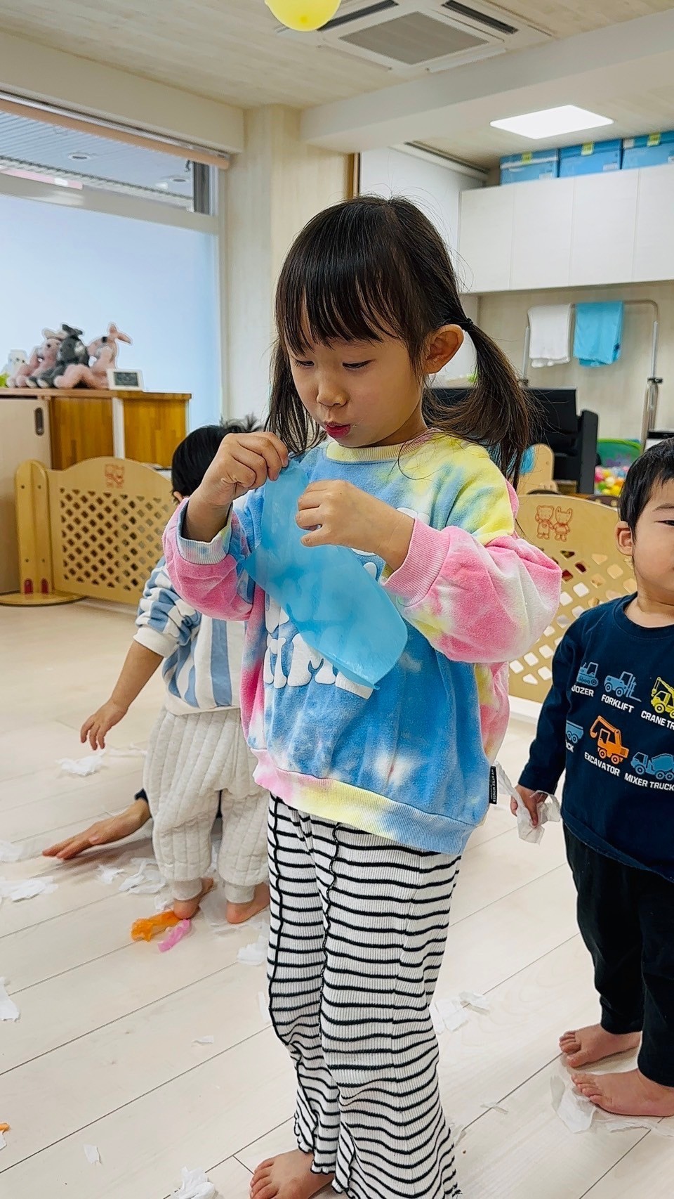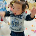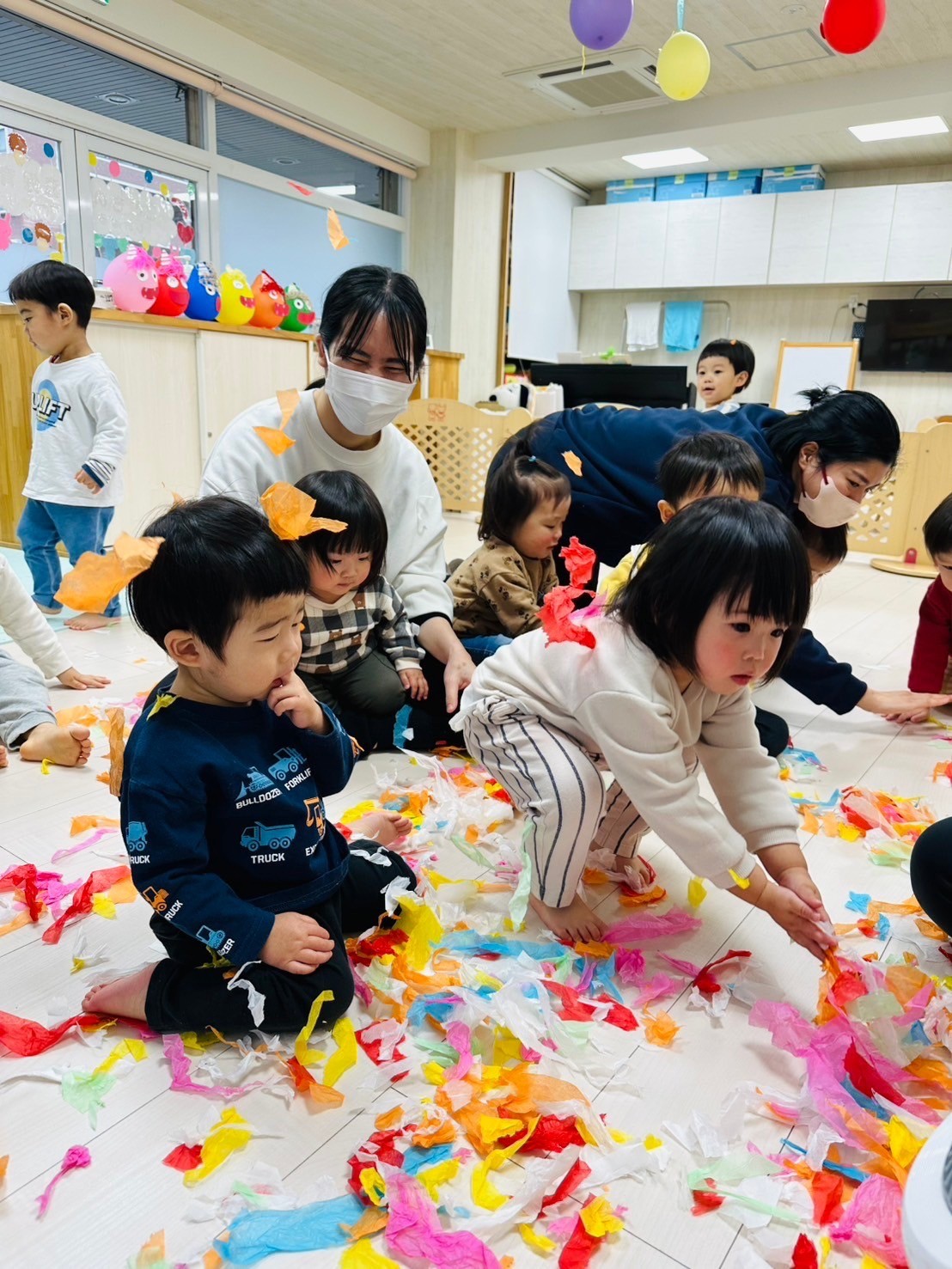 雪が降っていたので、花紙を雪に見立てて遊びました❄️