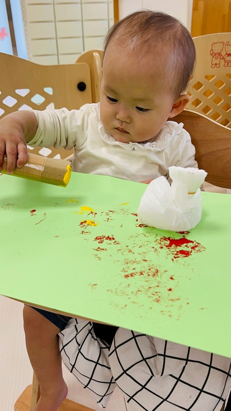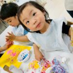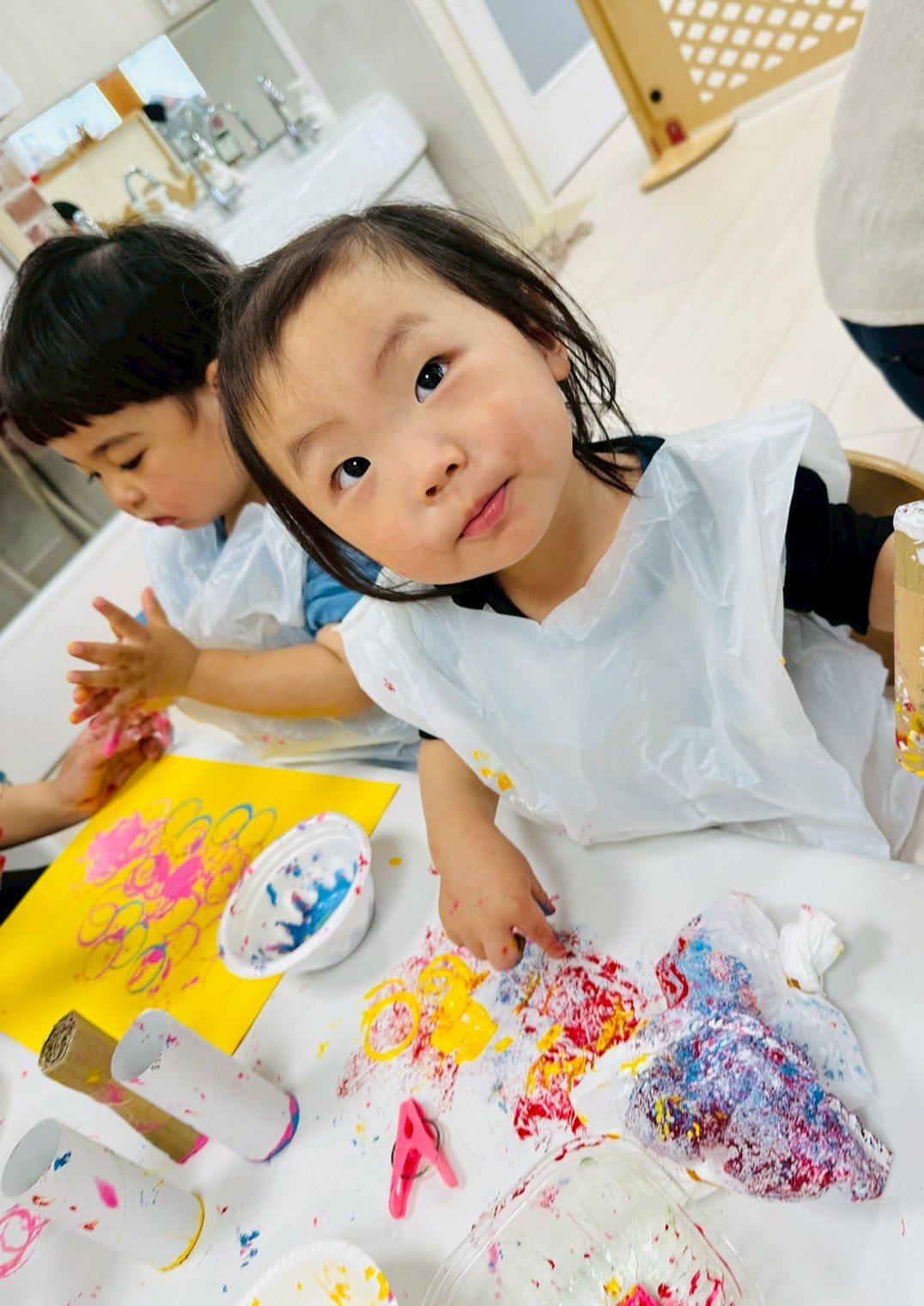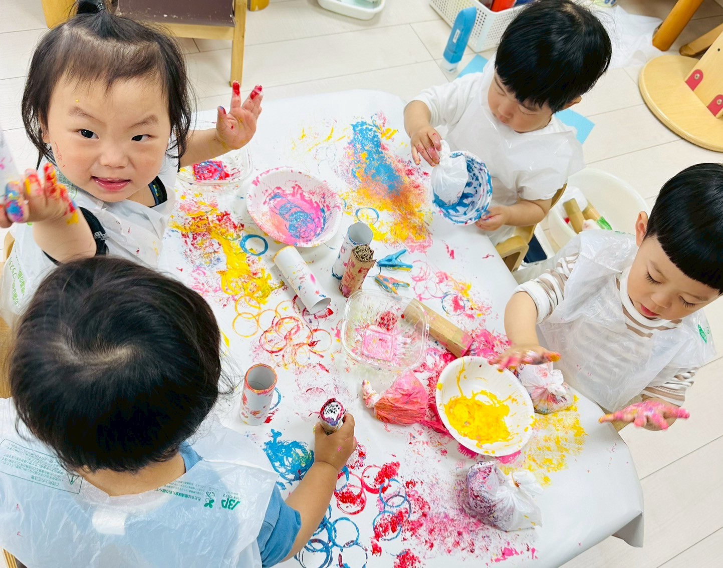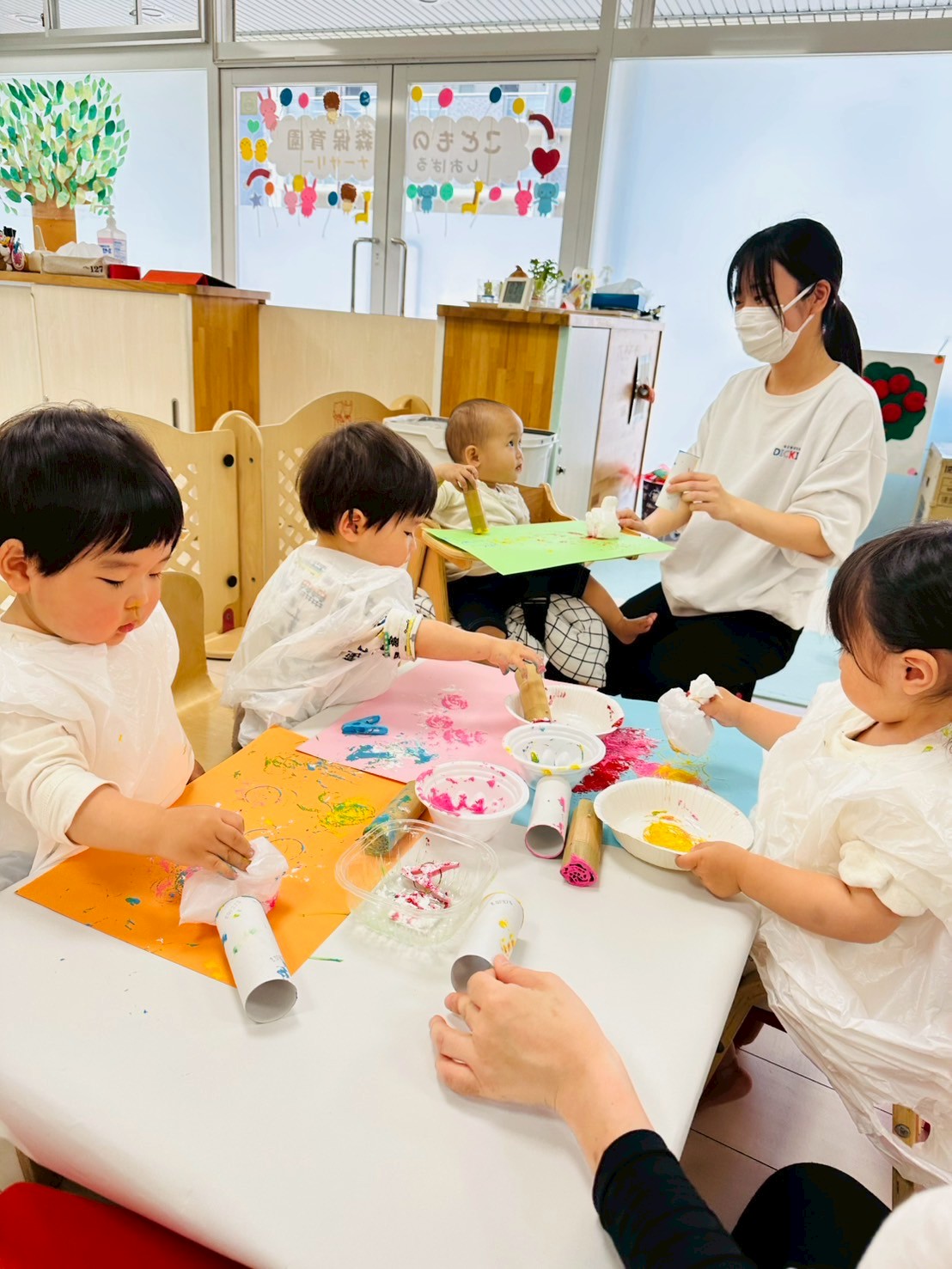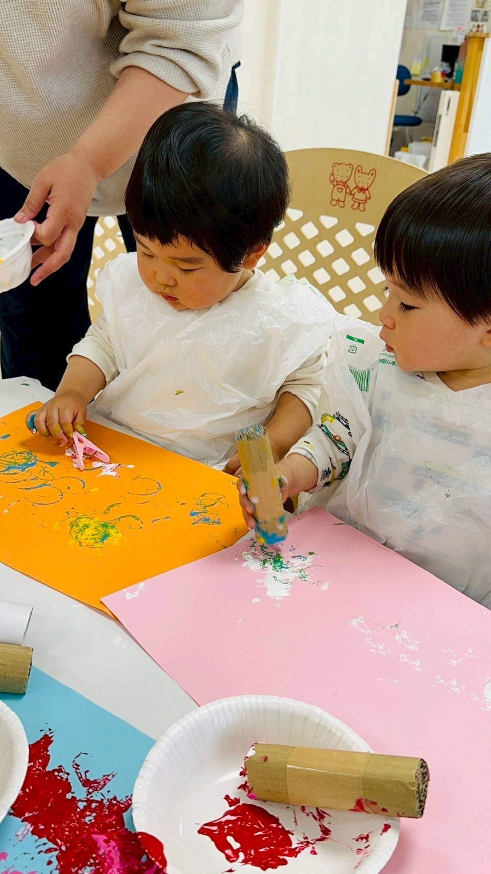 ダンボール、トイレットペーパーの芯、洗濯バサミ、ビニール袋を使って色々なスタンプを楽しみました❤️
