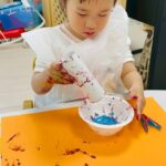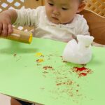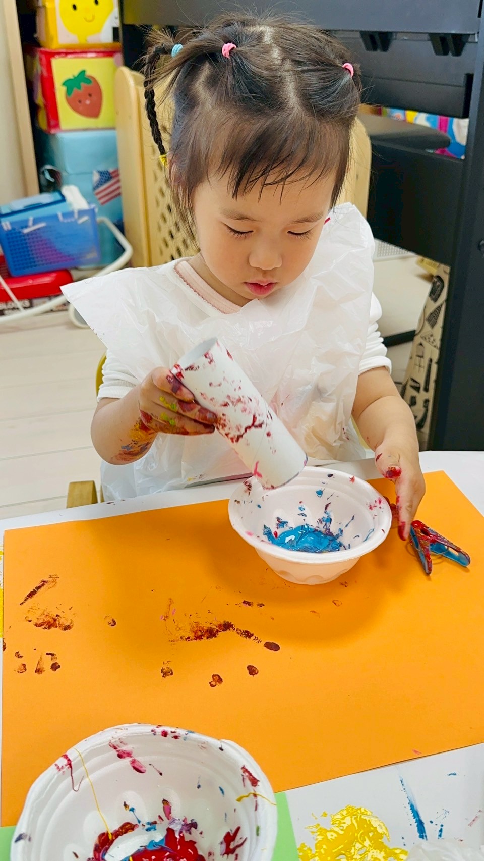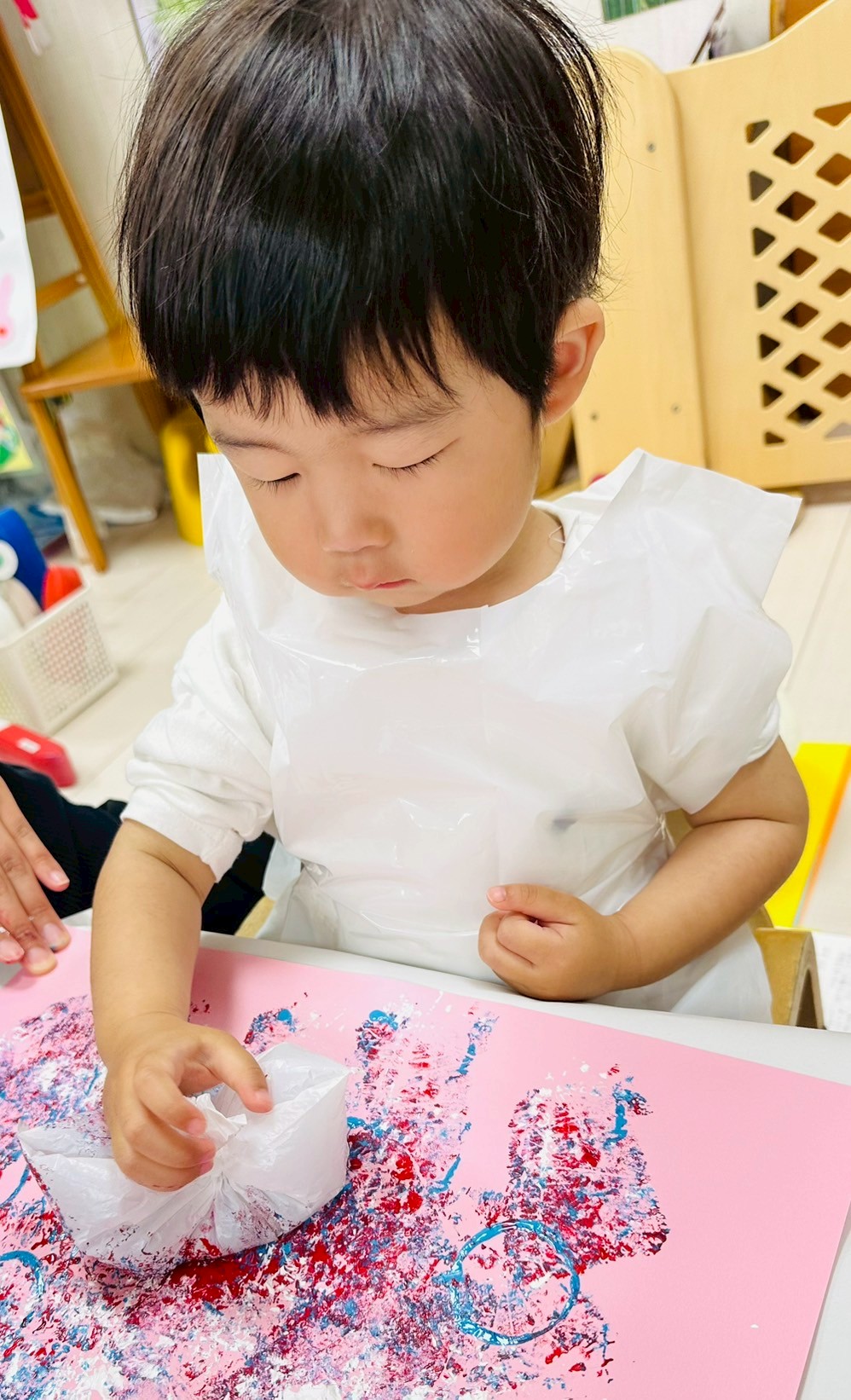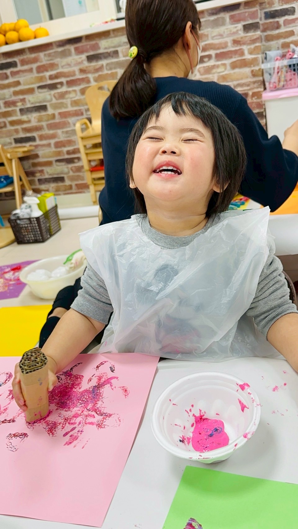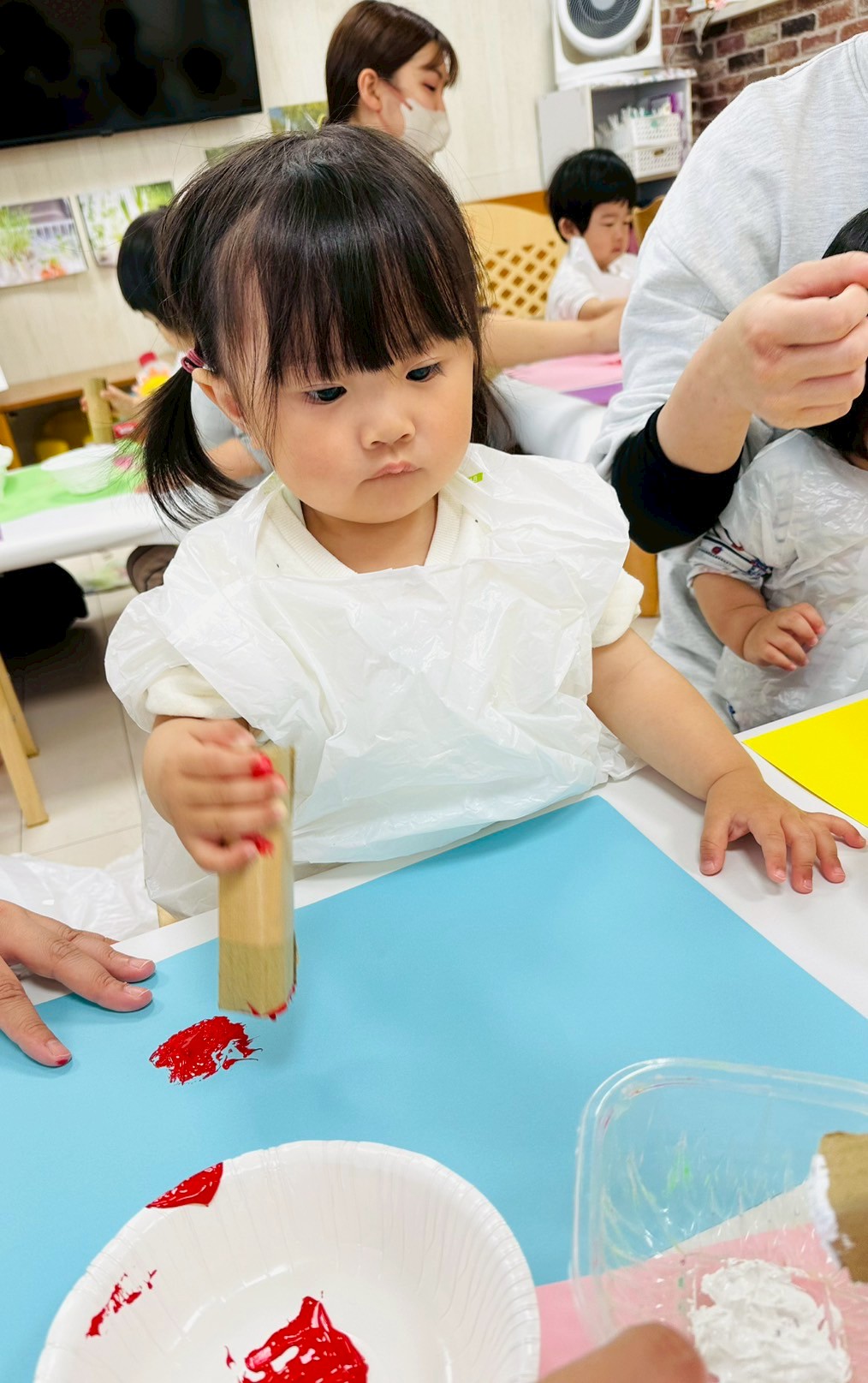 ダンボール、トイレットペーパーの芯、洗濯バサミ、ビニール袋を使って色々なスタンプを楽しみました❤️