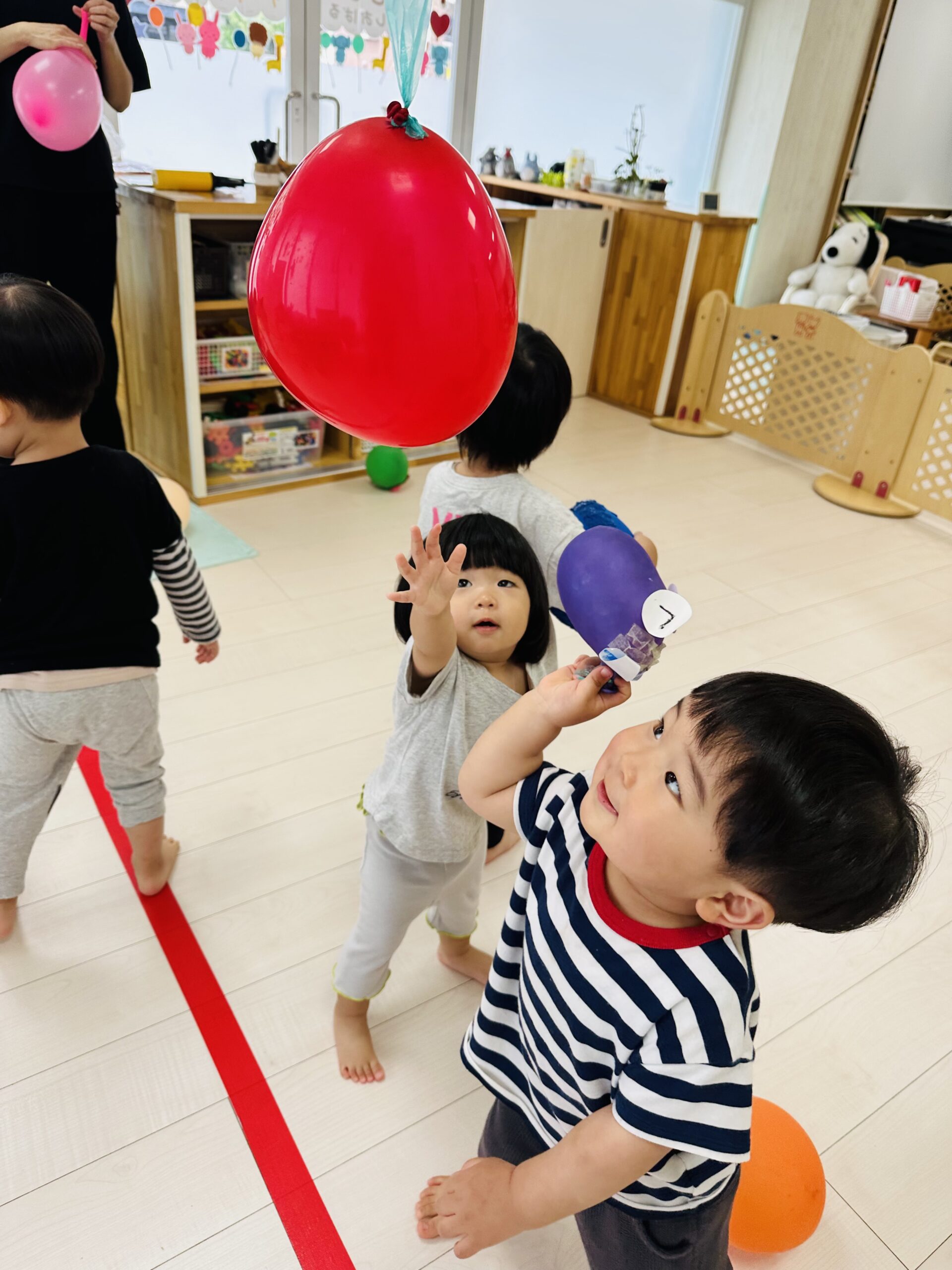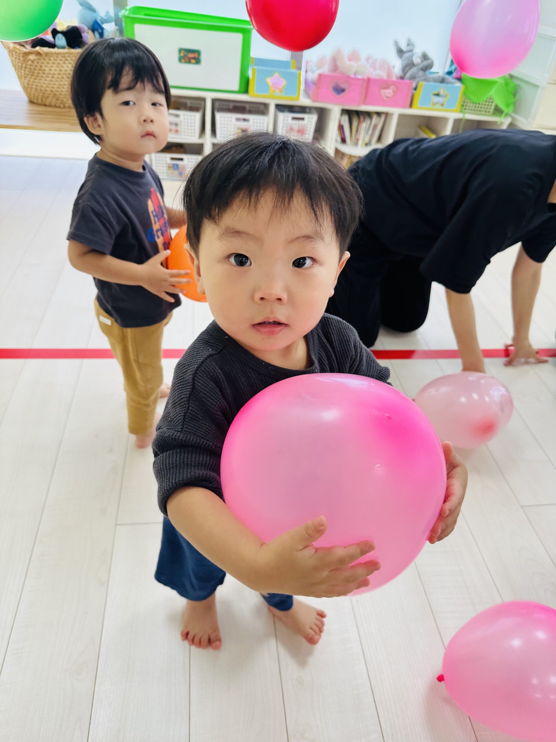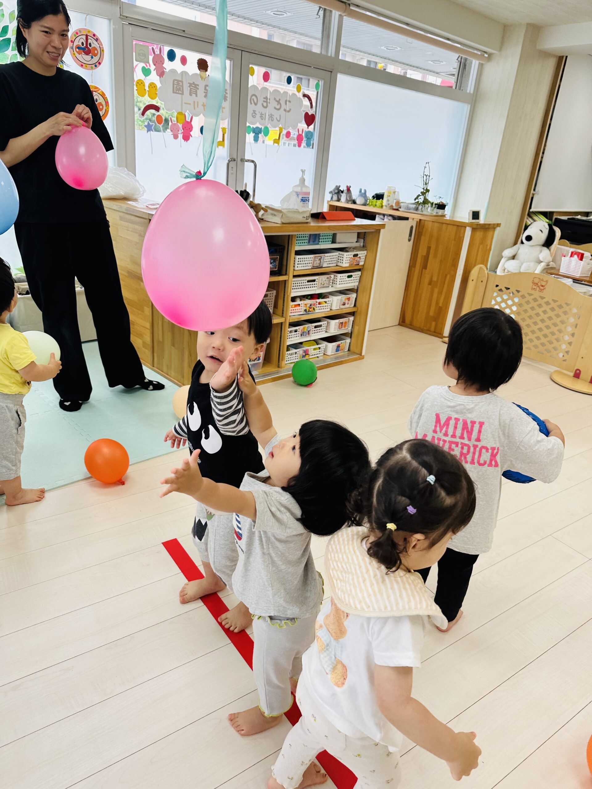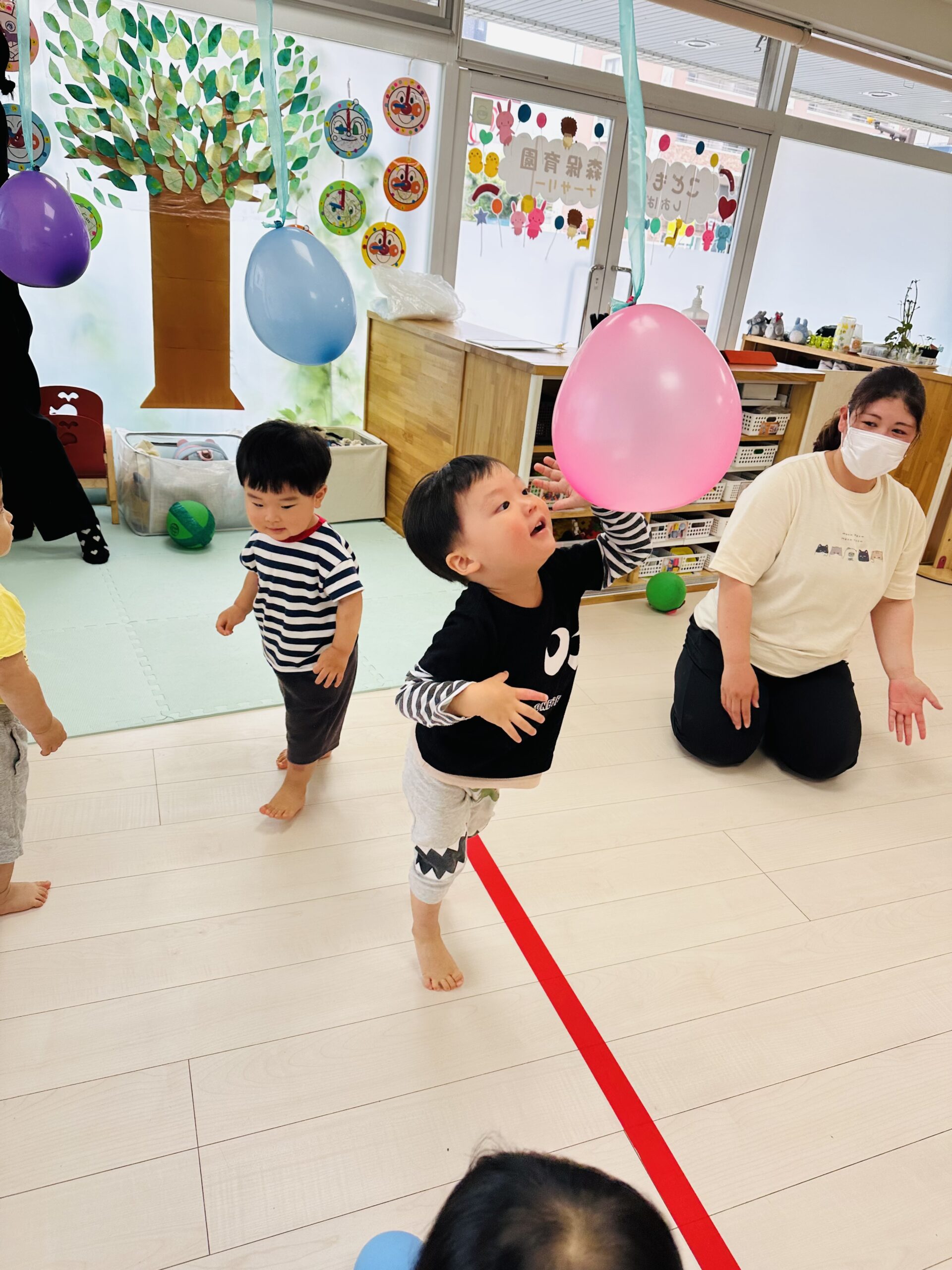 カラフルな風船が沢山🙌ジャンプしてタッチしたり、捕まえようと頑張ったり🤗