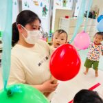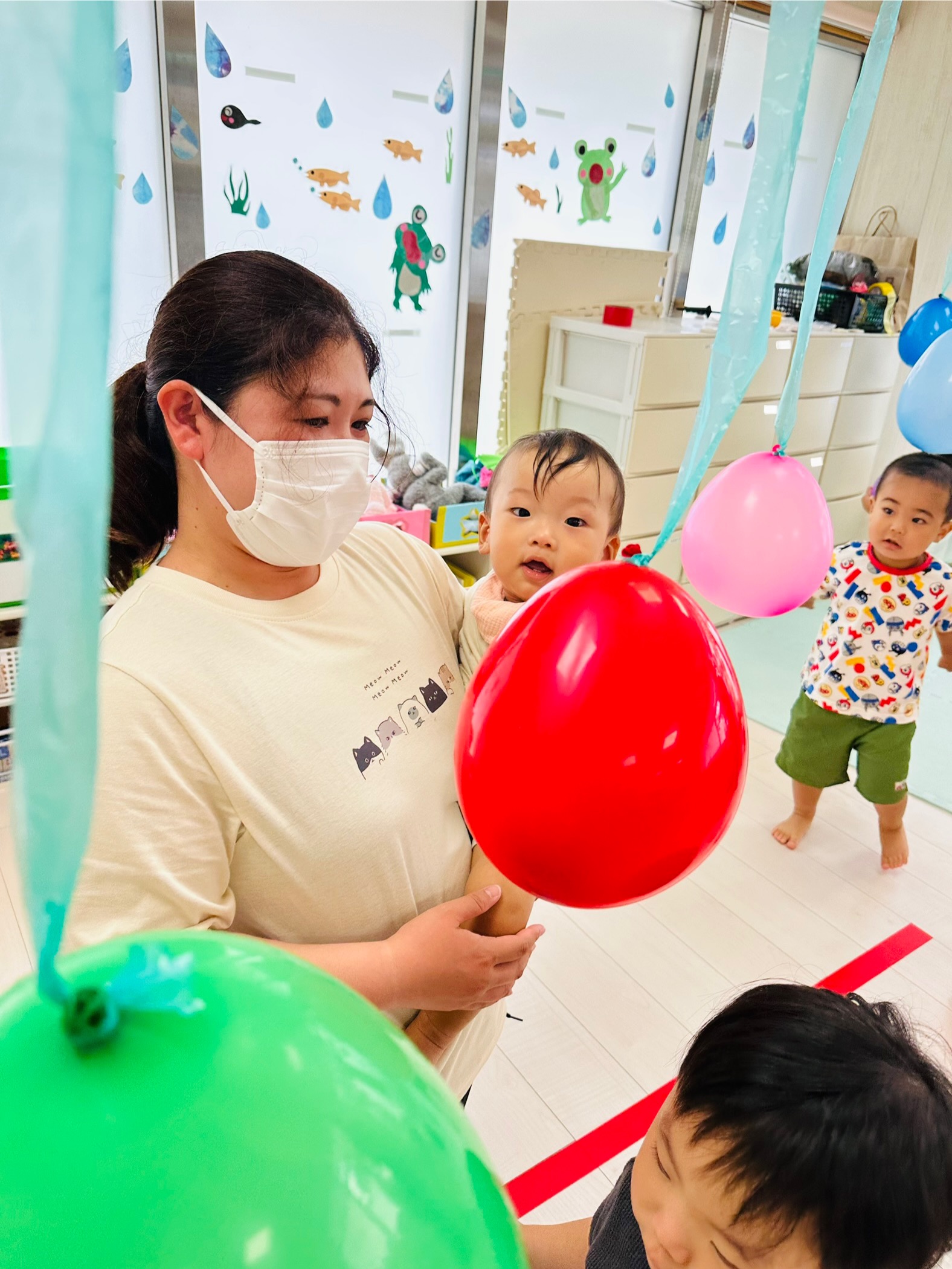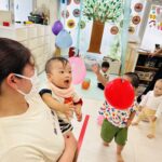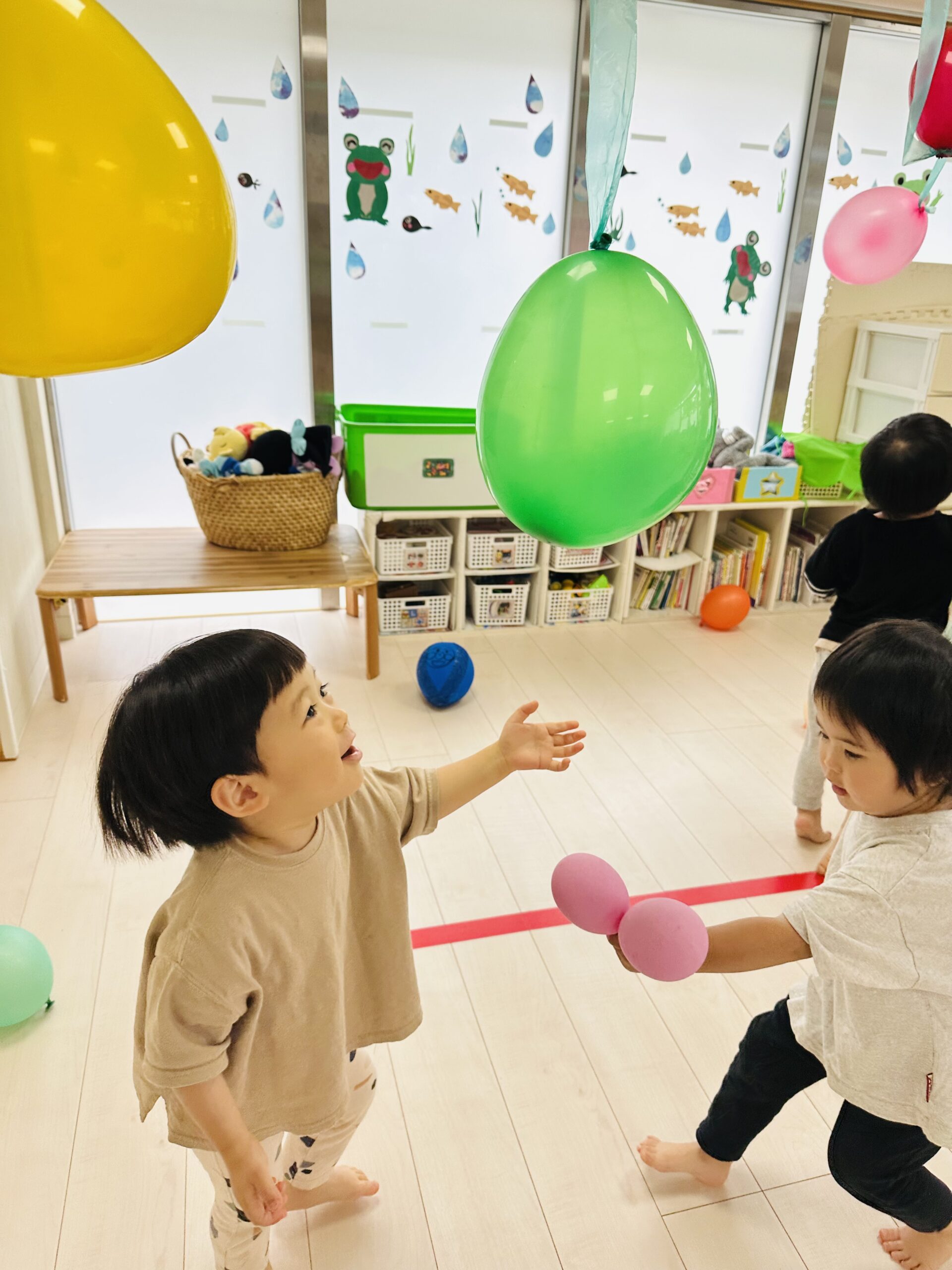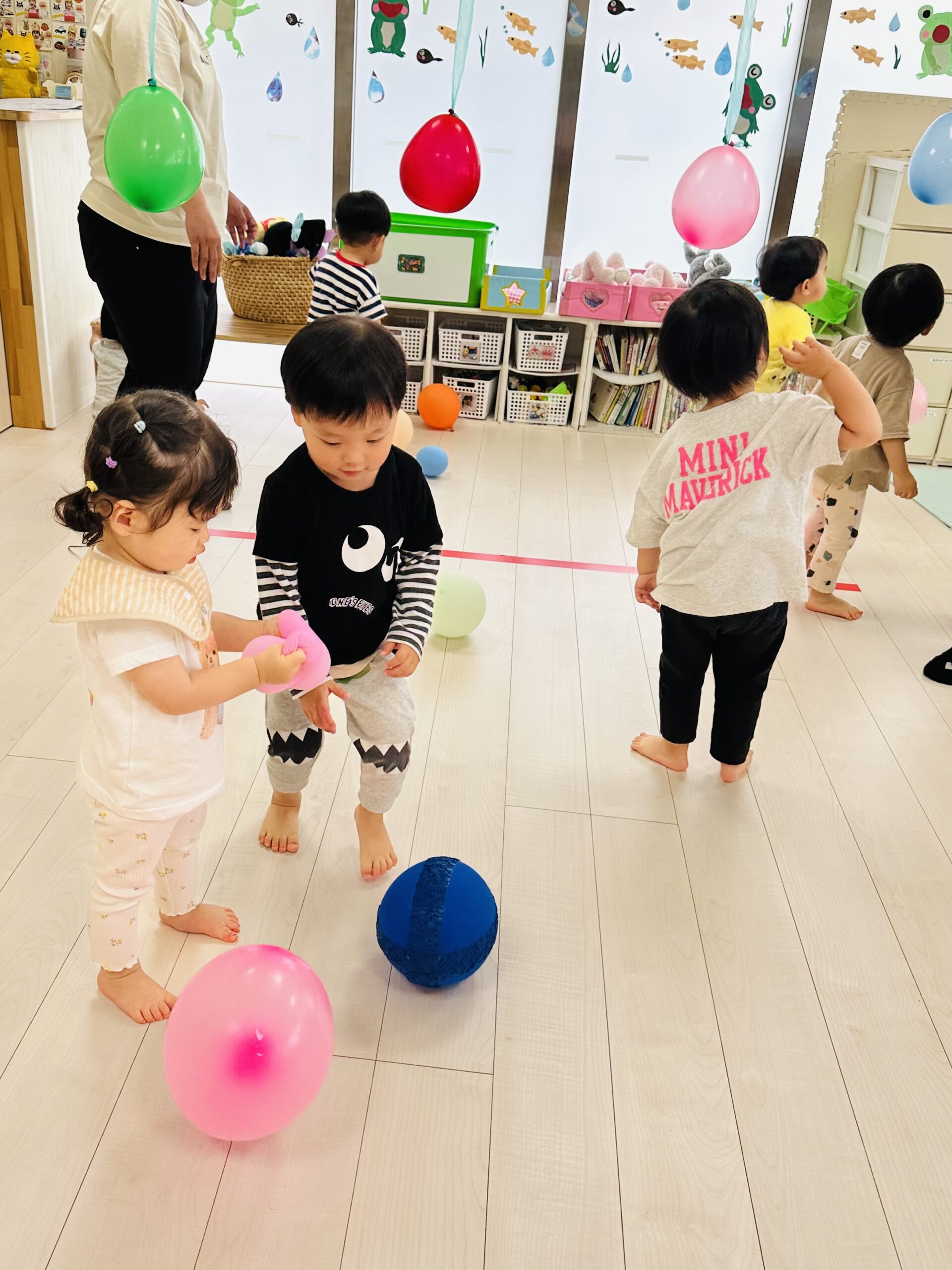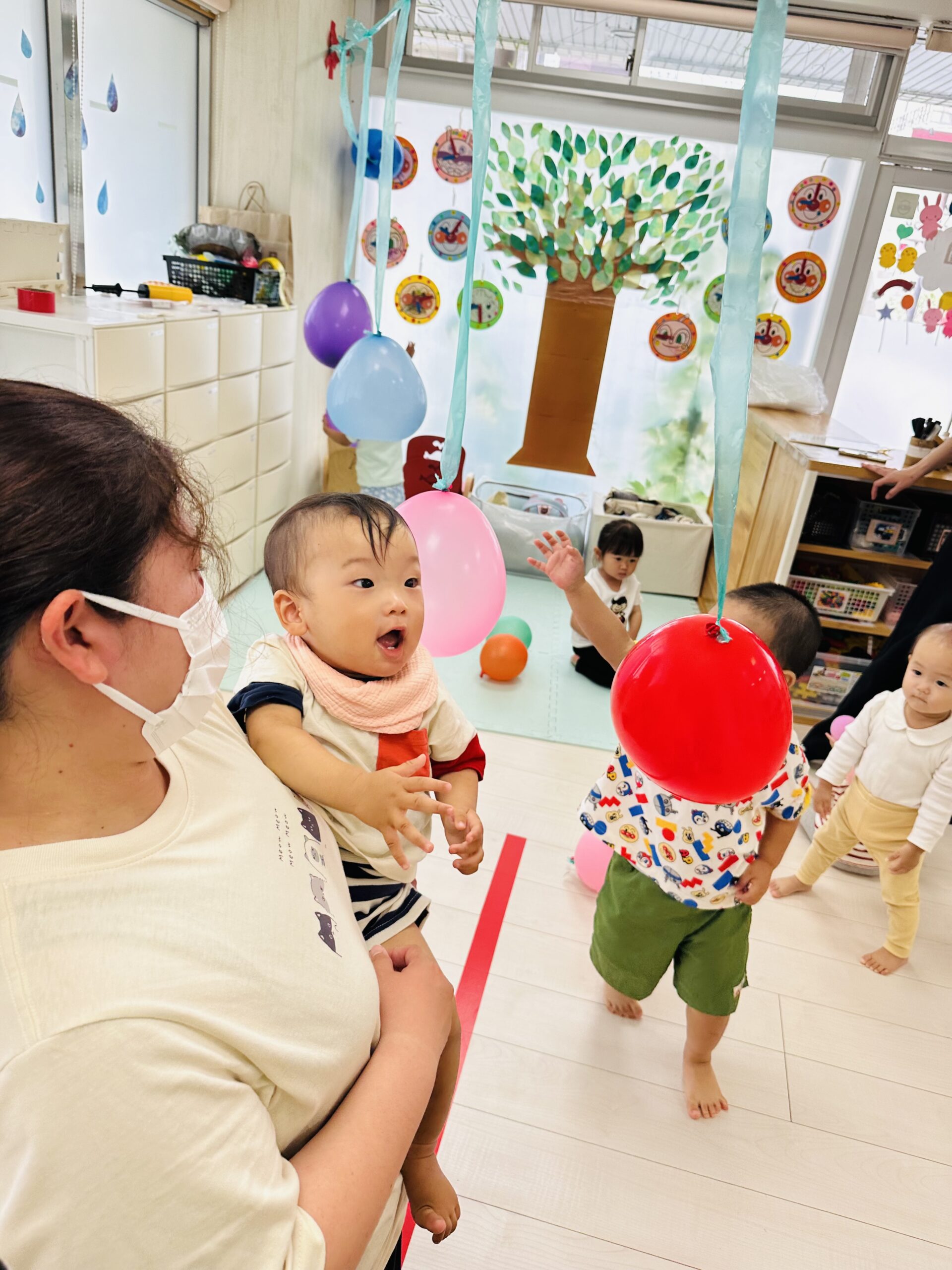 カラフルな風船が沢山🙌ジャンプしてタッチしたり、捕まえようと頑張ったり🤗