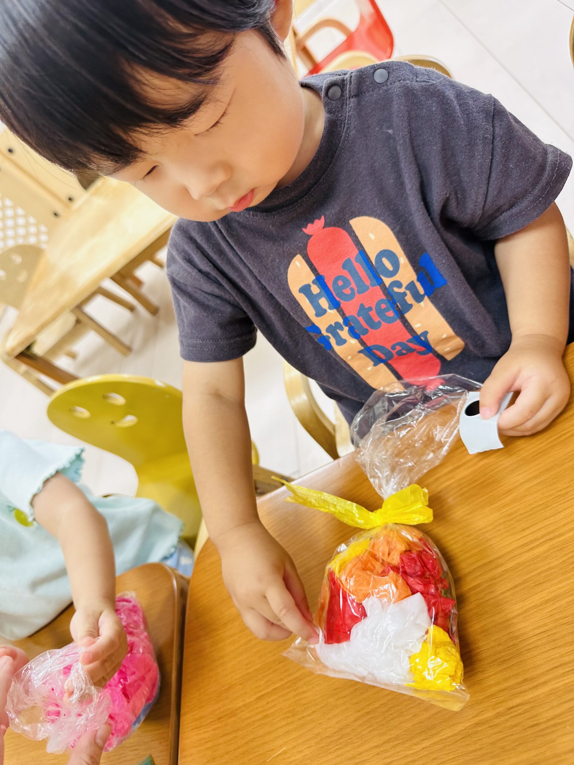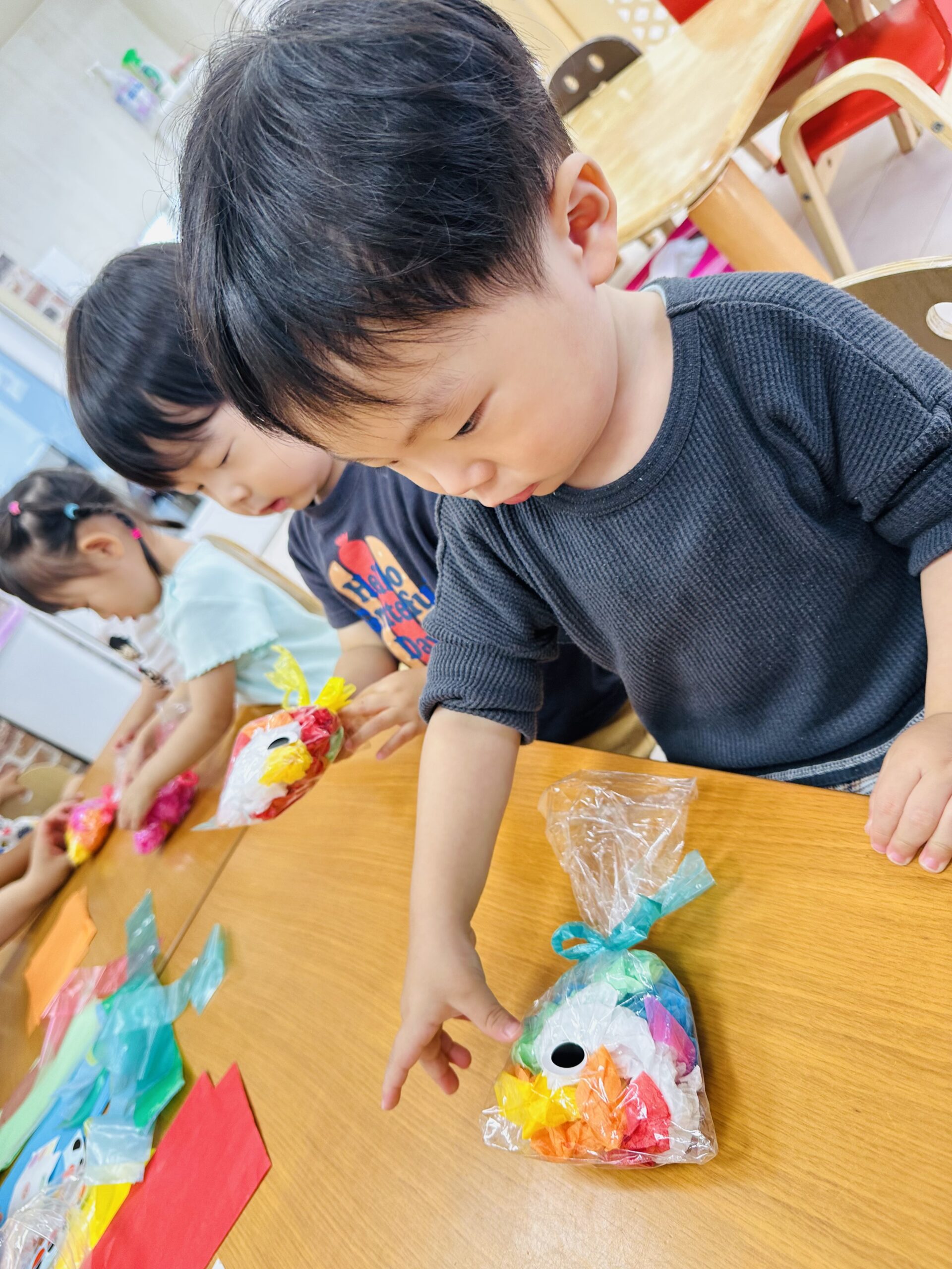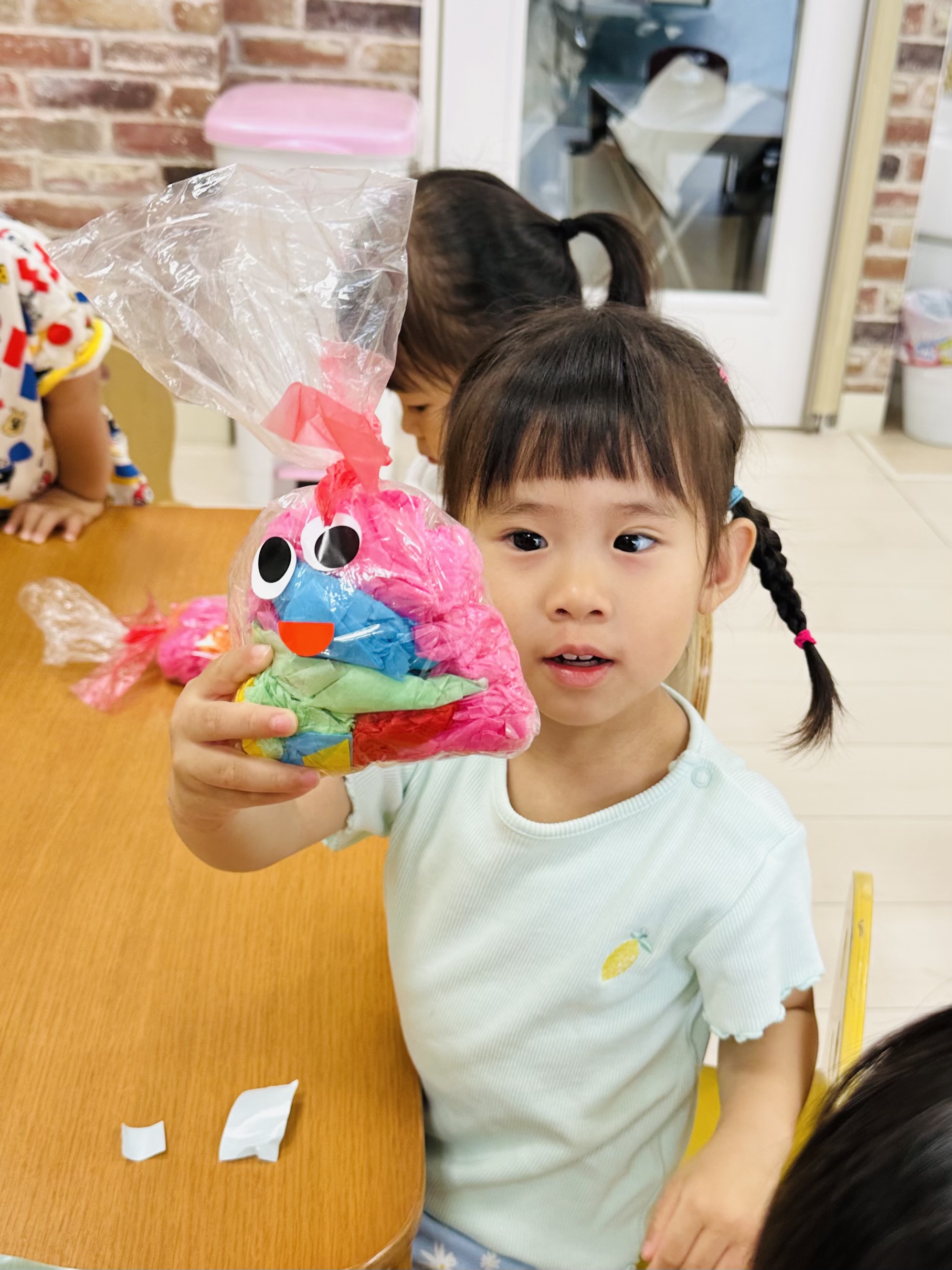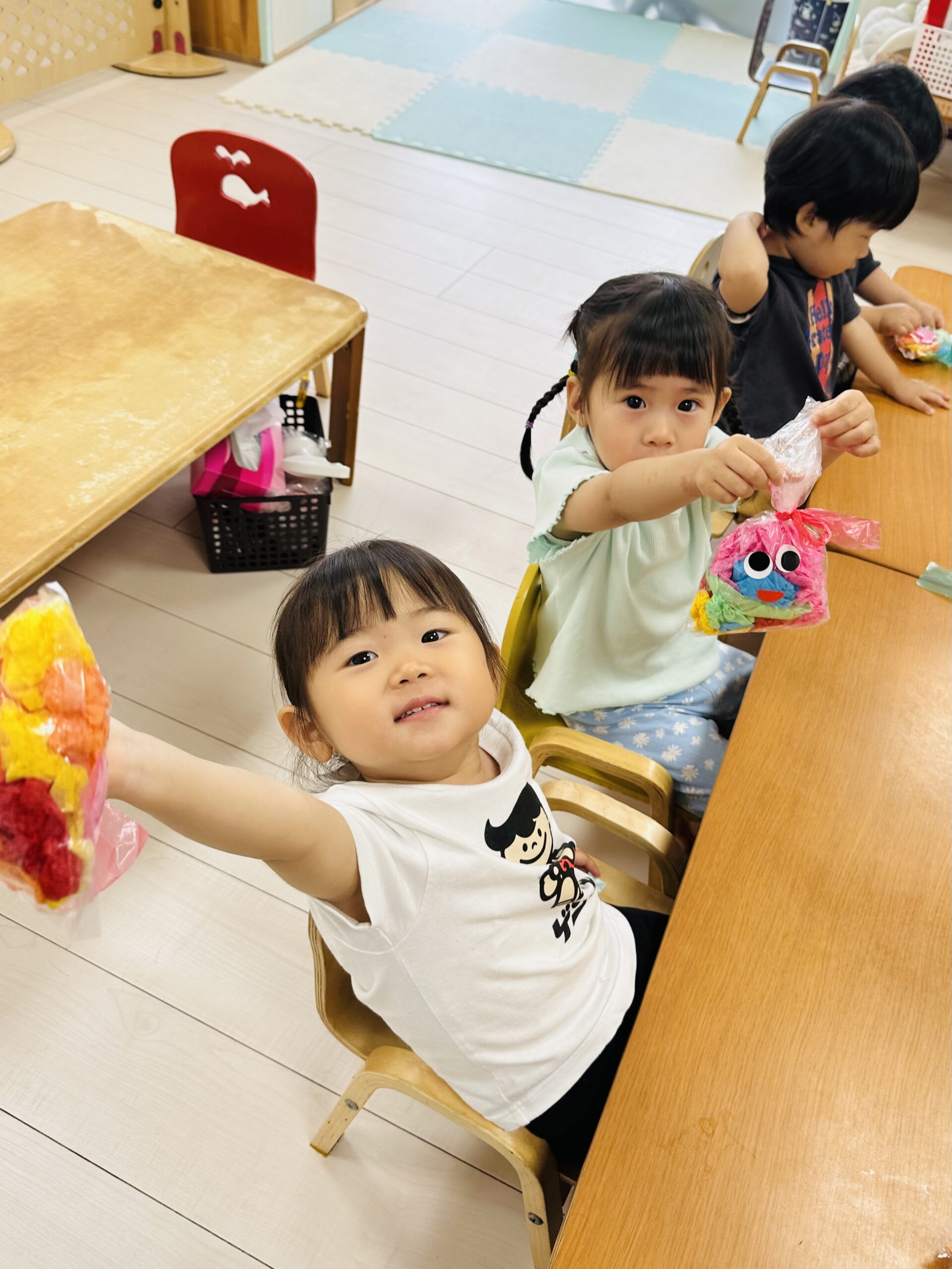 花紙をビニール袋に入れて、可愛いてるてる坊主も作りました☔️