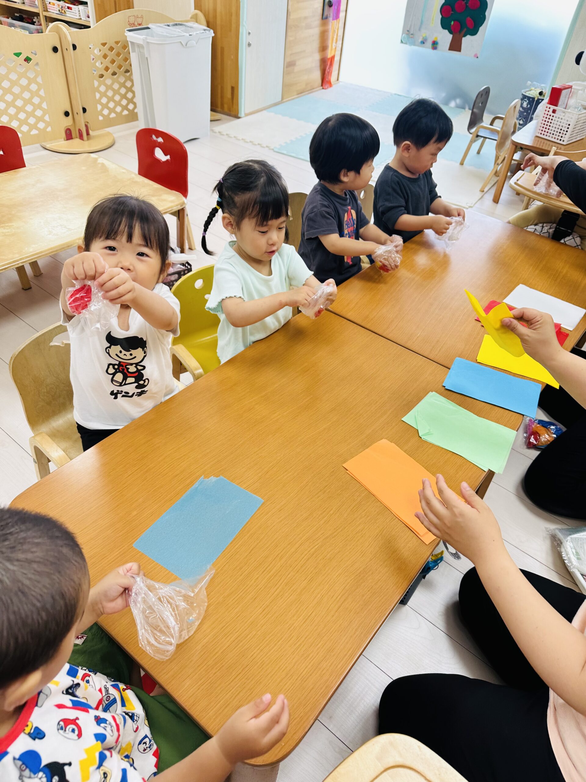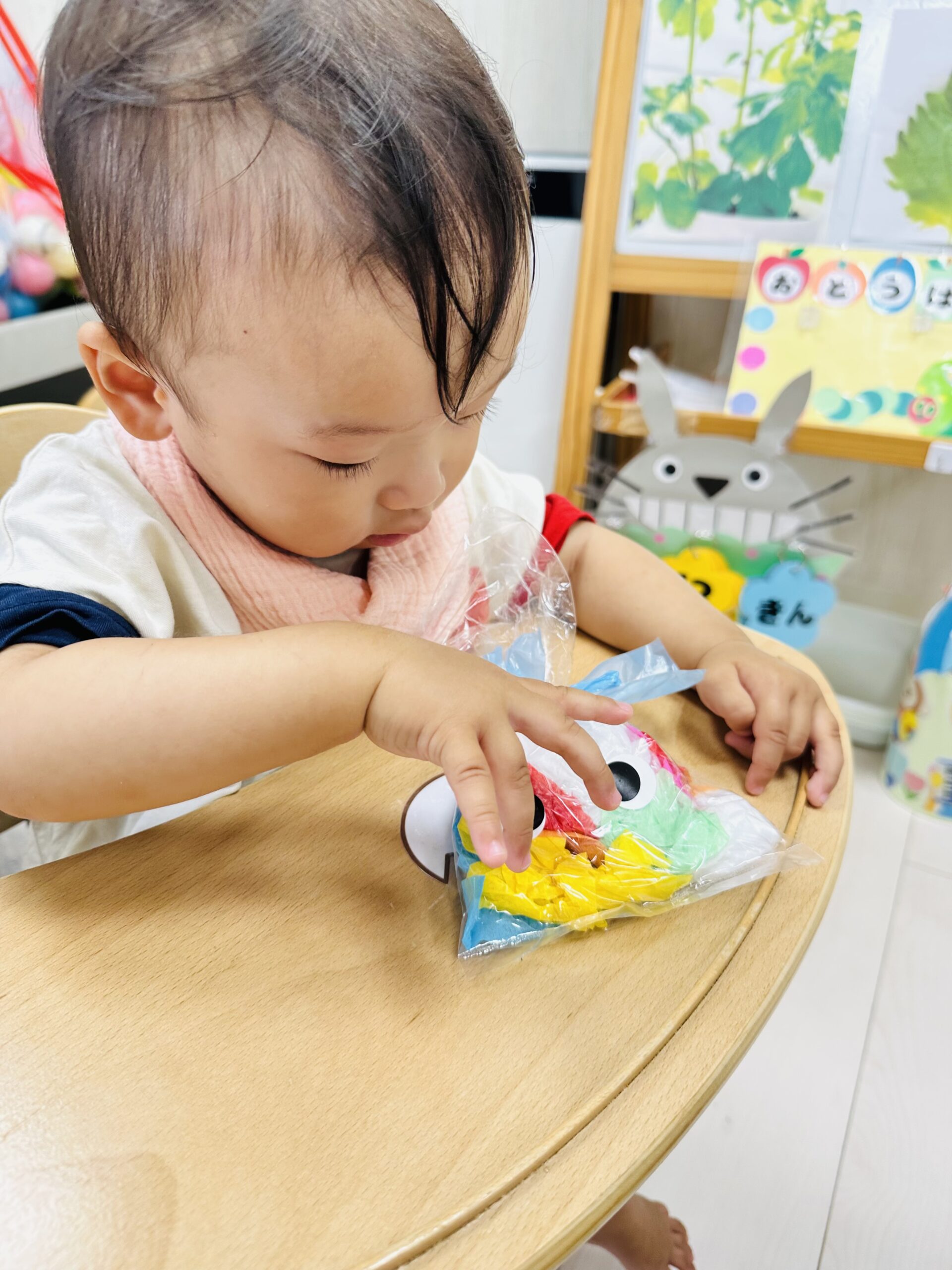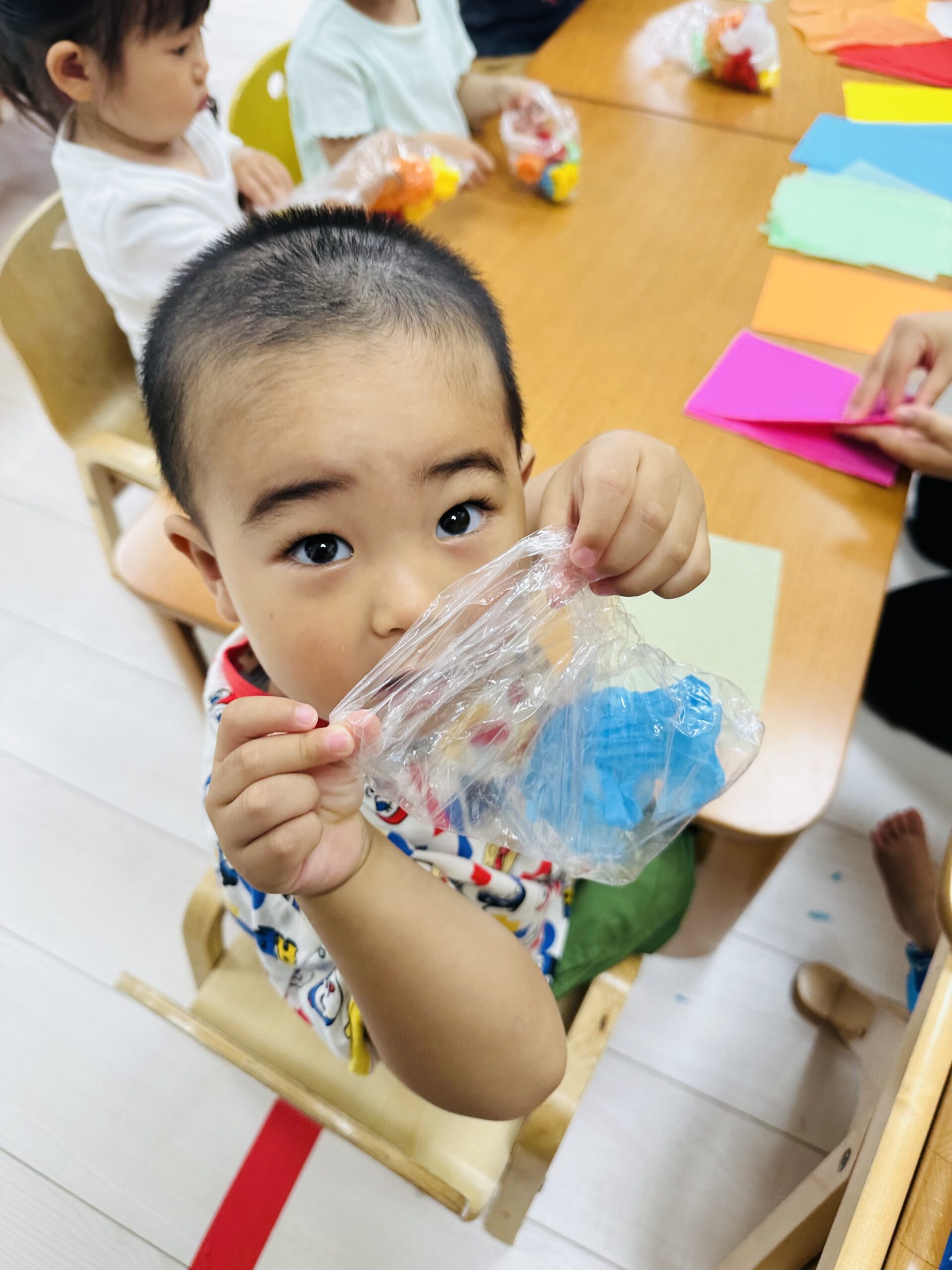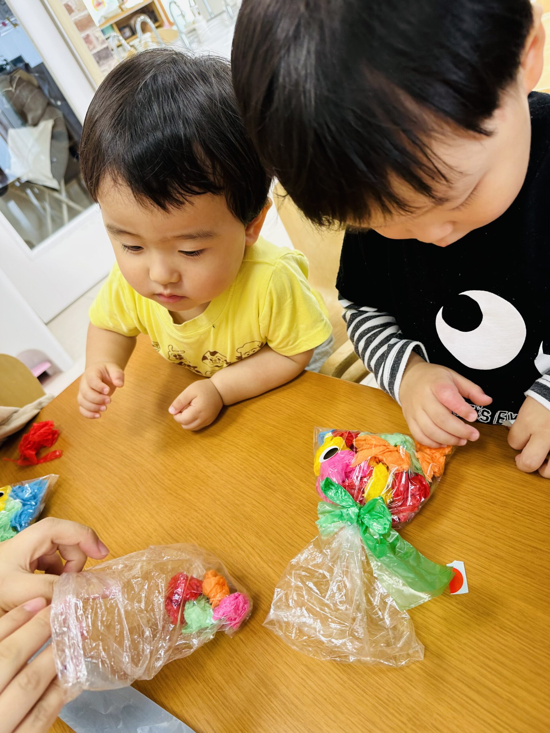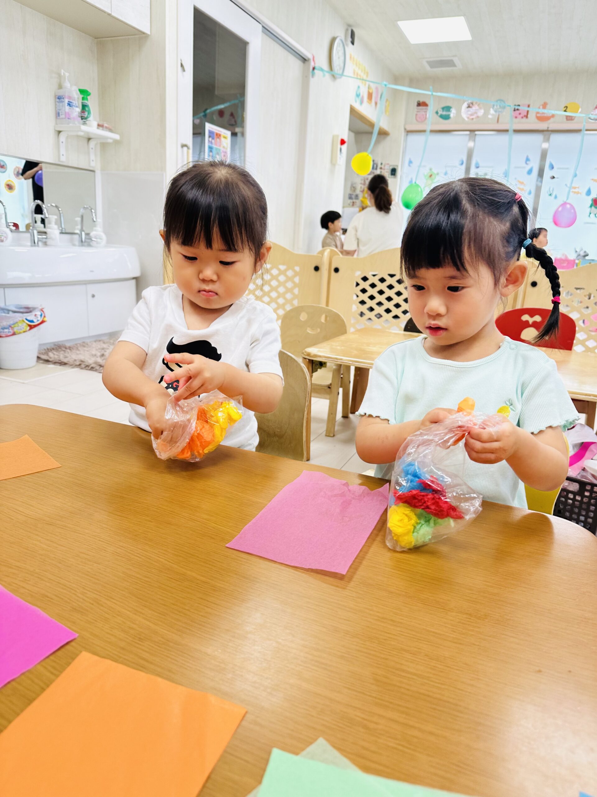 花紙をビニール袋に入れて、可愛いてるてる坊主も作りました☔️