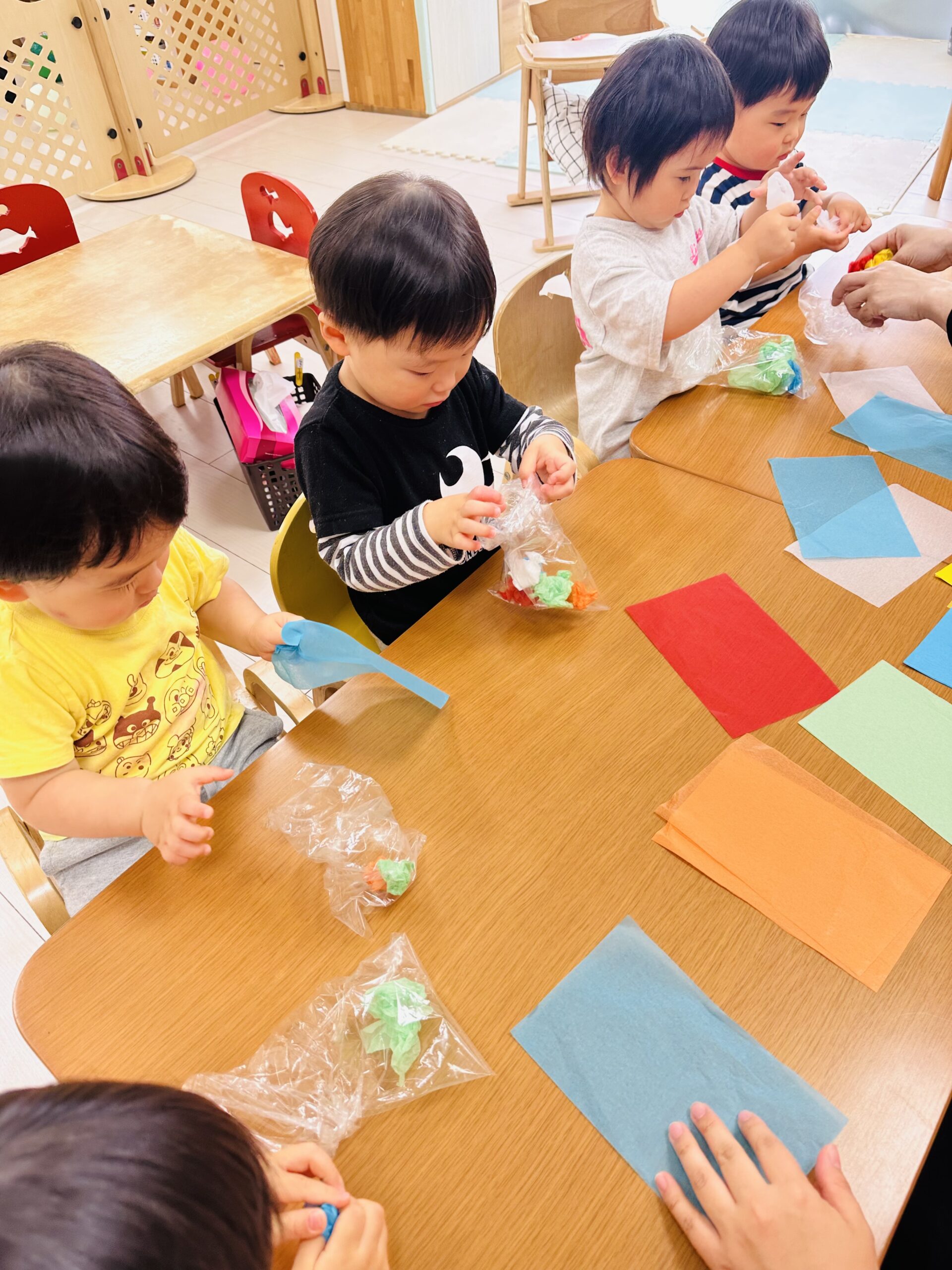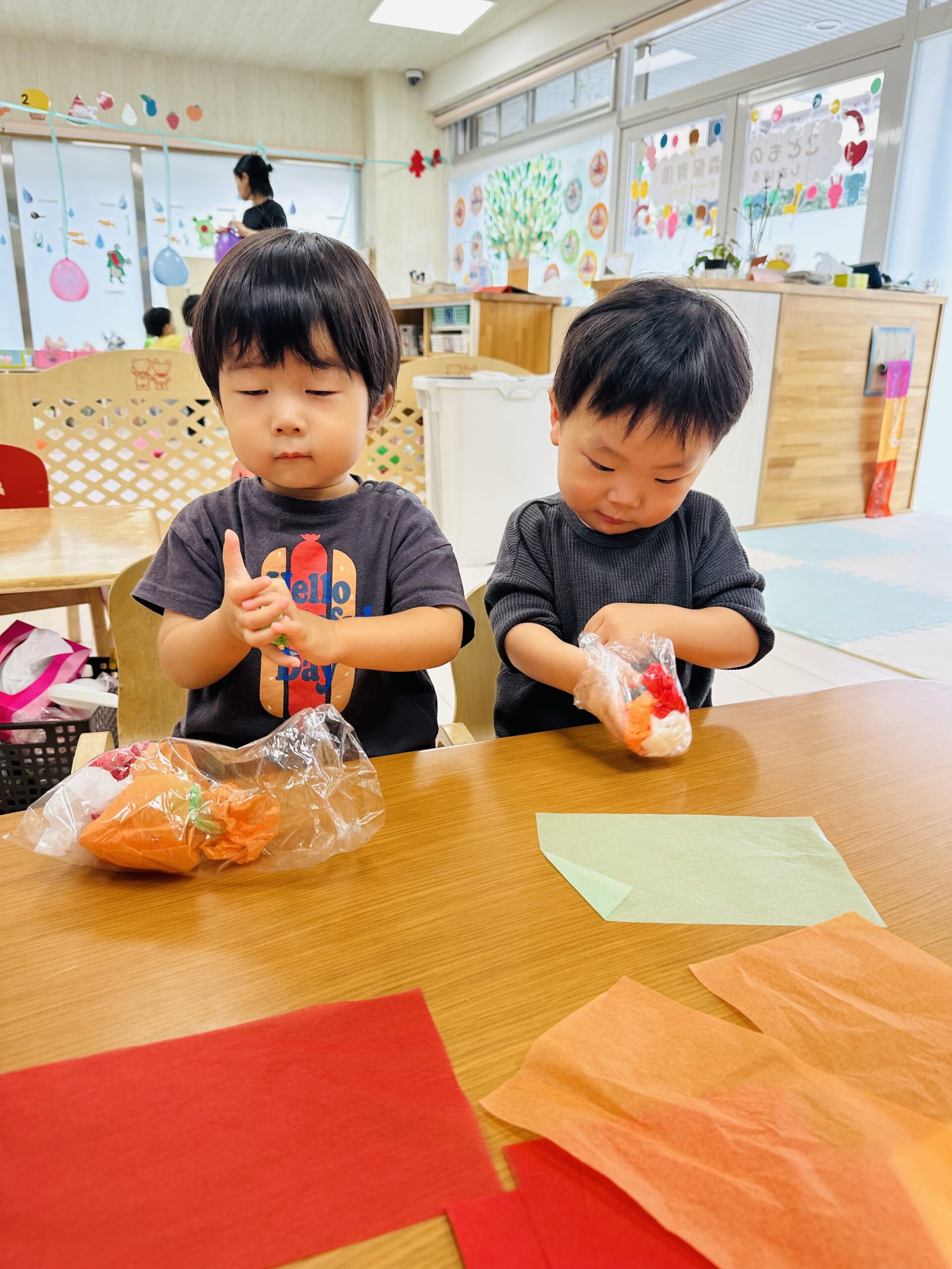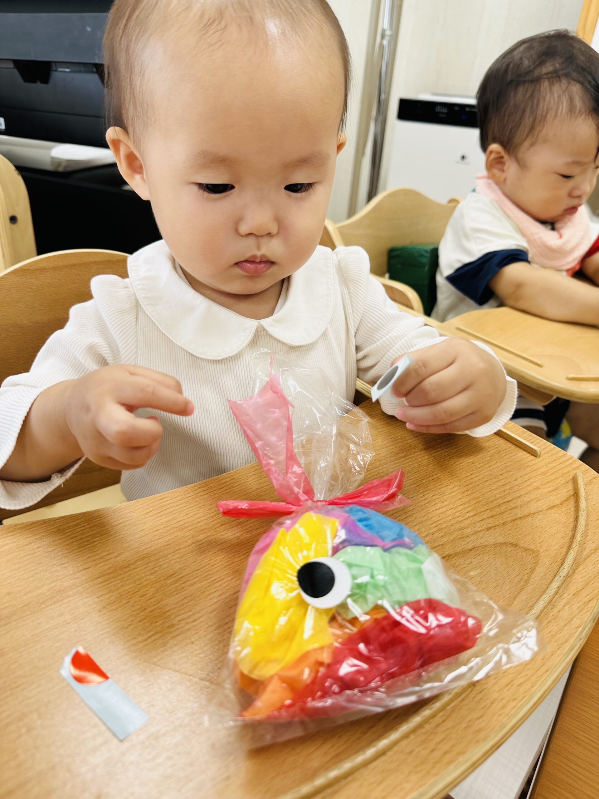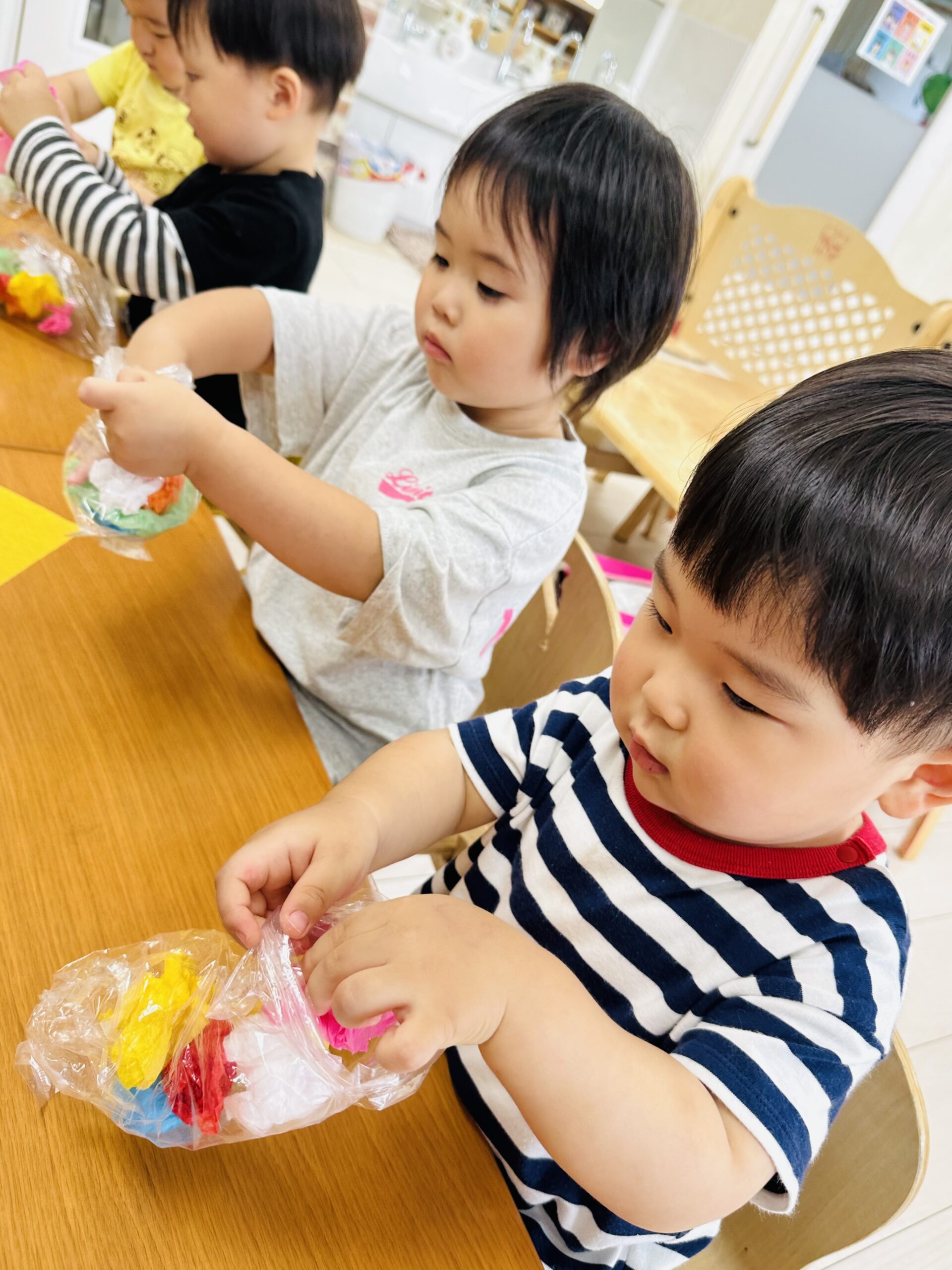 花紙をビニール袋に入れて、可愛いてるてる坊主も作りました☔️