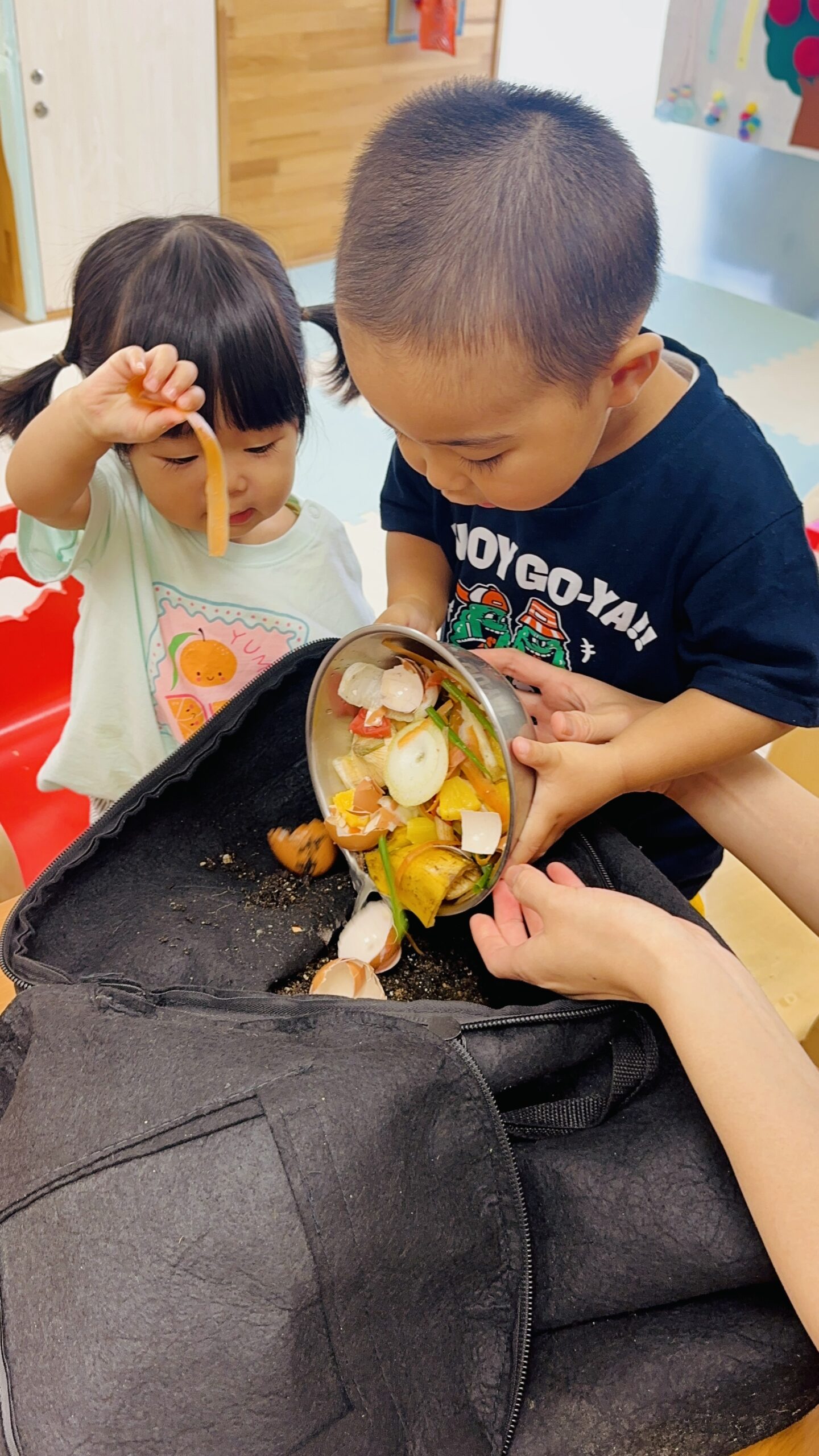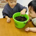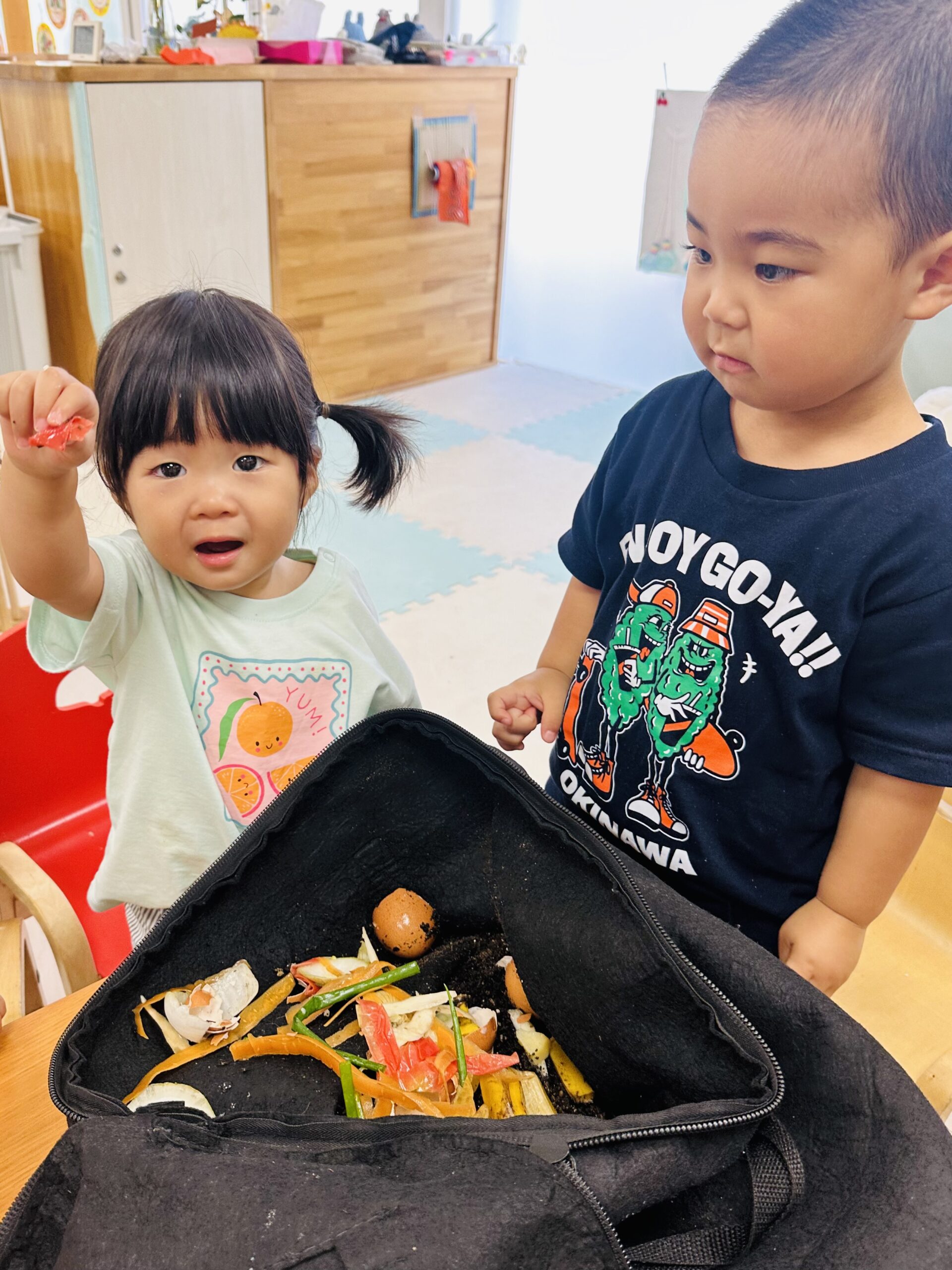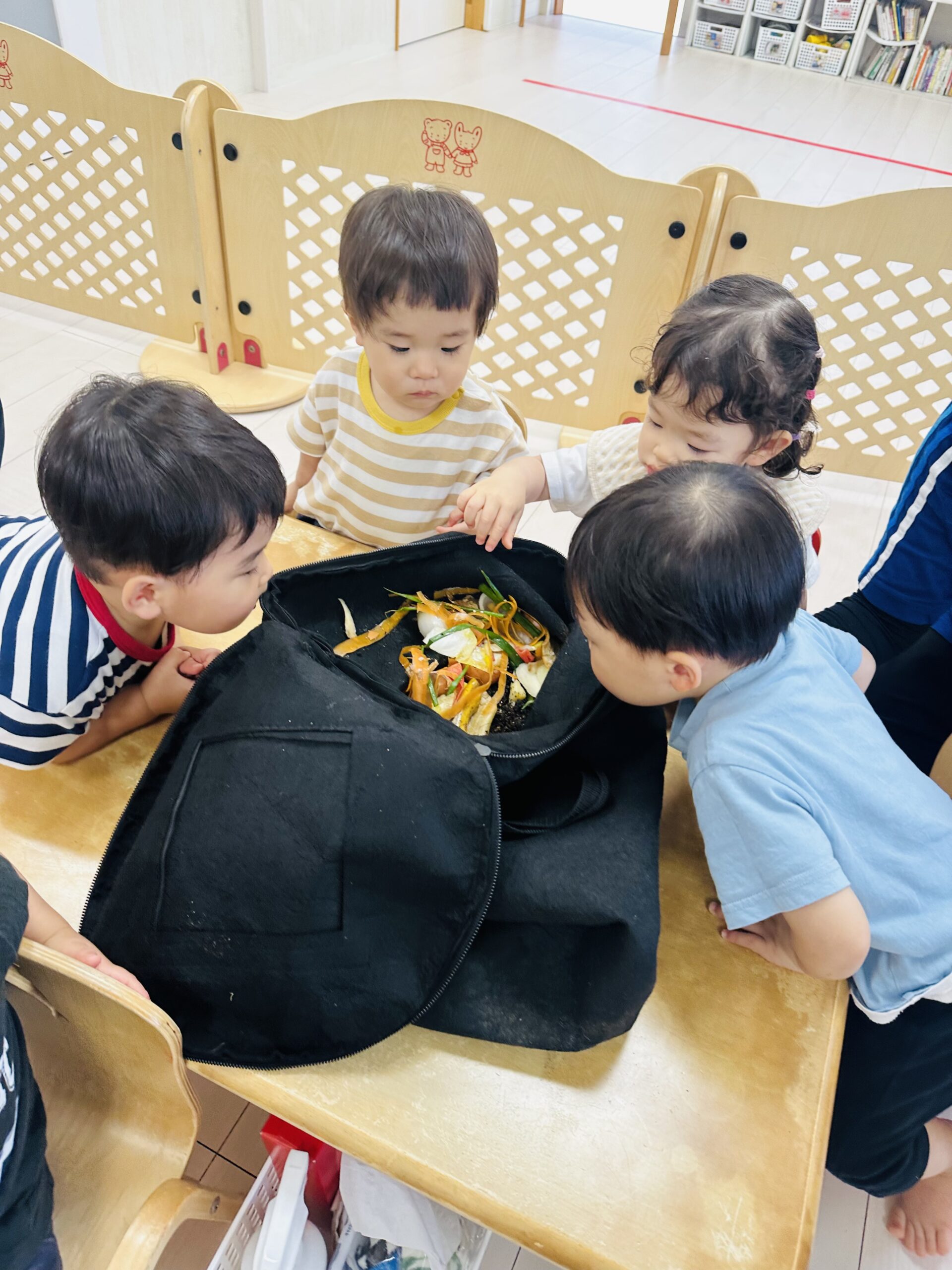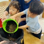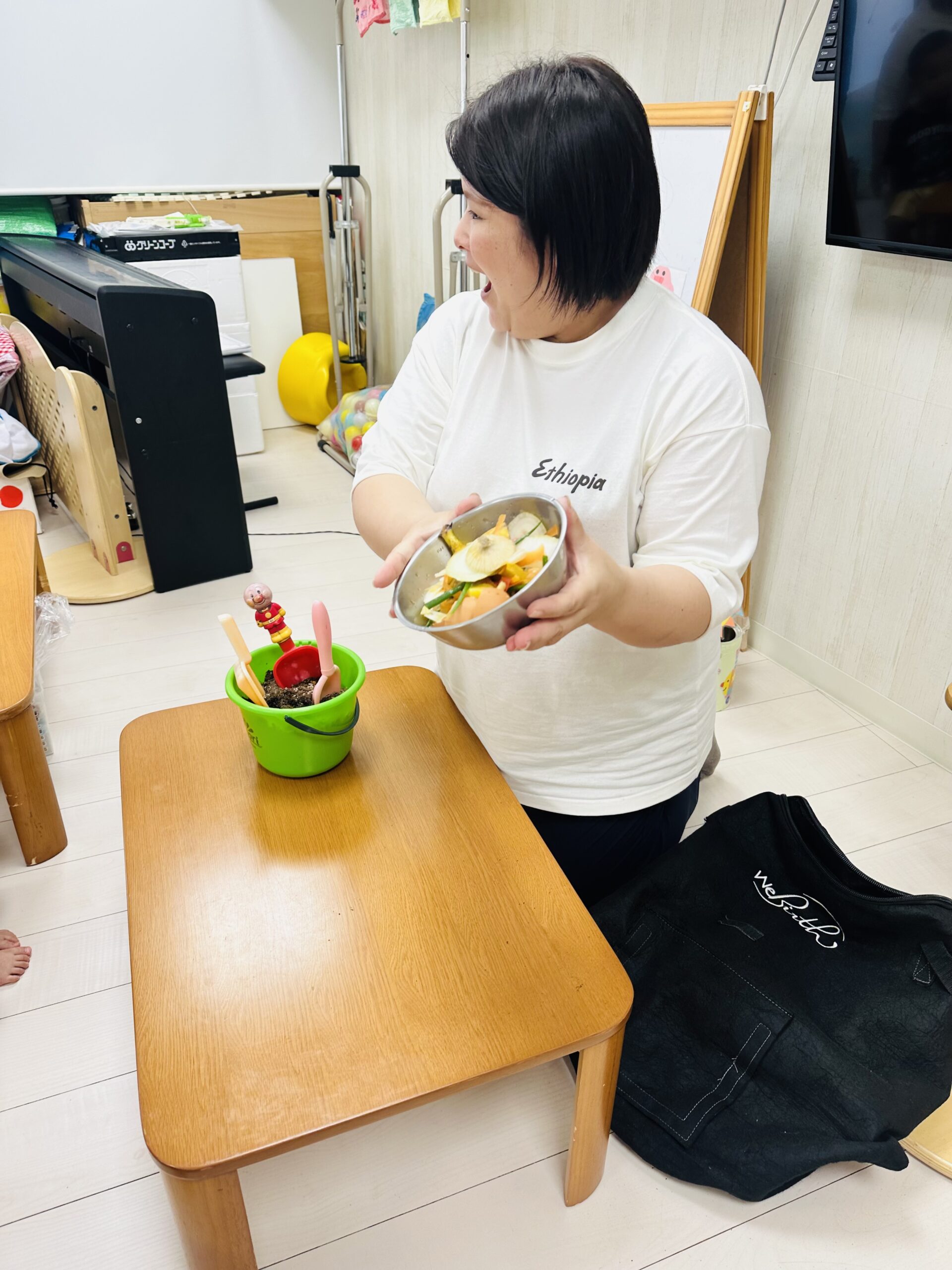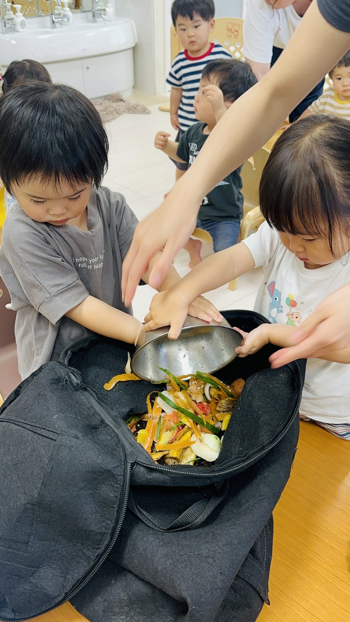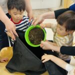 今日から保育園で出た生ゴミをコンポストバックに入れ、土や米ぬかと混ぜ、肥料作りをスタートしました😊