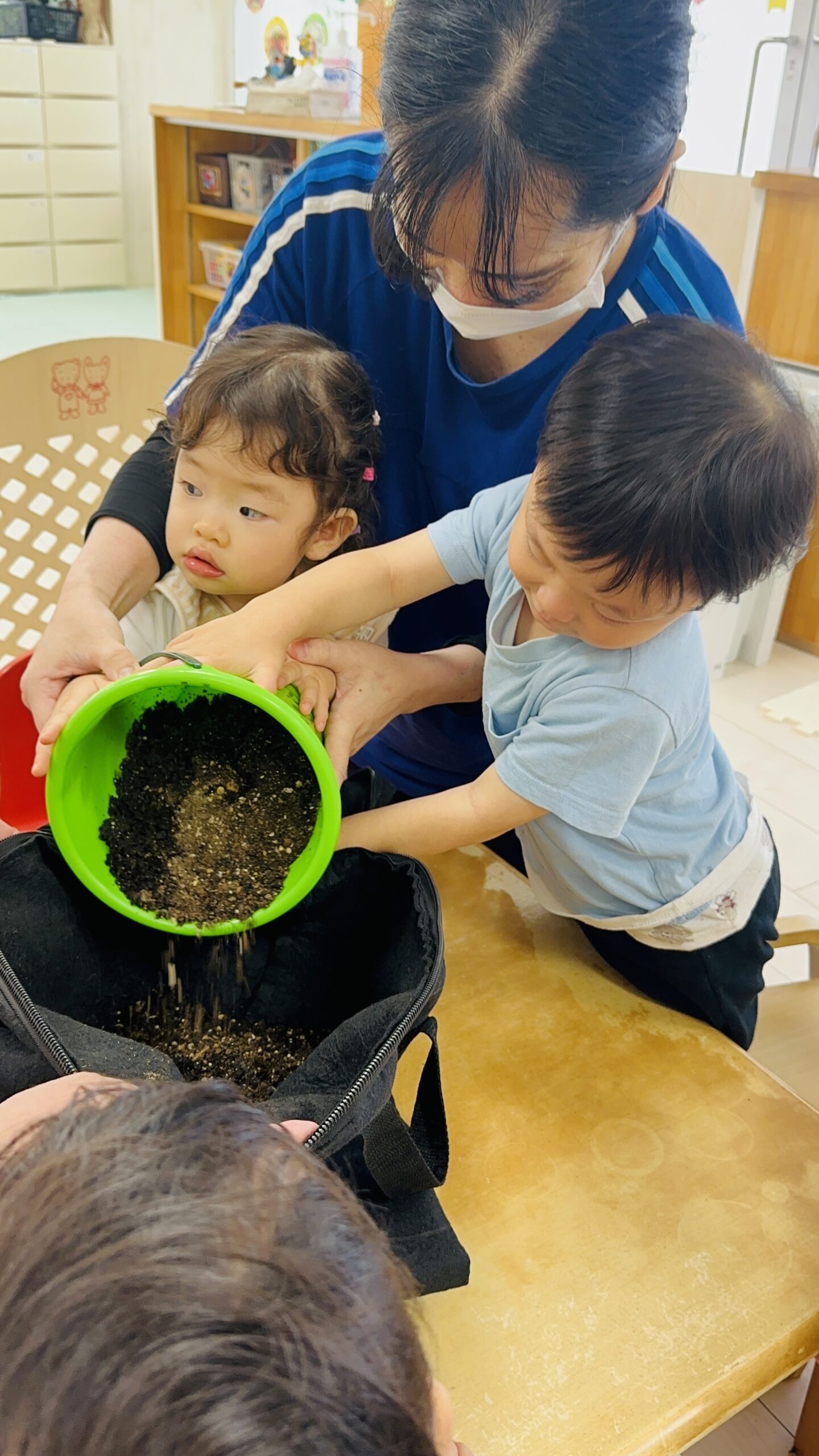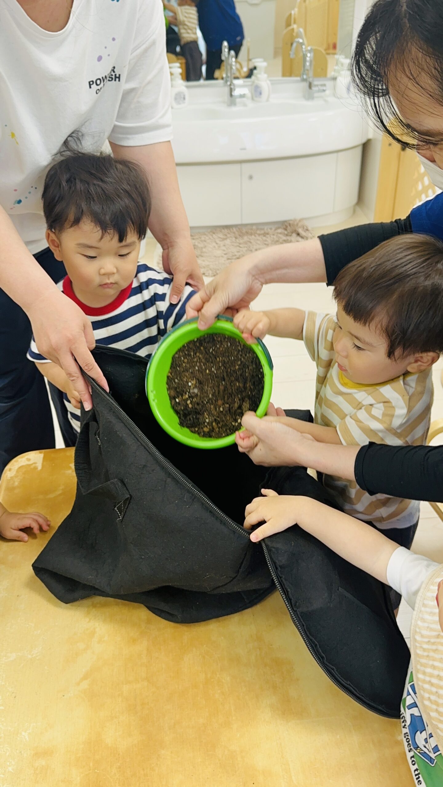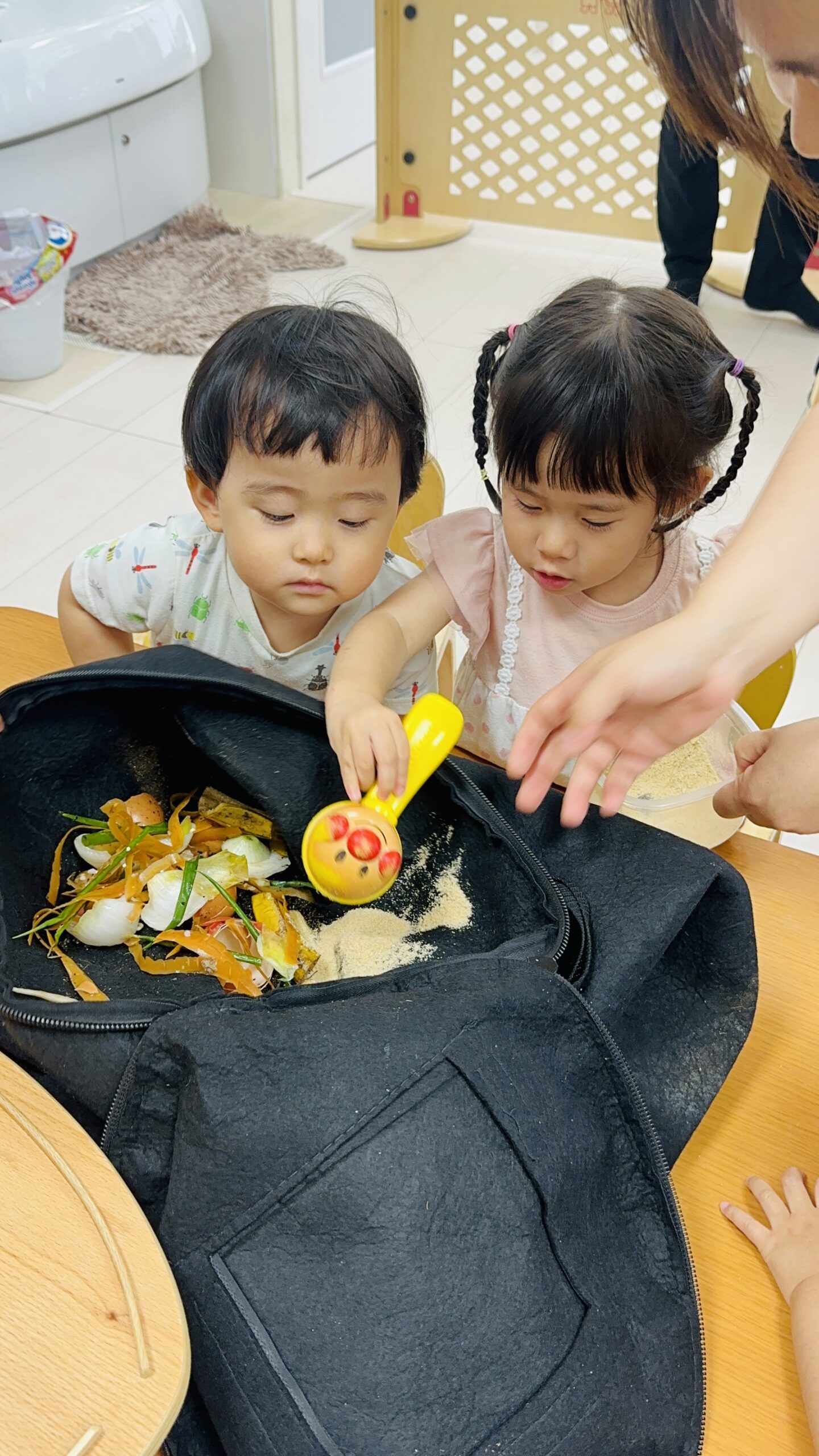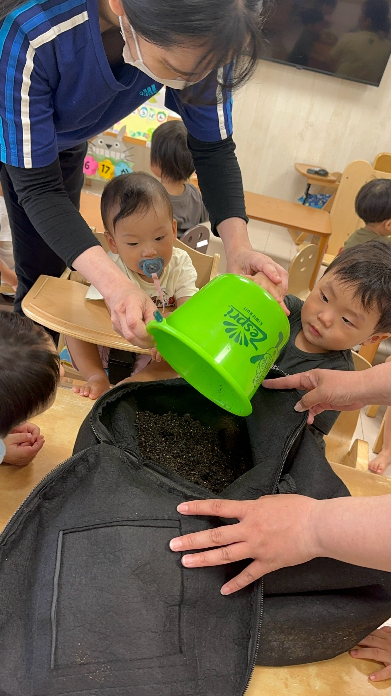 今日から保育園で出た生ゴミをコンポストバックに入れ、土や米ぬかと混ぜ、肥料作りをスタートしました😊