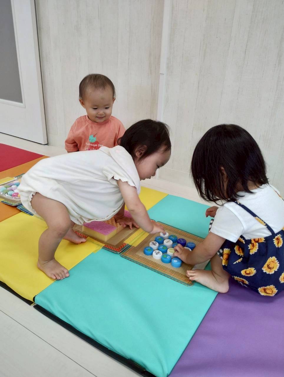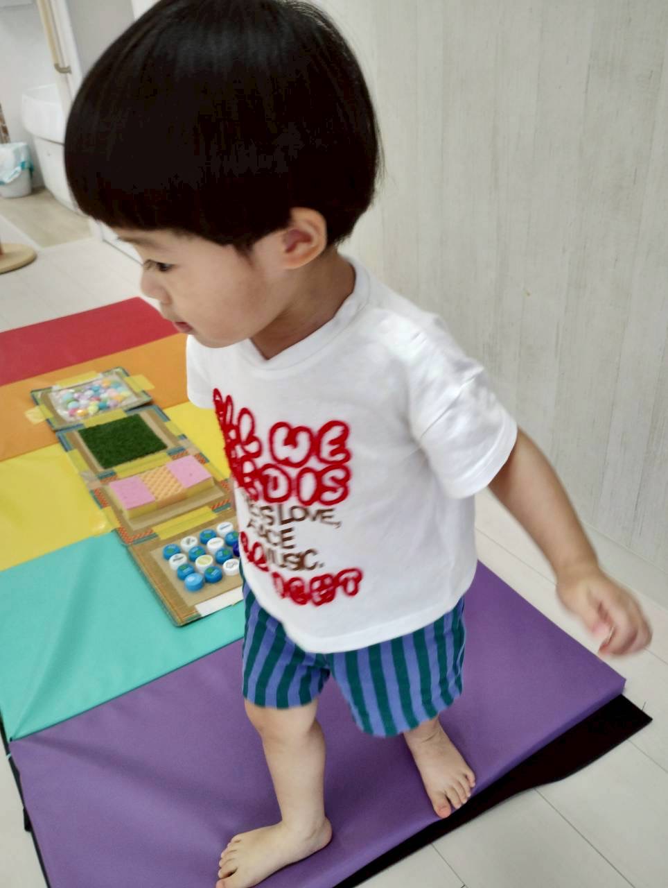 センサリーマットでは、スポンジやペットボトルの蓋を踏んでみたよ🎶